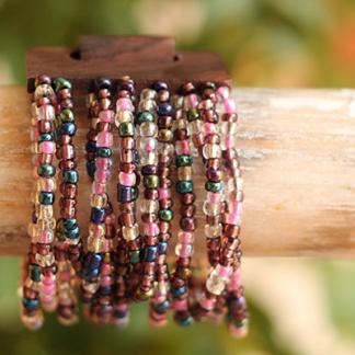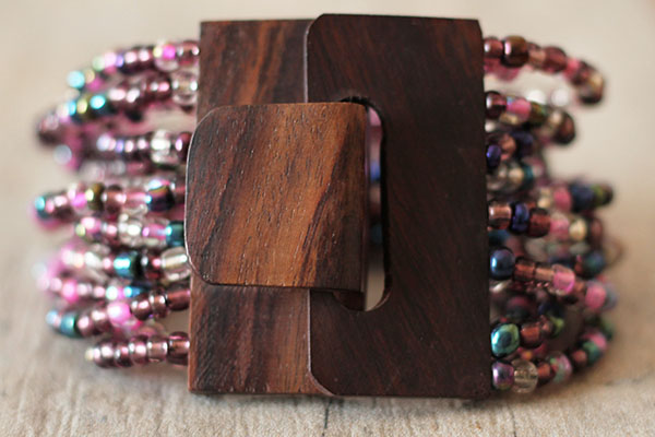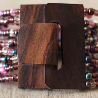 Originální, korálkový náramek se zapínáním na dřevěnou přezku, která je zároveň zajímavým prvkem šperku. Korálky jsou navlečeny na pružných gumičkách.