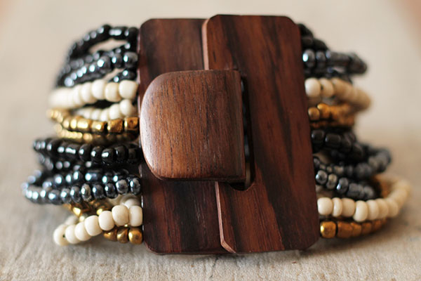 Originální, korálkový náramek se zapínáním na dřevěnou přezku, která je zároveň zajímavým prvkem šperku. Korálky jsou navlečeny na pružných gumičkách.