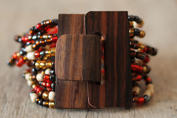 Originální, korálkový náramek se zapínáním na dřevěnou přezku, která je zároveň zajímavým prvkem šperku. Korálky jsou navlečeny na pružných gumičkách.