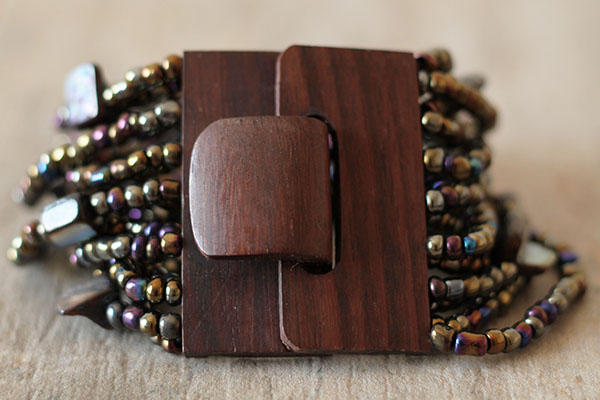 Originální, korálkový náramek se zapínáním na dřevěnou přezku, která je zároveň zajímavým prvkem šperku. Korálky jsou navlečeny na pružných gumičkách.