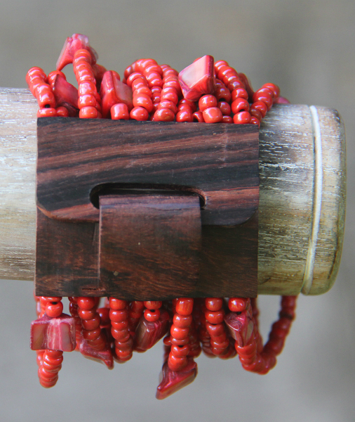 Originální, korálkový náramek se zapínáním na dřevěnou přezku, která je zároveň zajímavým prvkem šperku. Korálky jsou navlečeny na pružných gumičkách.