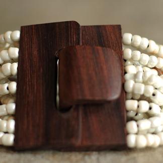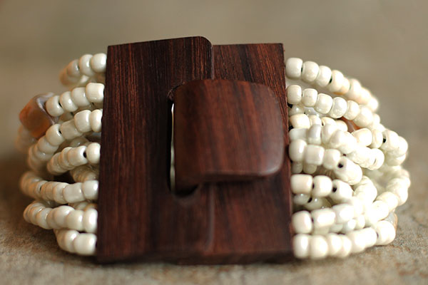 Originální, korálkový náramek se zapínáním na dřevěnou přezku, která je zároveň zajímavým prvkem šperku. Korálky jsou navlečeny na pružných gumičkách.