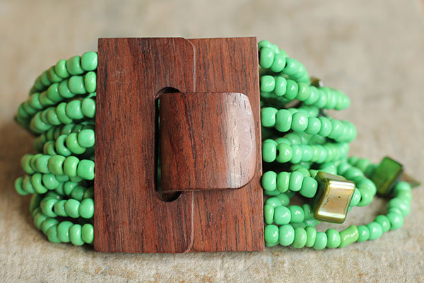 Originální, korálkový náramek se zapínáním na dřevěnou přezku, která je zároveň zajímavým prvkem šperku. Korálky jsou navlečeny na pružných gumičkách.