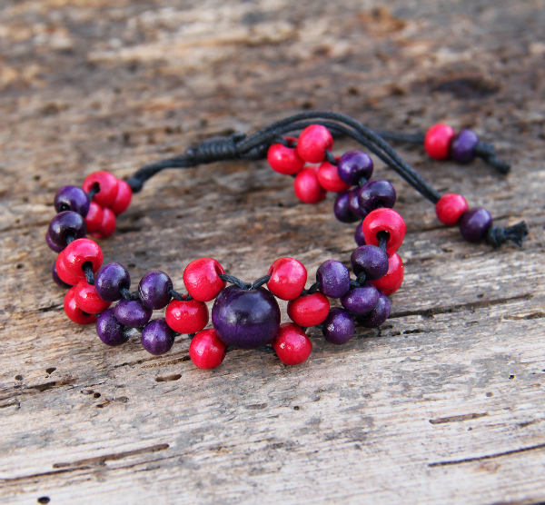 Náramek s barevnými dřevěnými korálky. Pro libovolný objem zápěstí. Velikost se nastaví pomocí jezdícího uzlíku.