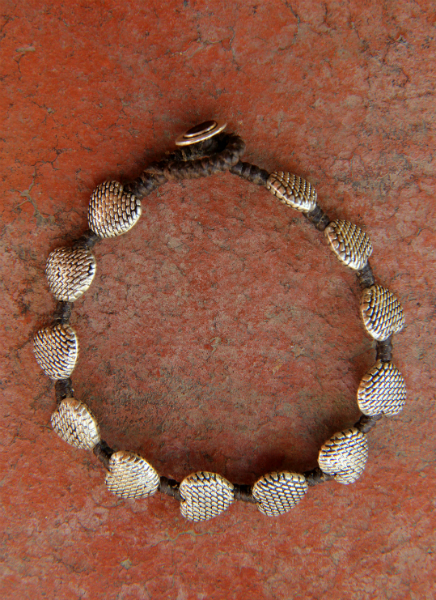 Originální náramek v jednoduchém provedení. Pro obvod zápěstí 17-18,5 cm. Zapínání na knoflíček a poutko. Kovové korálky (barva: stříbrná patina) jsou navlečeny na povoskované šňůrce.