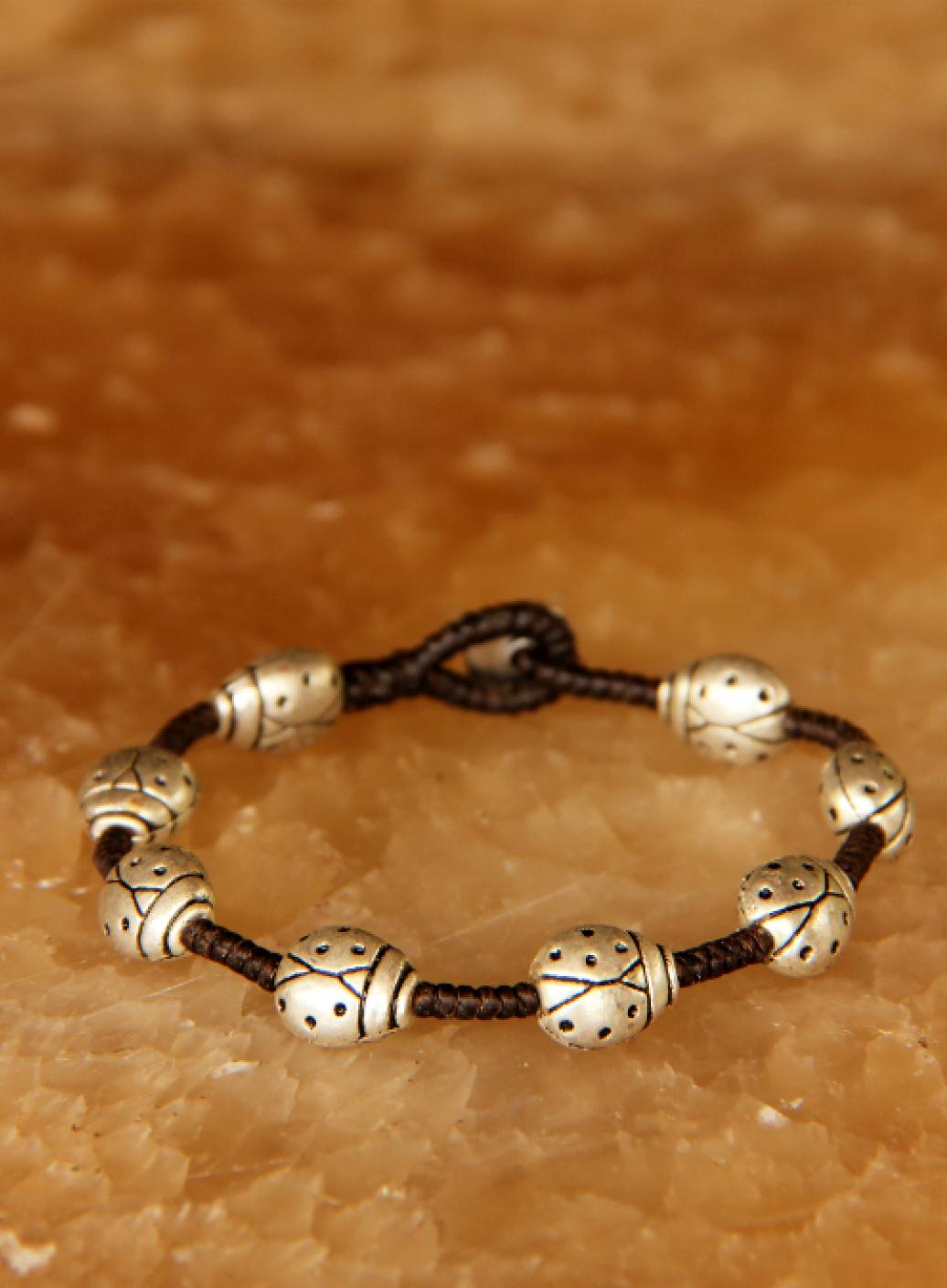 Originální náramek v jednoduchém provedení. Pro obvod zápěstí 17-18,5 cm. Zapínání na knoflíček a poutko. Kovové korálky (barva: stříbrná patina) jsou navlečeny na povoskované šňůrce.