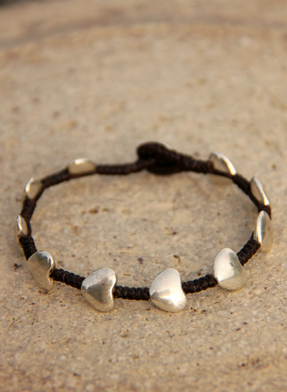 Originální náramek v jednoduchém provedení. Pro obvod zápěstí 17-18,5 cm. Zapínání na knoflíček a poutko. Kovové korálky (barva: stříbrná patina) jsou navlečeny na povoskované šňůrce.