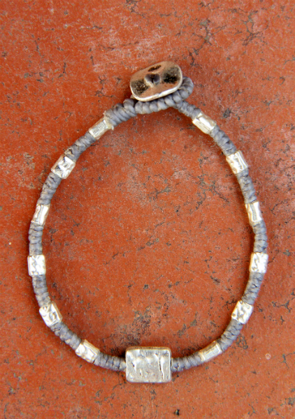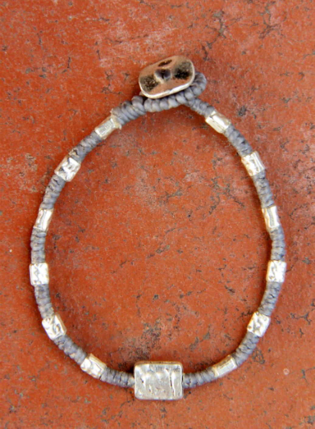 Originální náramek v jednoduchém provedení. Pro obvod zápěstí 17-18,5 cm. Zapínání na knoflíček a poutko. Kovové korálky (barva: stříbrná patina) jsou navlečeny na povoskované šňůrce.