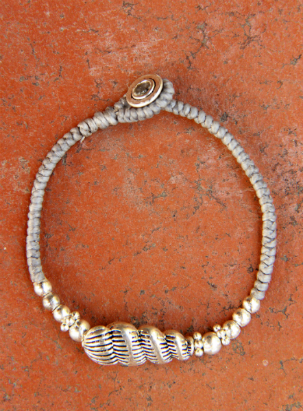 Originální náramek v jednoduchém provedení. Pro obvod zápěstí 17-18,5 cm. Zapínání na knoflíček a poutko. Kovové korálky (barva: stříbrná patina) jsou navlečeny na povoskované šňůrce.