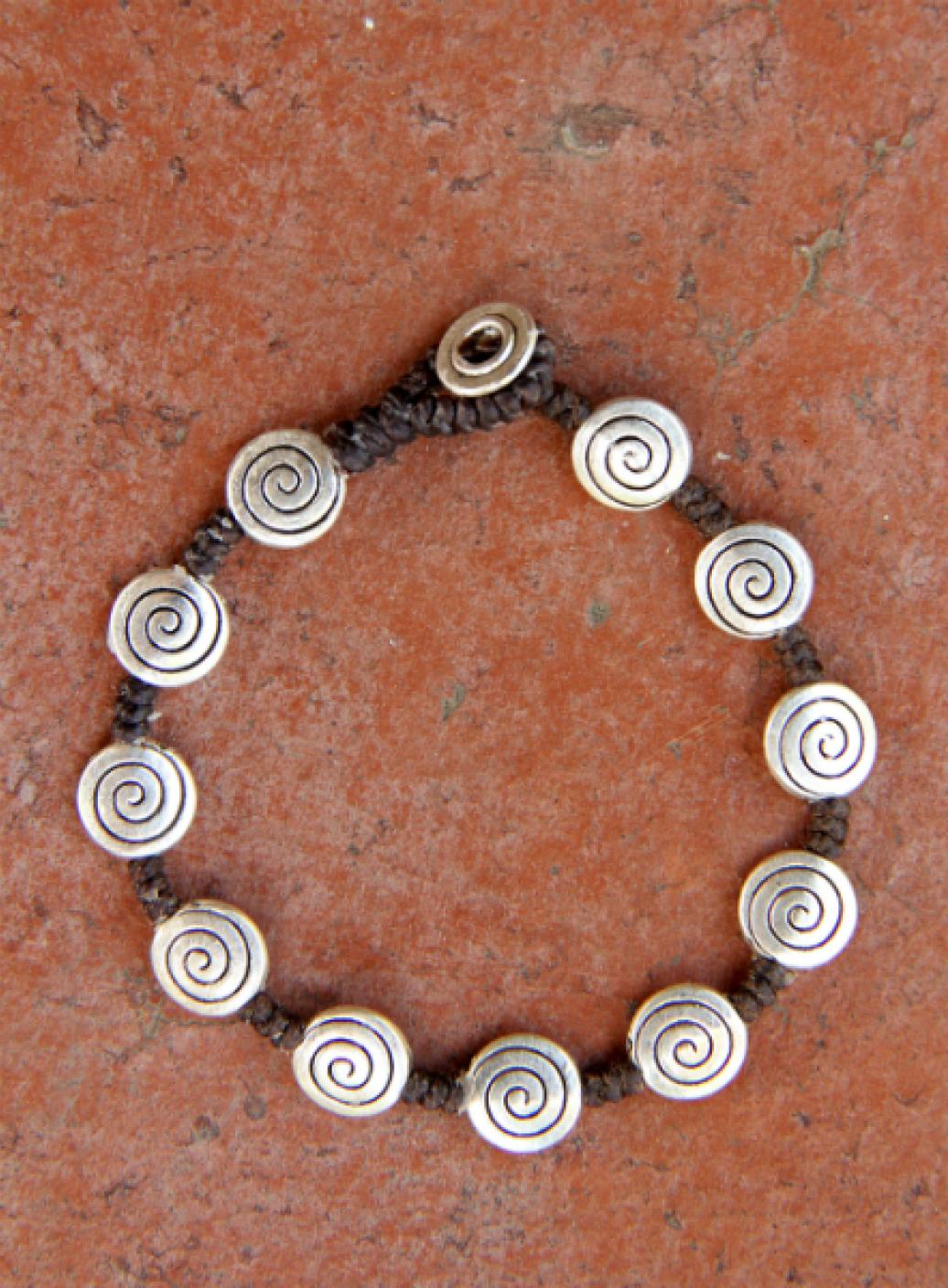 Originální náramek v jednoduchém provedení. Pro obvod zápěstí 17-18,5 cm. Zapínání na knoflíček a poutko. Kovové korálky (barva: stříbrná patina) jsou navlečeny na povoskované šňůrce.