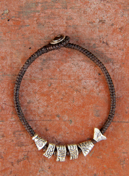 Originální náramek v jednoduchém provedení. Pro obvod zápěstí 17-18,5 cm. Zapínání na knoflíček a poutko. Kovové korálky (barva: stříbrná patina) jsou navlečeny na povoskované šňůrce.