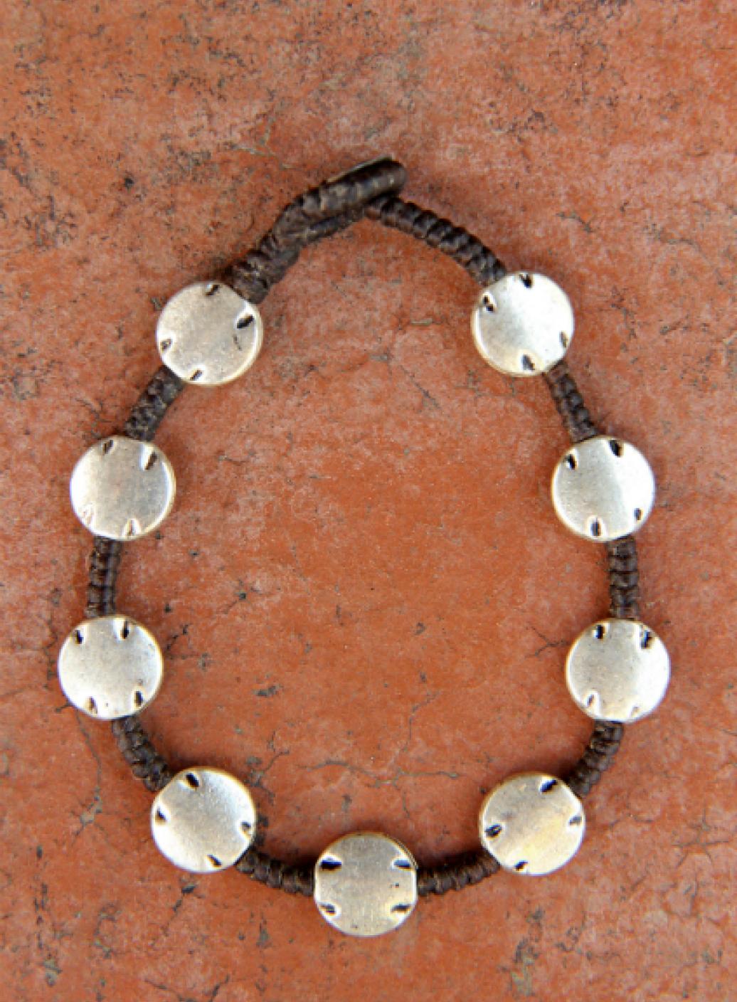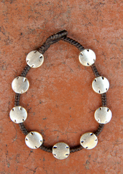 Originální náramek v jednoduchém provedení. Pro obvod zápěstí 17-18,5 cm. Zapínání na knoflíček a poutko. Kovové korálky (barva: stříbrná patina) jsou navlečeny na povoskované šňůrce.