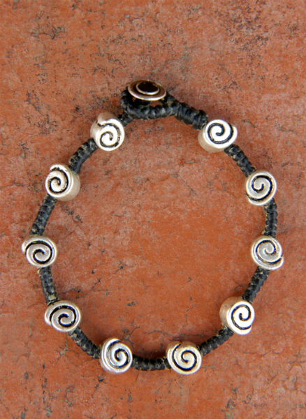 Originální náramek v jednoduchém provedení. Pro obvod zápěstí 17-18,5 cm. Zapínání na knoflíček a poutko. Kovové korálky (barva: stříbrná patina) jsou navlečeny na povoskované šňůrce.