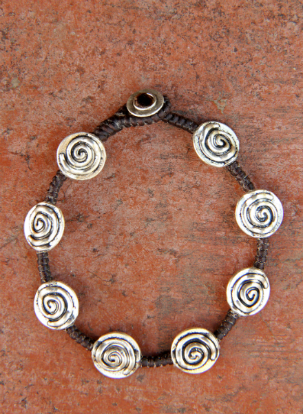 Originální náramek v jednoduchém provedení. Pro obvod zápěstí 17-18,5 cm. Zapínání na knoflíček a poutko. Kovové korálky (barva: stříbrná patina) jsou navlečeny na povoskované šňůrce.