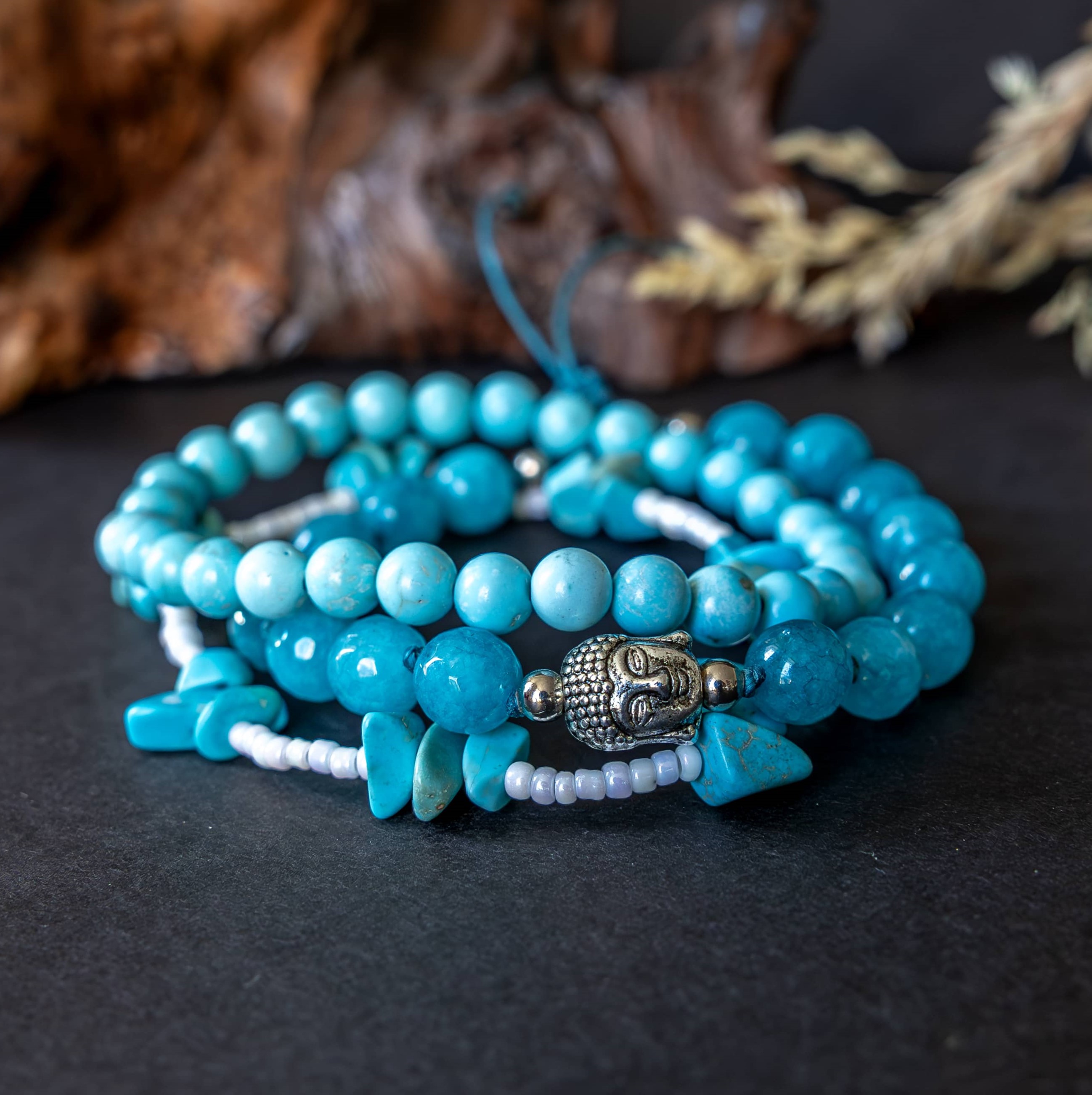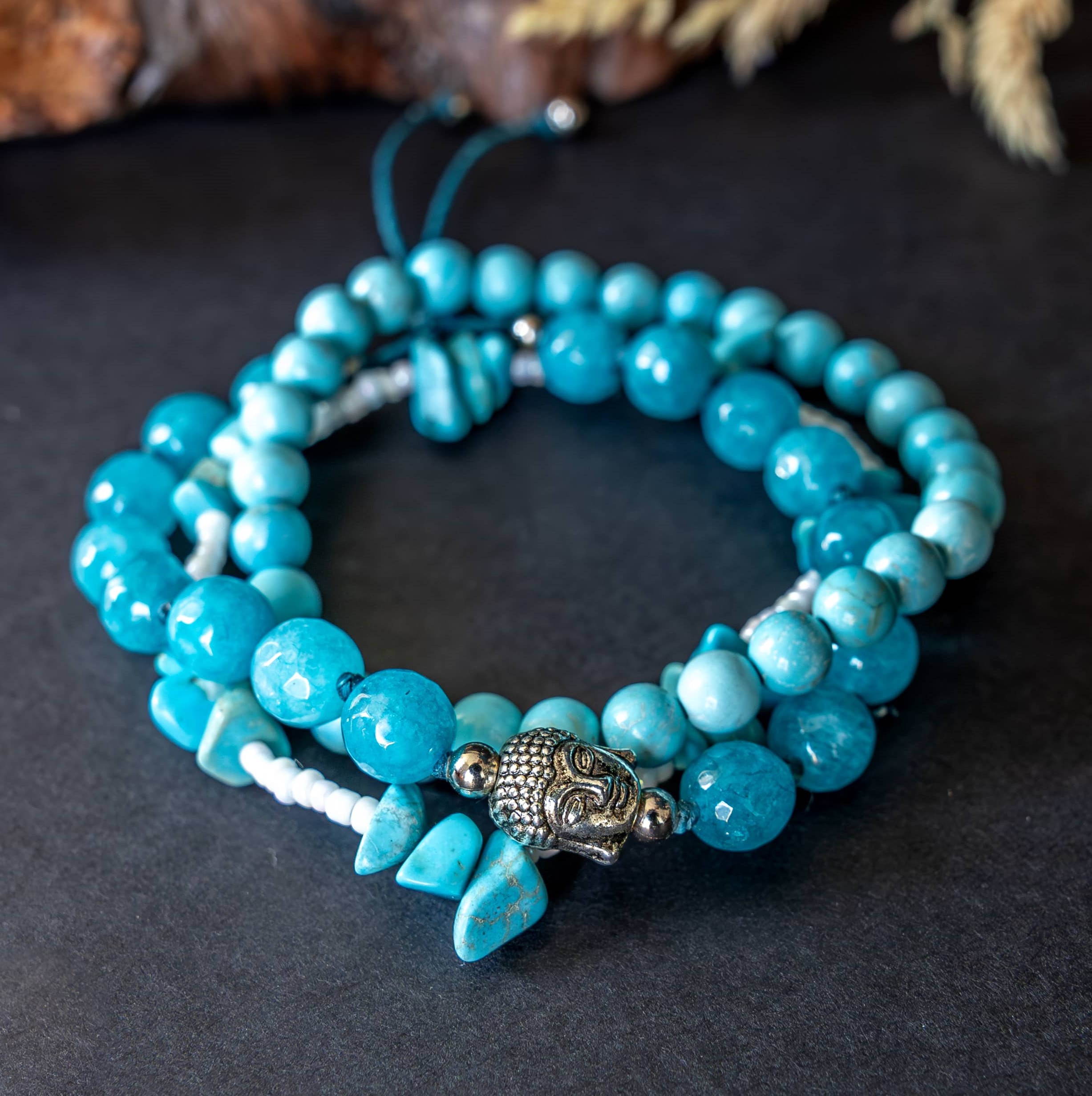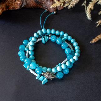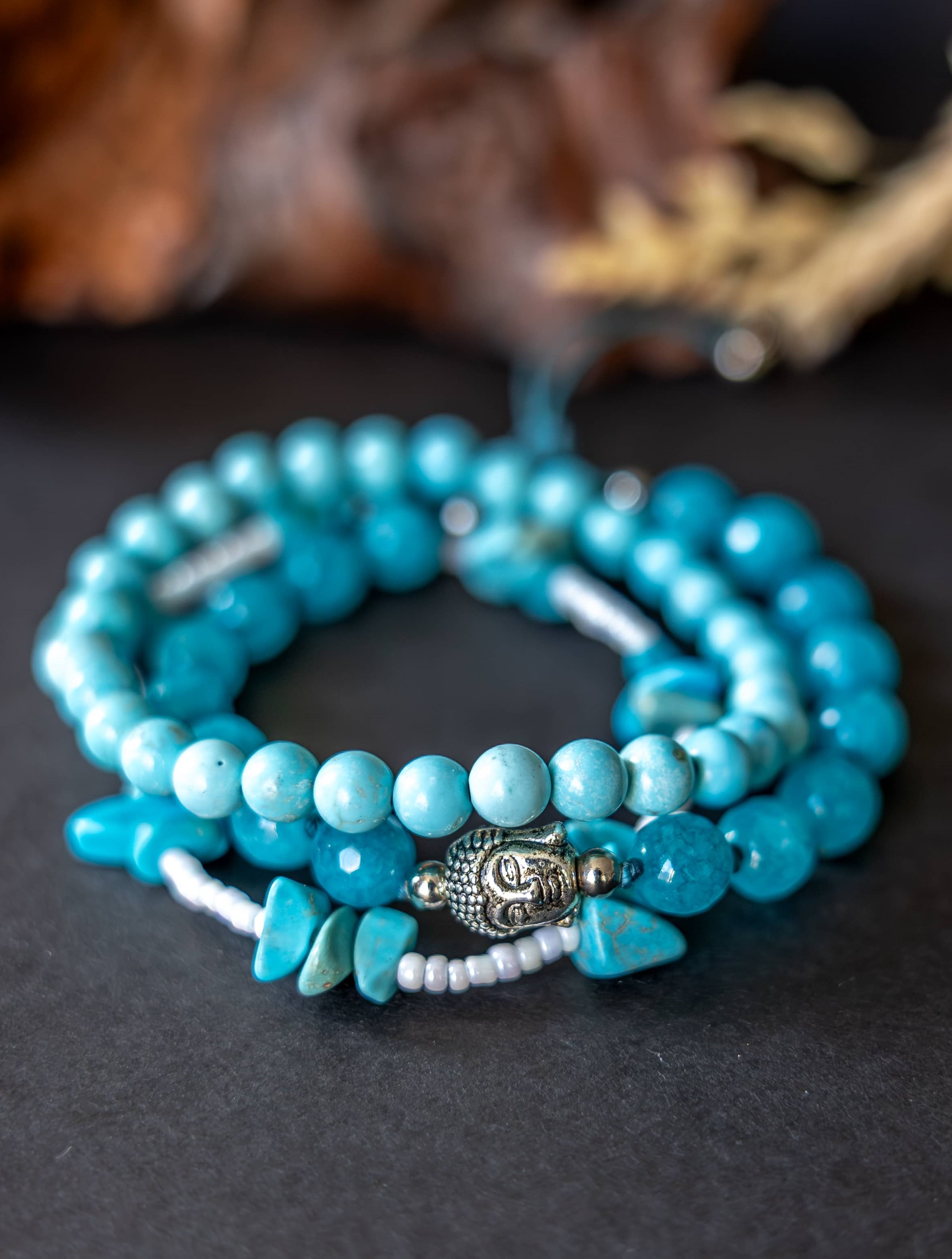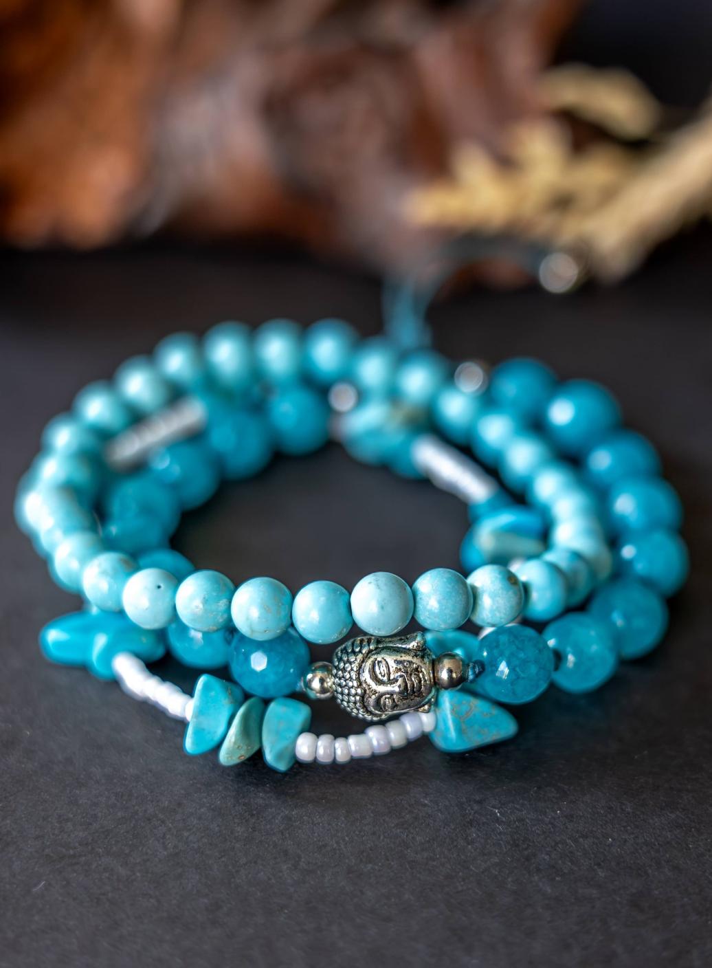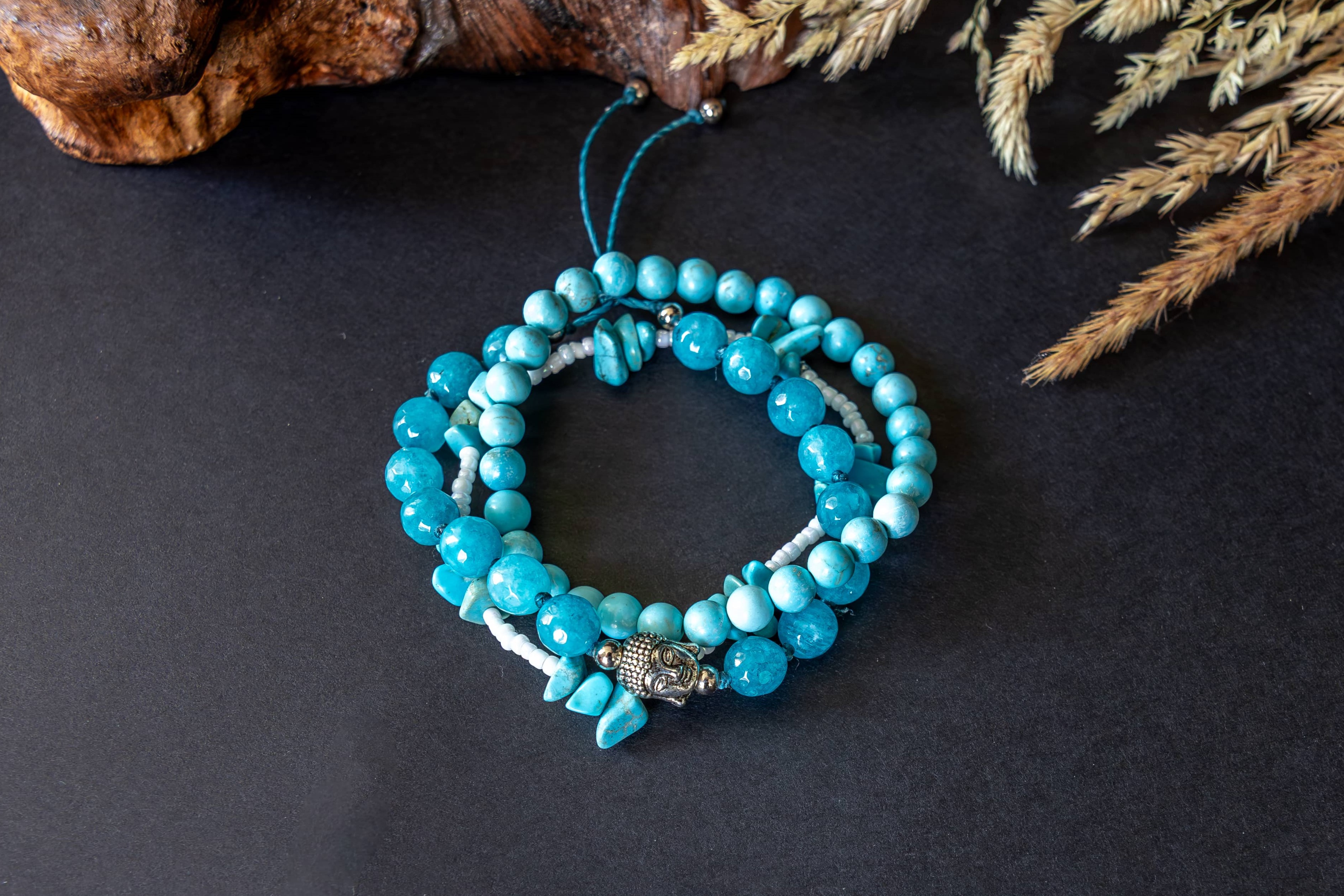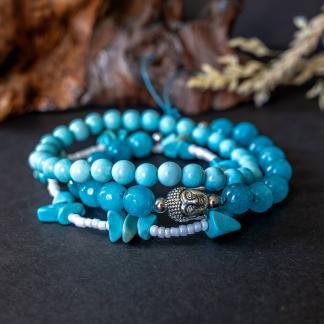 Jeden náramek je tvořen bílými korálky doplněnými tyrkysovými úlomky. Druhý náramek je z modrého achátu a bižuterního korálky buddhovy hlavy a třetí z tyrkysových korálků.