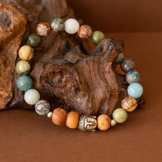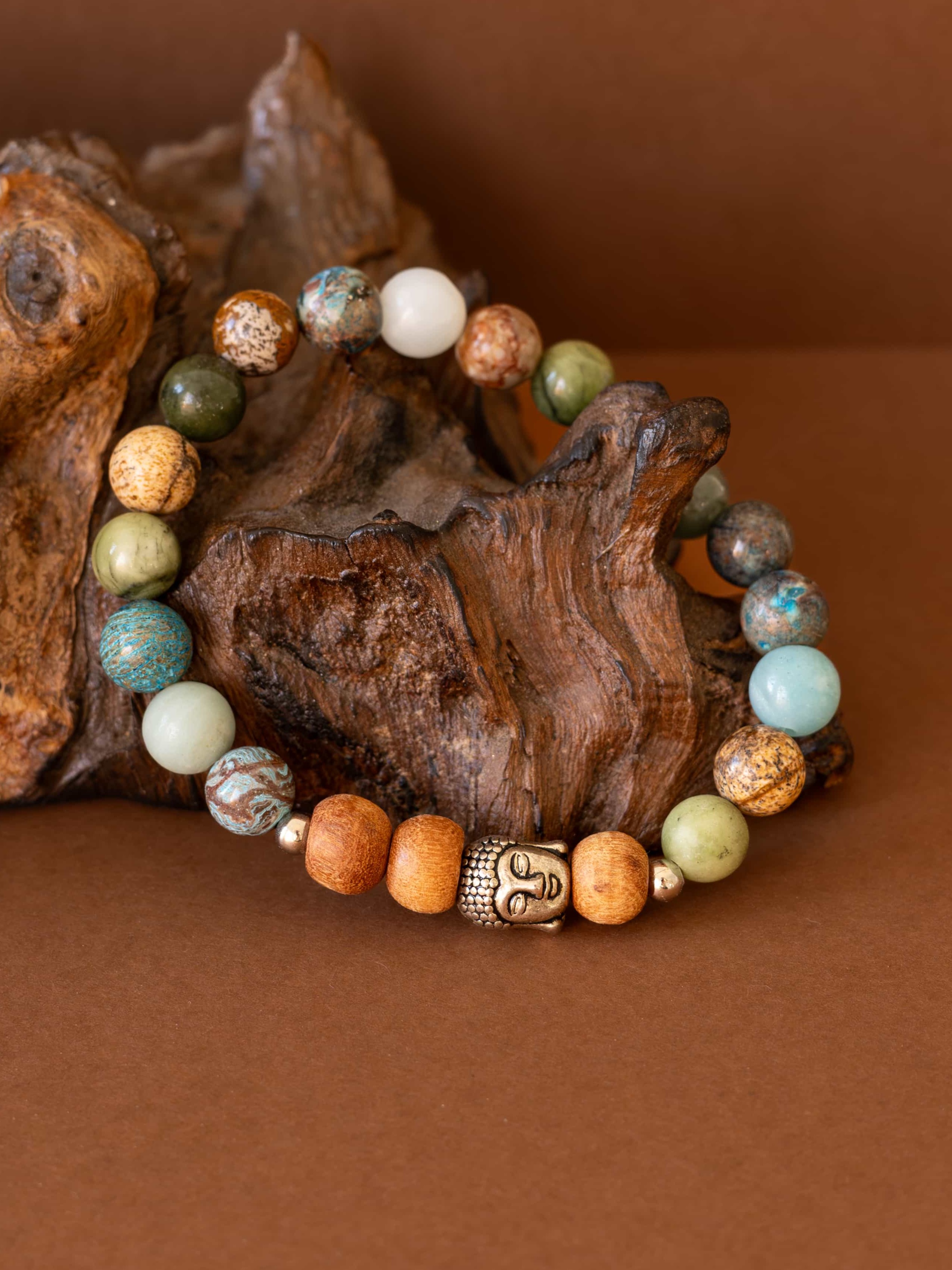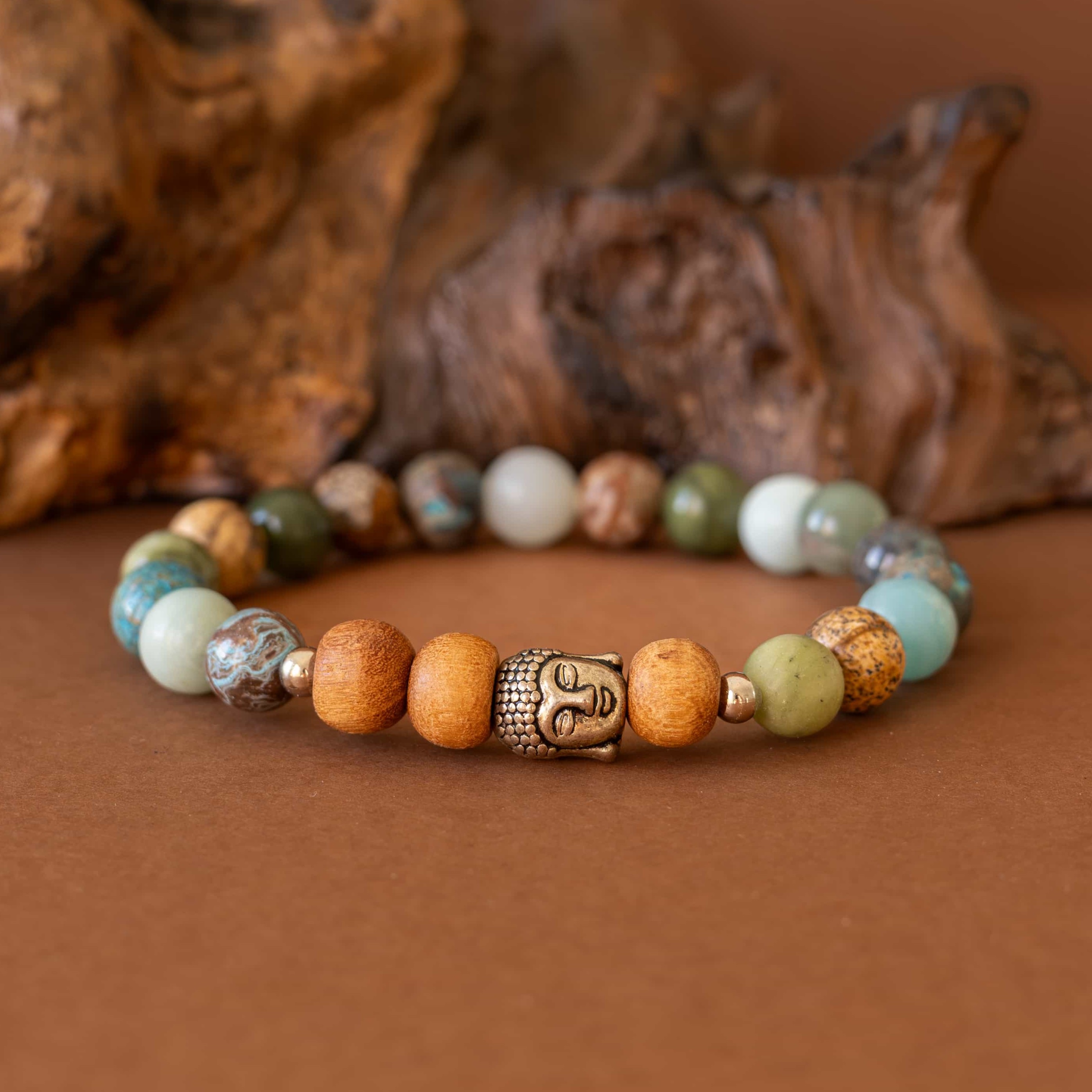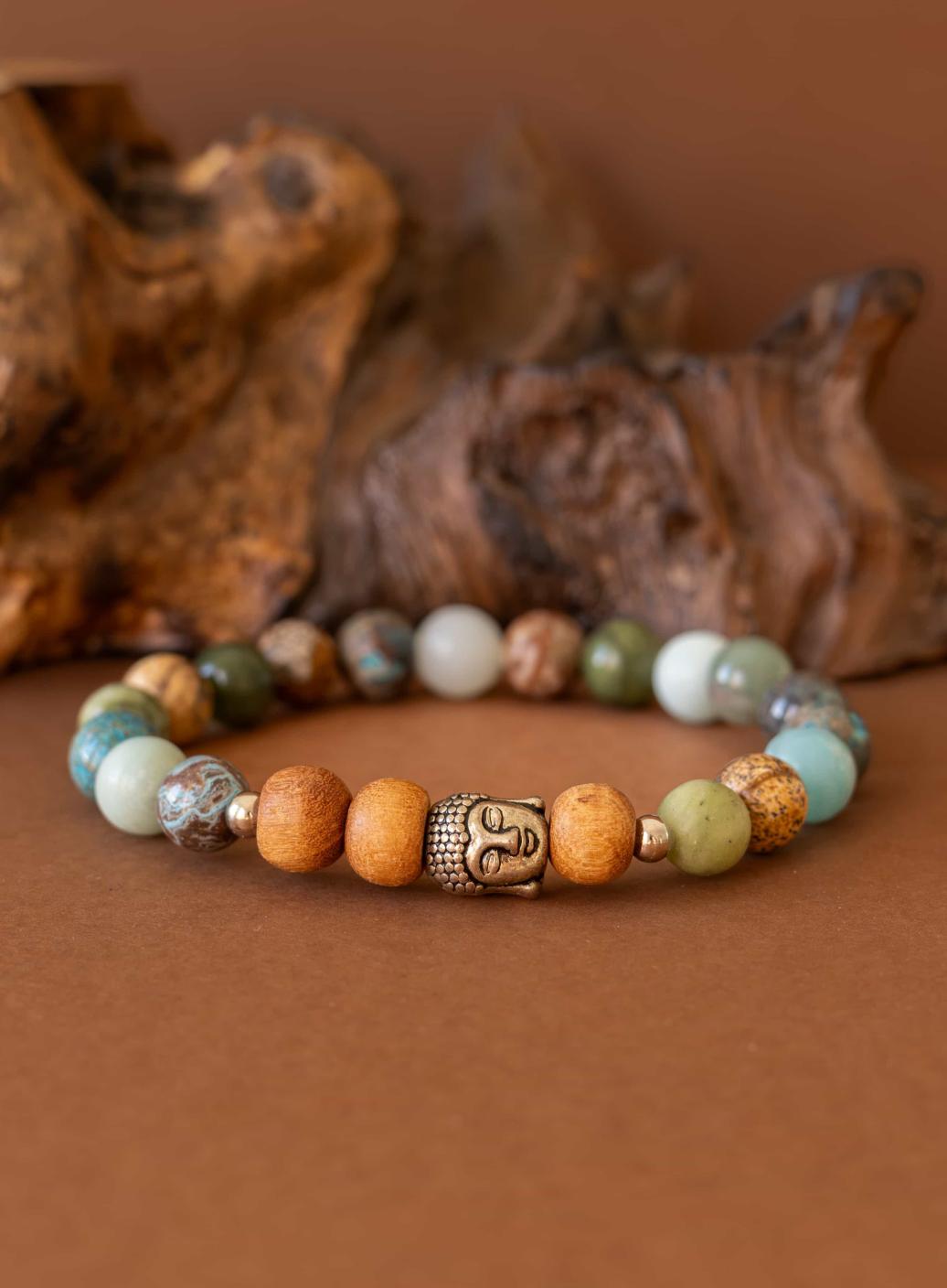 Karma – náramek se santalovým dřevem, jaspisem, tyrkysem, achátem a korálkem Buddhovy hlavy