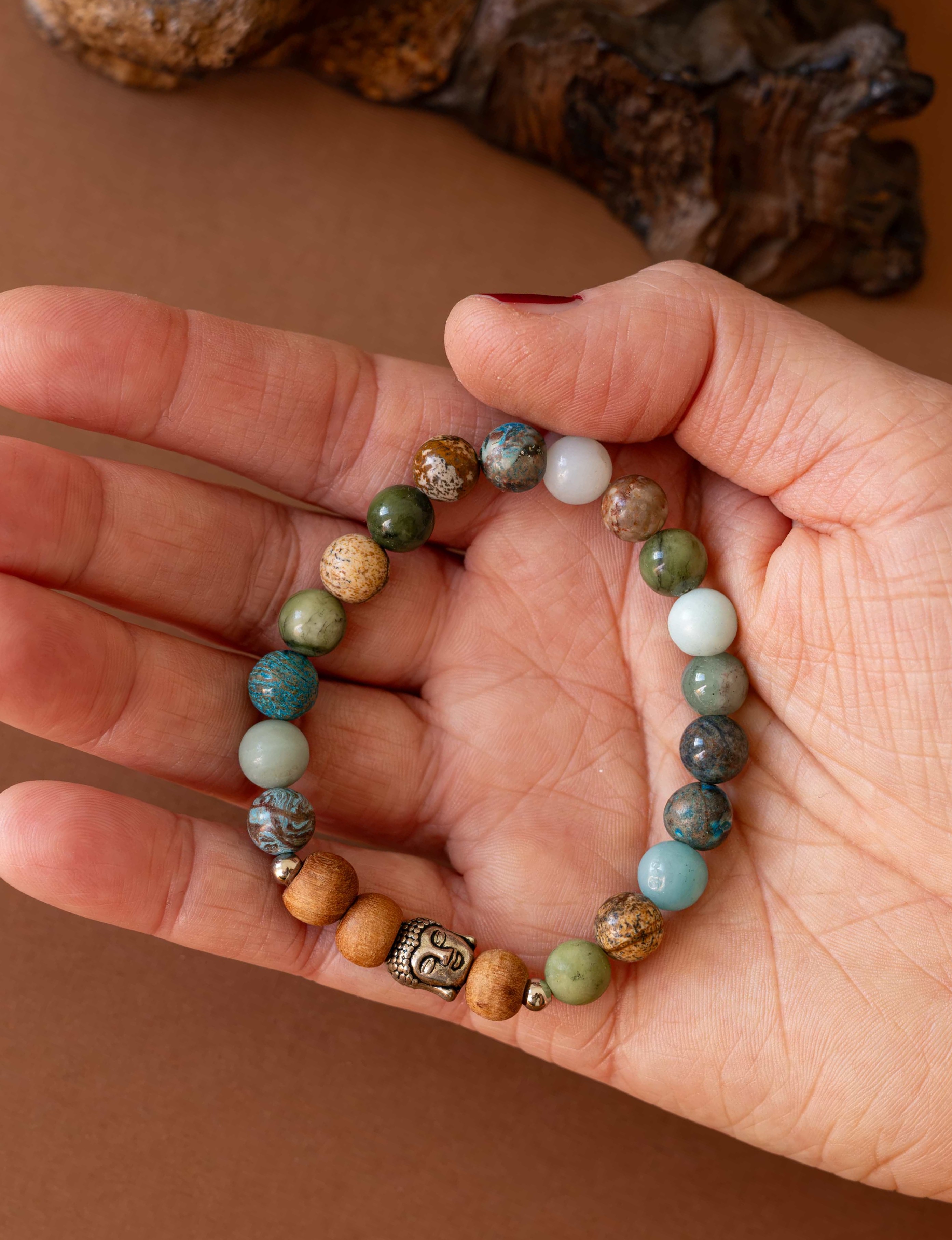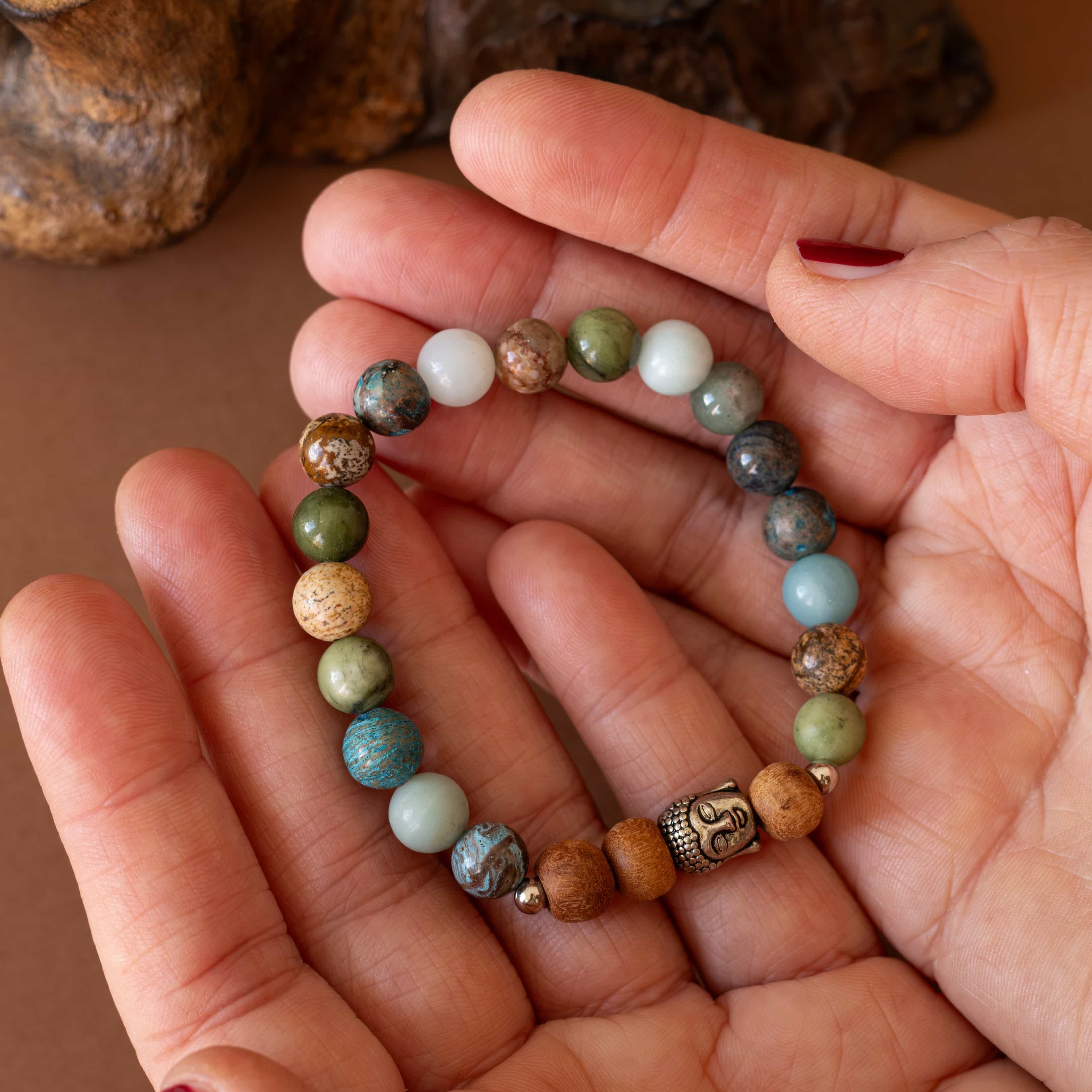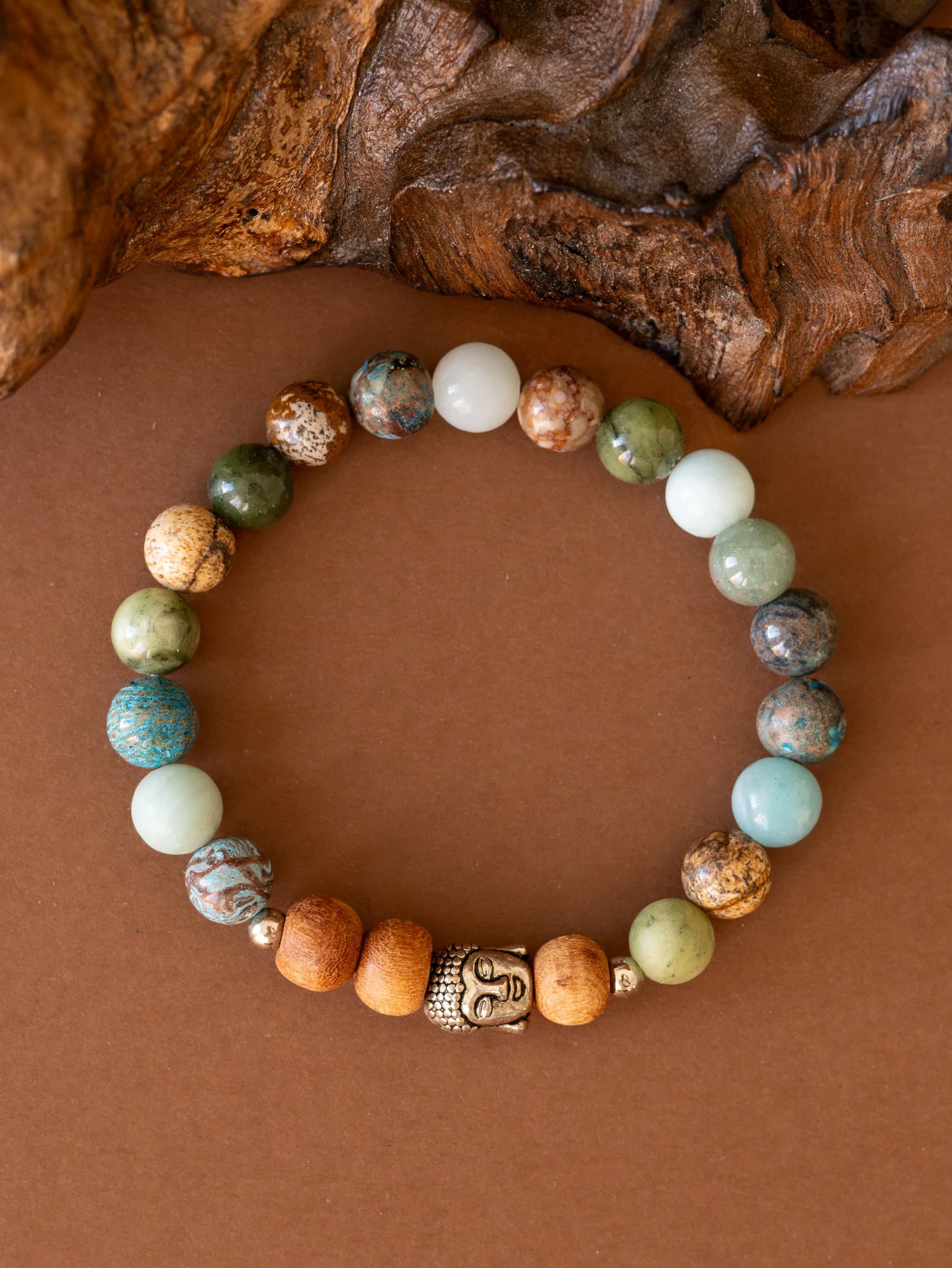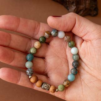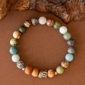 Karma – náramek se santalovým dřevem, jaspisem, tyrkysem, achátem a korálkem Buddhovy hlavy