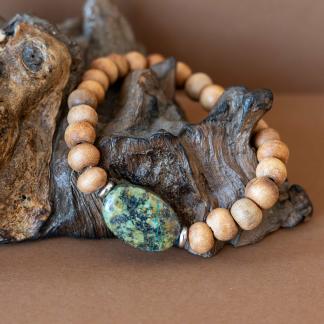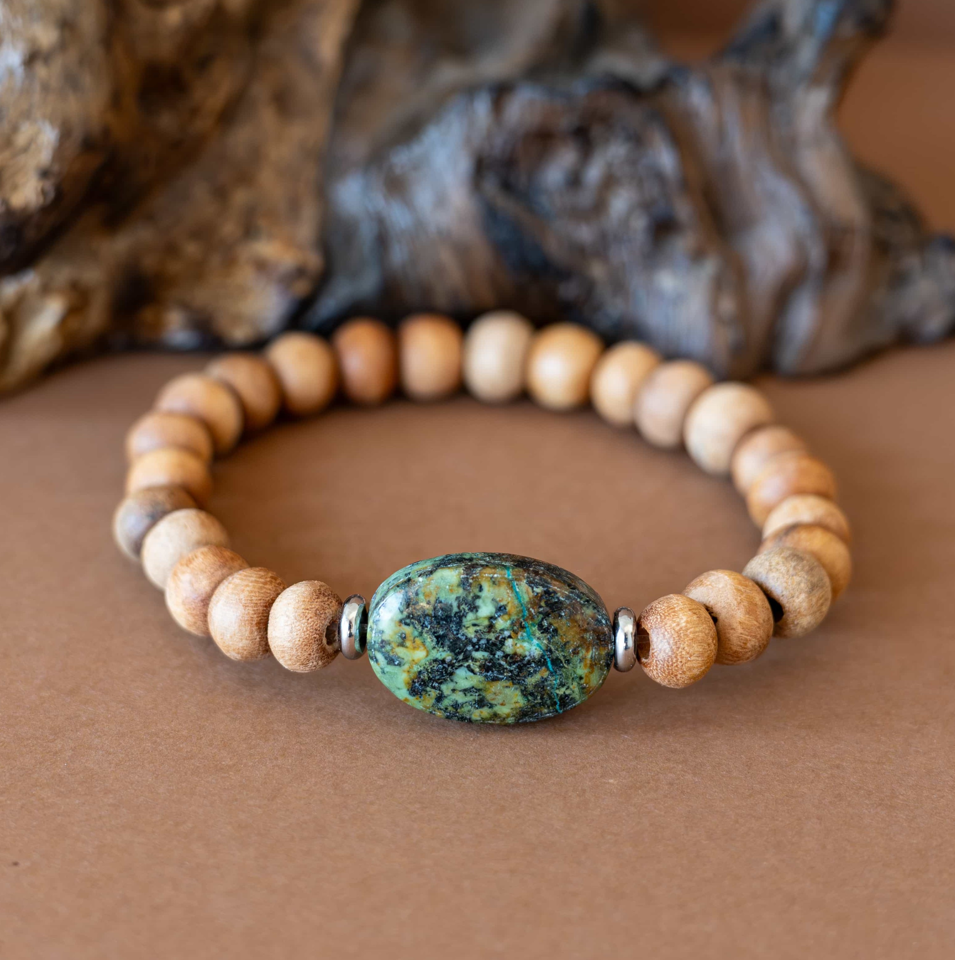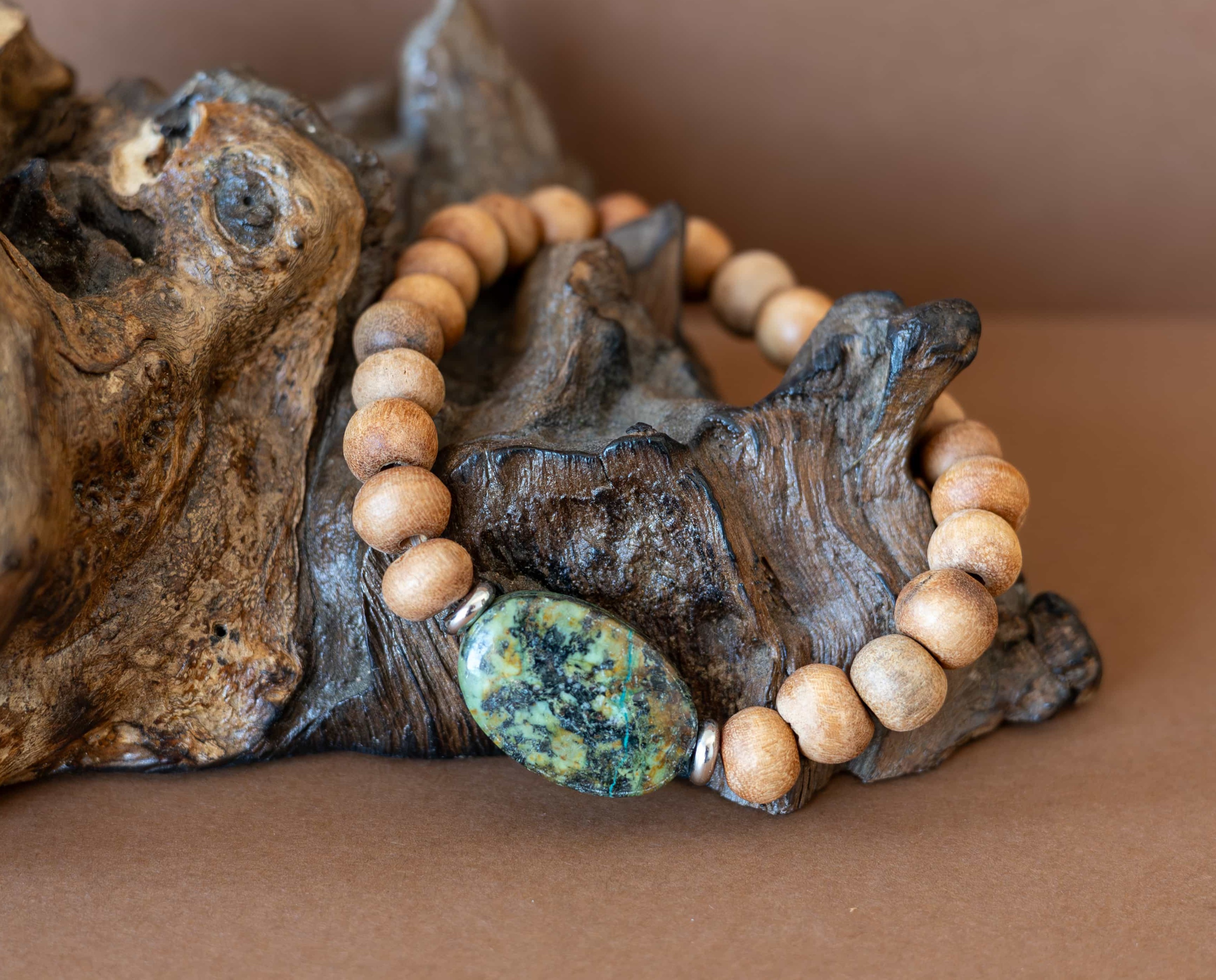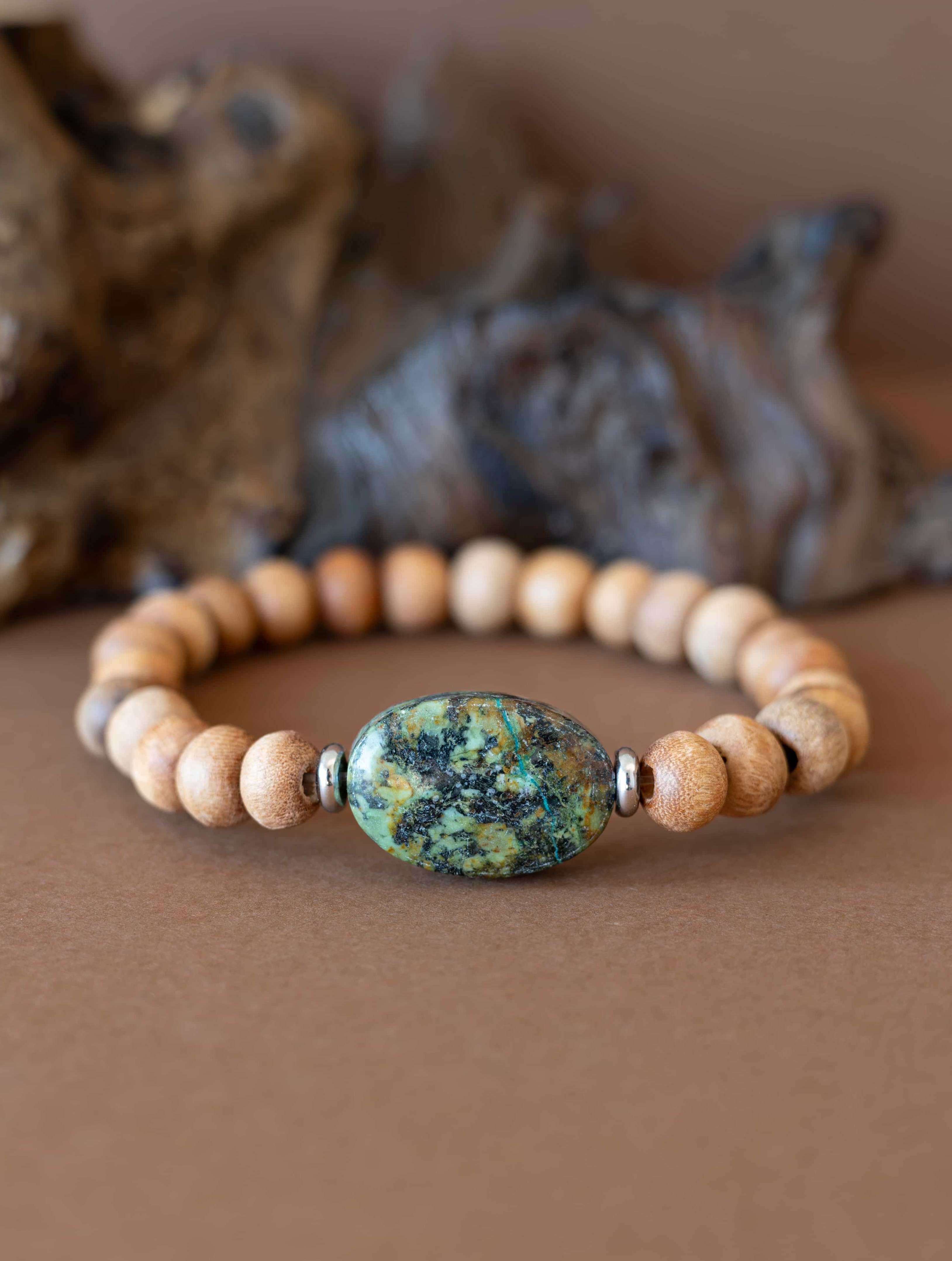 Náramek Důvěra je spojením tyrkysu, kamene ochrany a pravdy, a santalového dřeva, které přináší klid a harmonii. Jeho dominantou je velký valounek tyrkysu, který dodává náramku jedinečný charakter a připomíná sílu přirozeného bytí.