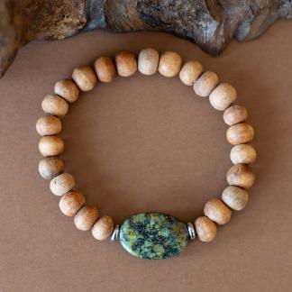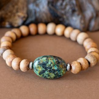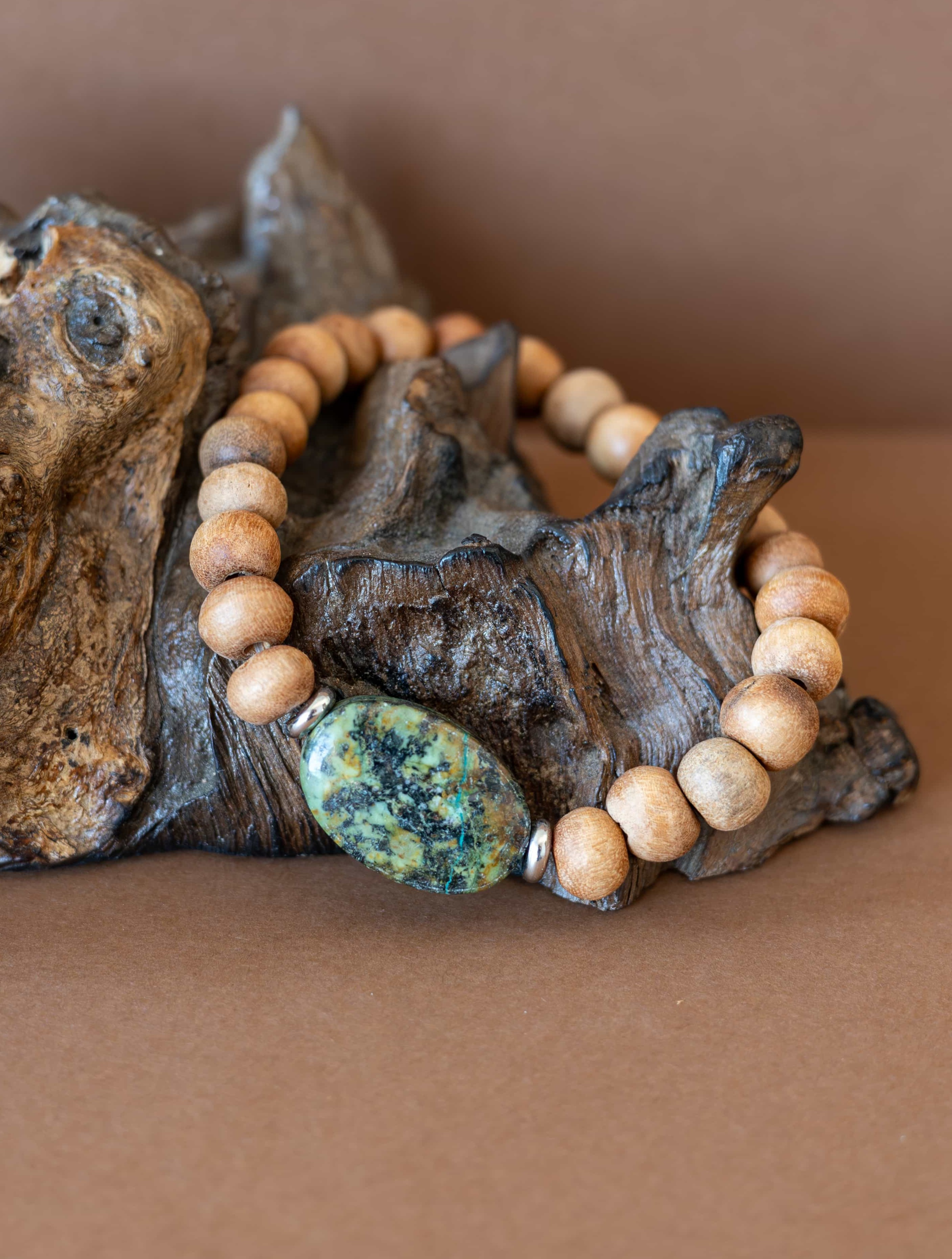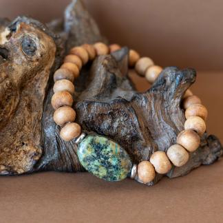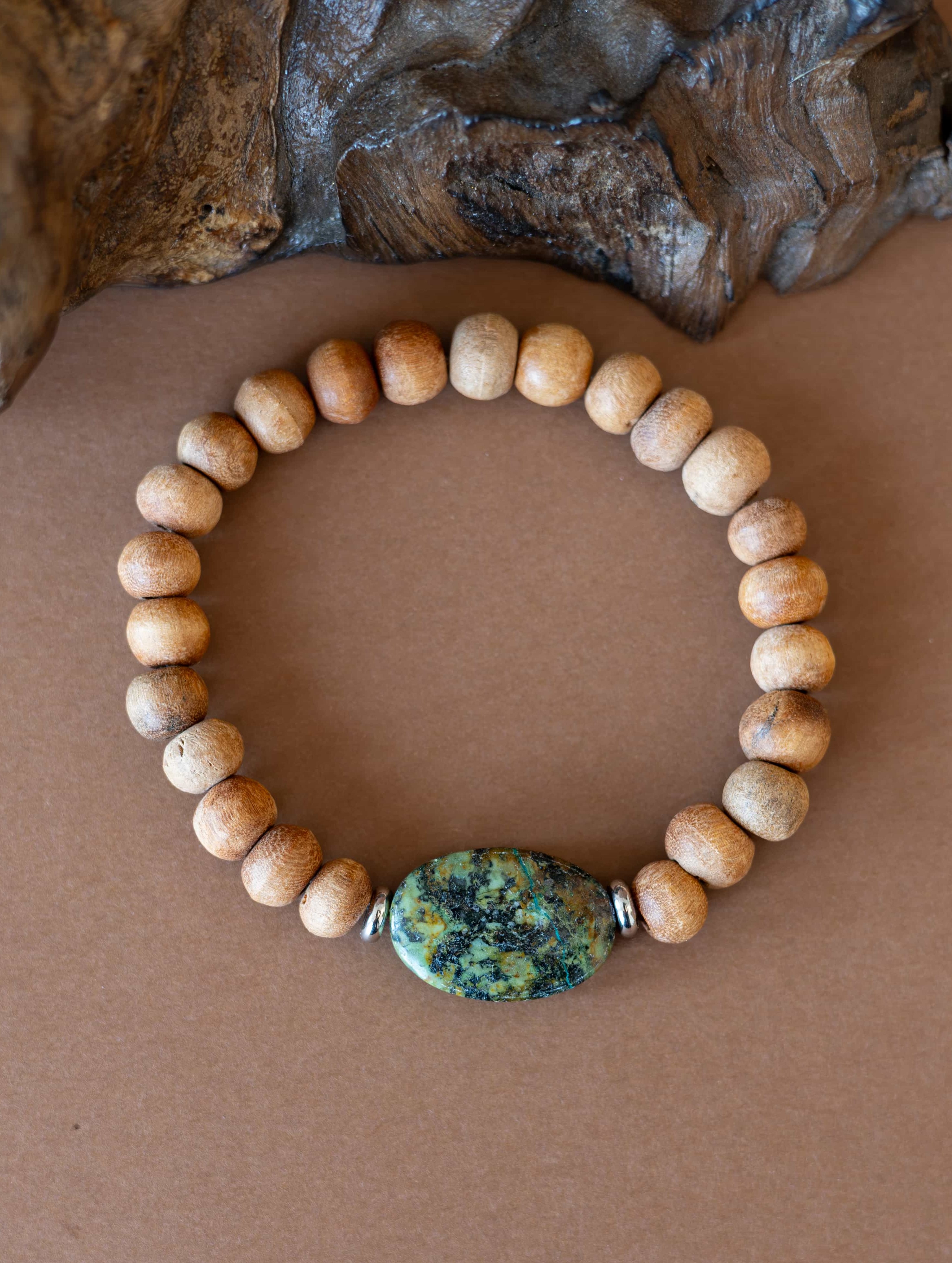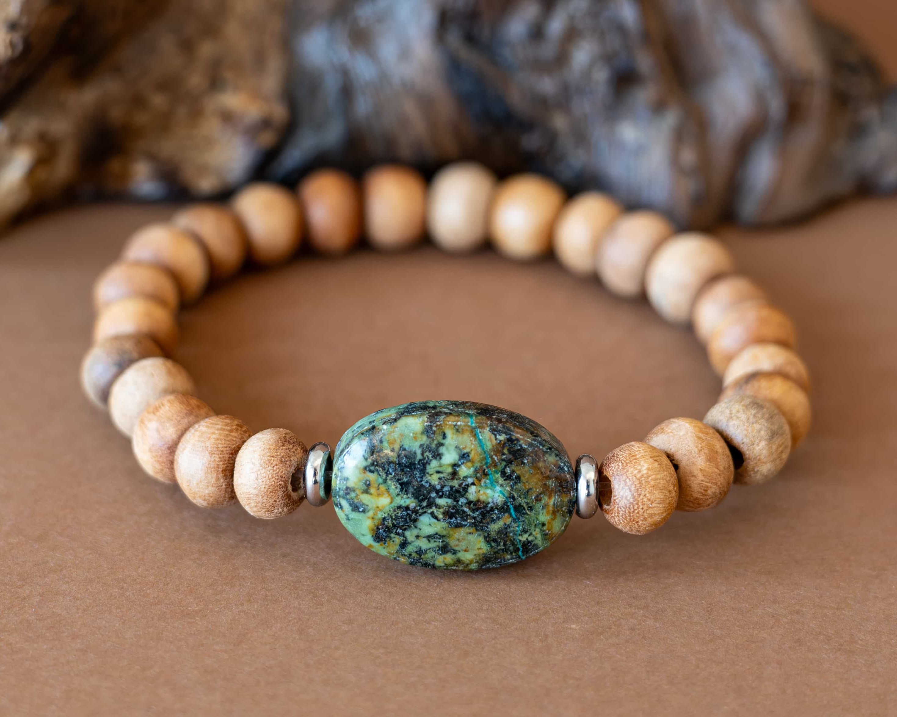 Náramek Důvěra je spojením tyrkysu, kamene ochrany a pravdy, a santalového dřeva, které přináší klid a harmonii. Jeho dominantou je velký valounek tyrkysu, který dodává náramku jedinečný charakter a připomíná sílu přirozeného bytí.