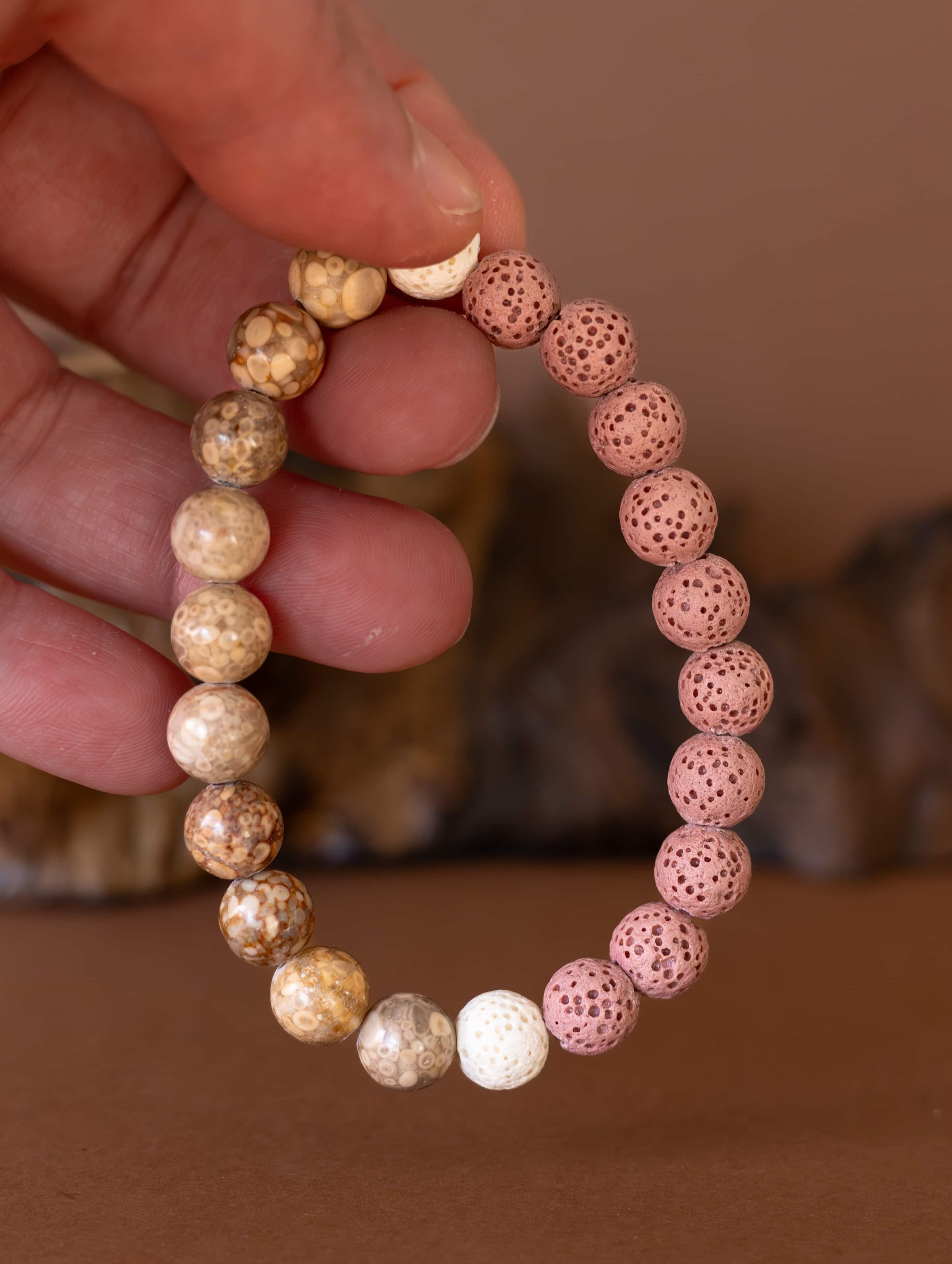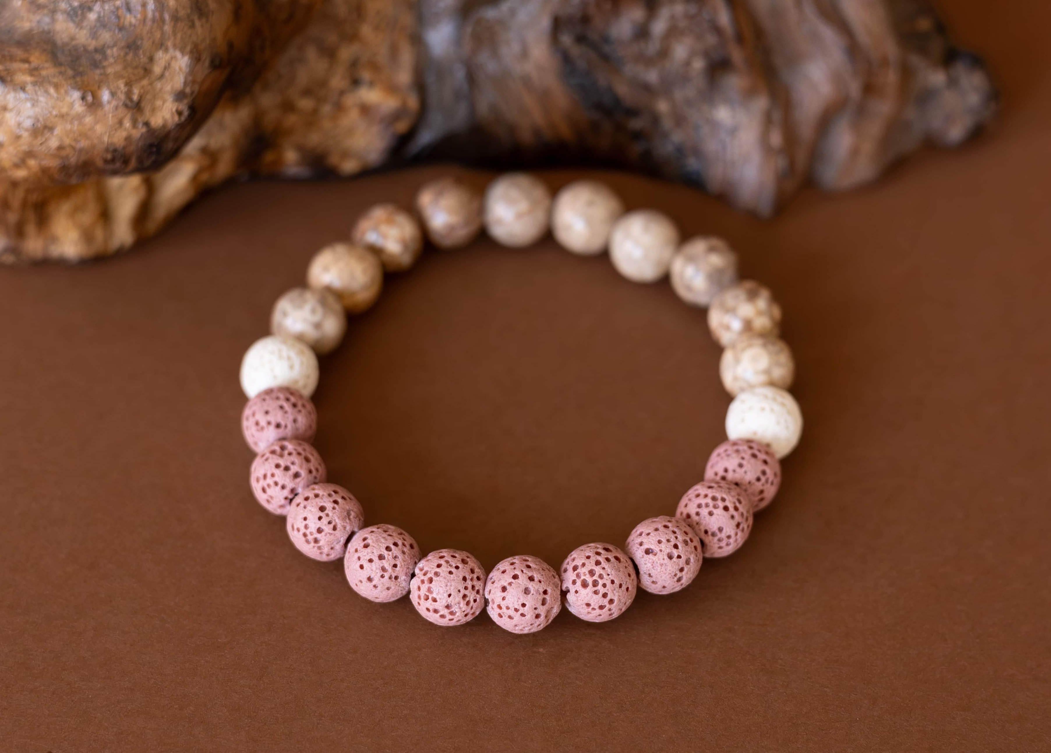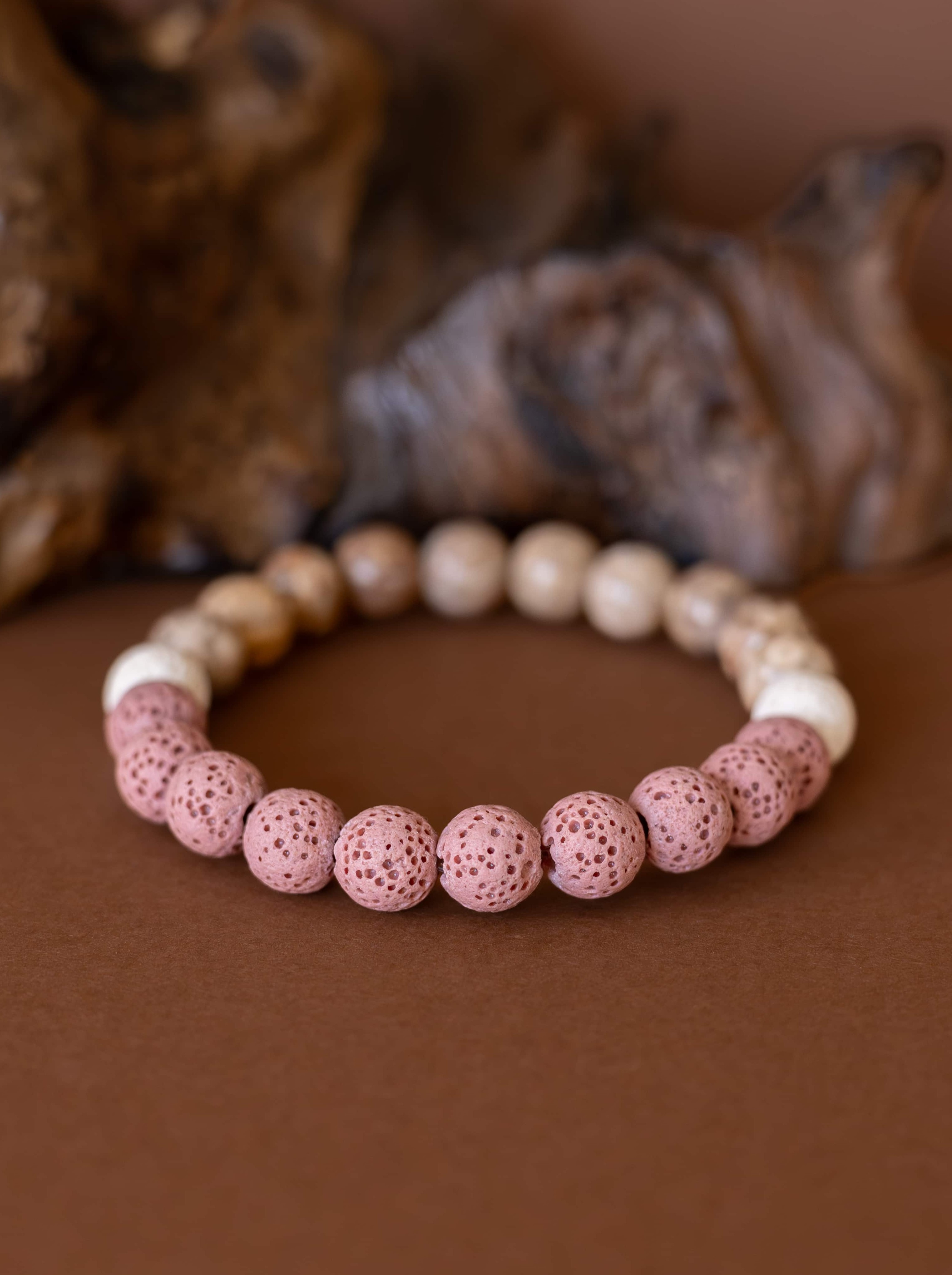 Náramek Duna odráží krásu přírodních prvků, kde se snoubí jemné tóny béžového jaspisu s hravými kontrasty růžových a bílých lávových kamínků. Tato kombinace symbolizuje rovnováhu mezi pevností země a lehkostí větru, mezi stabilitou a jemností.