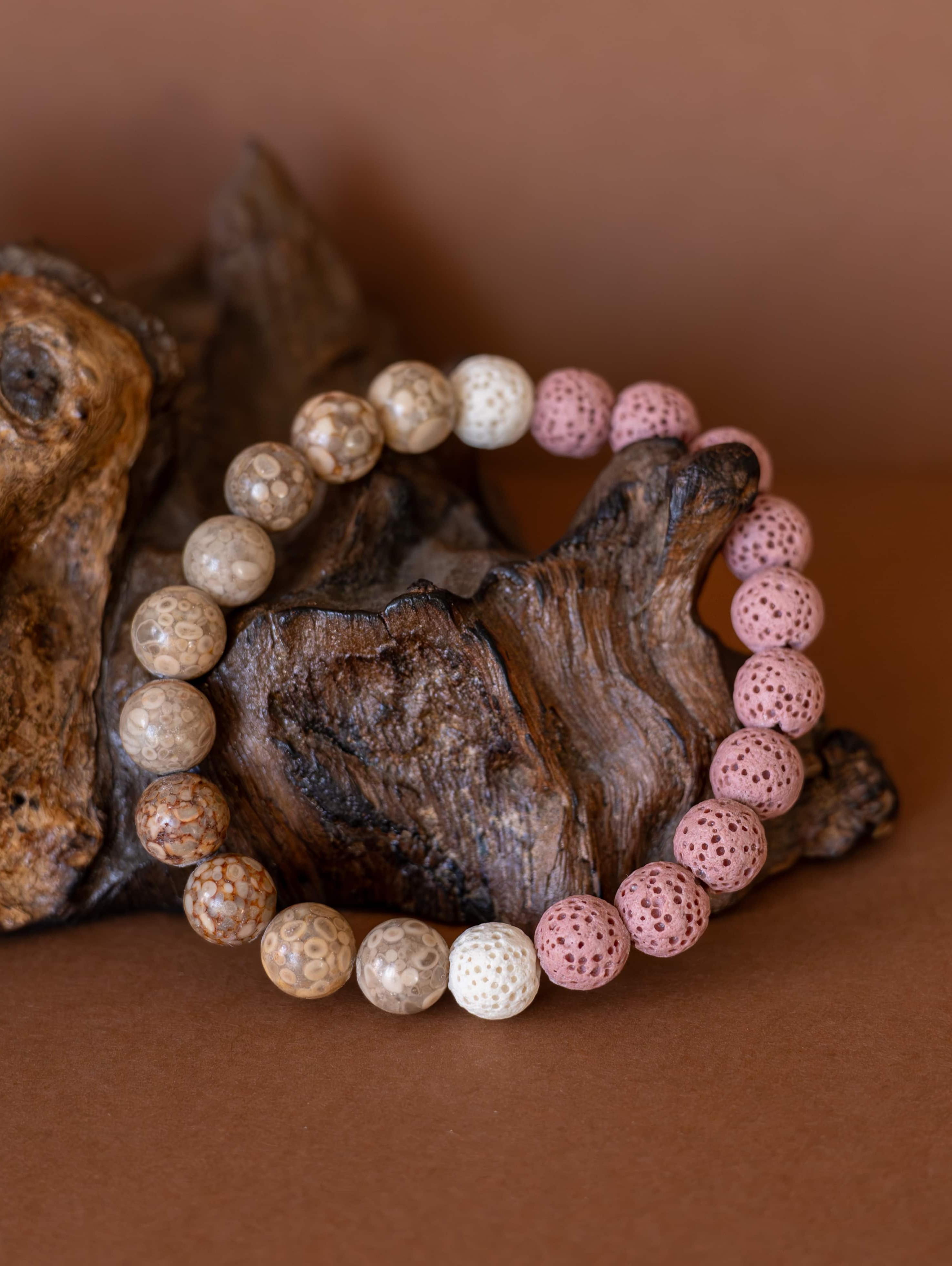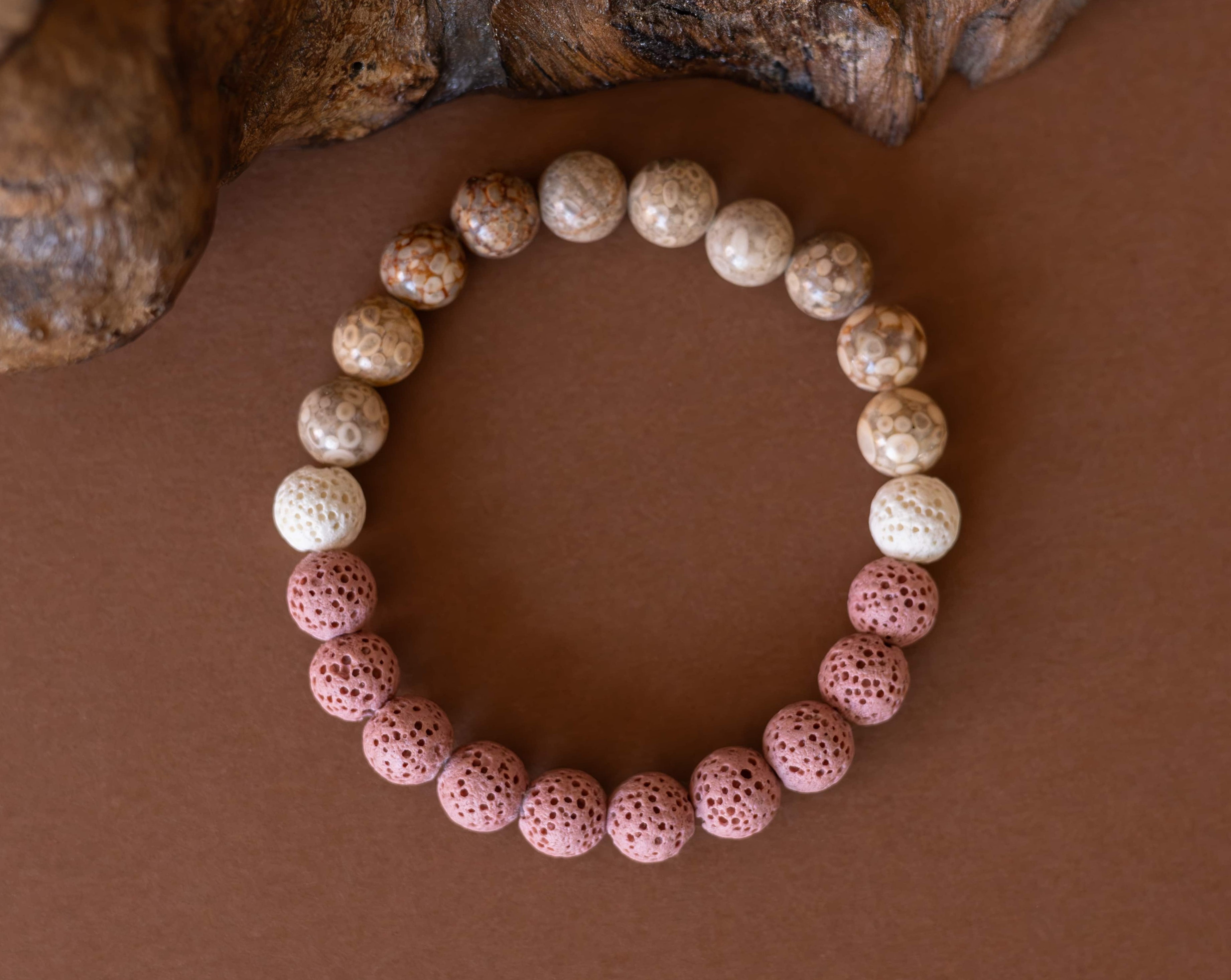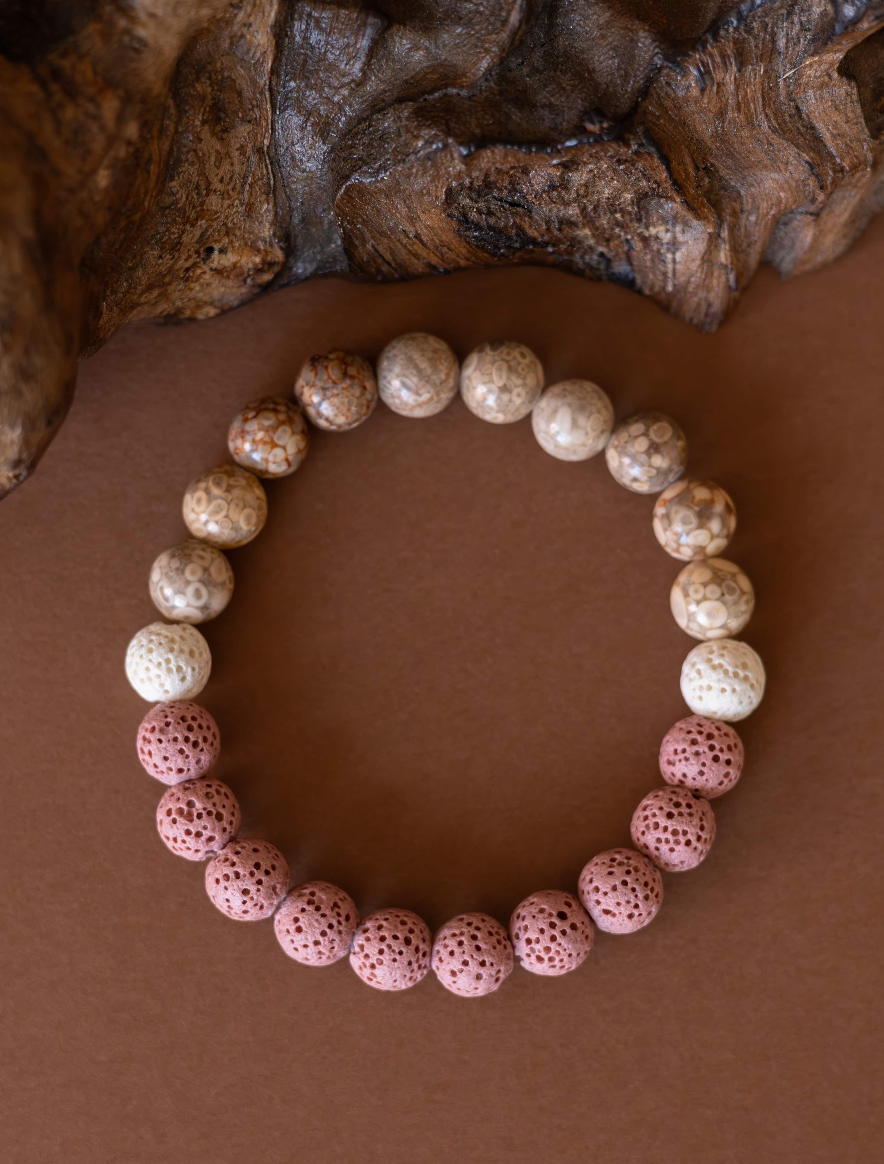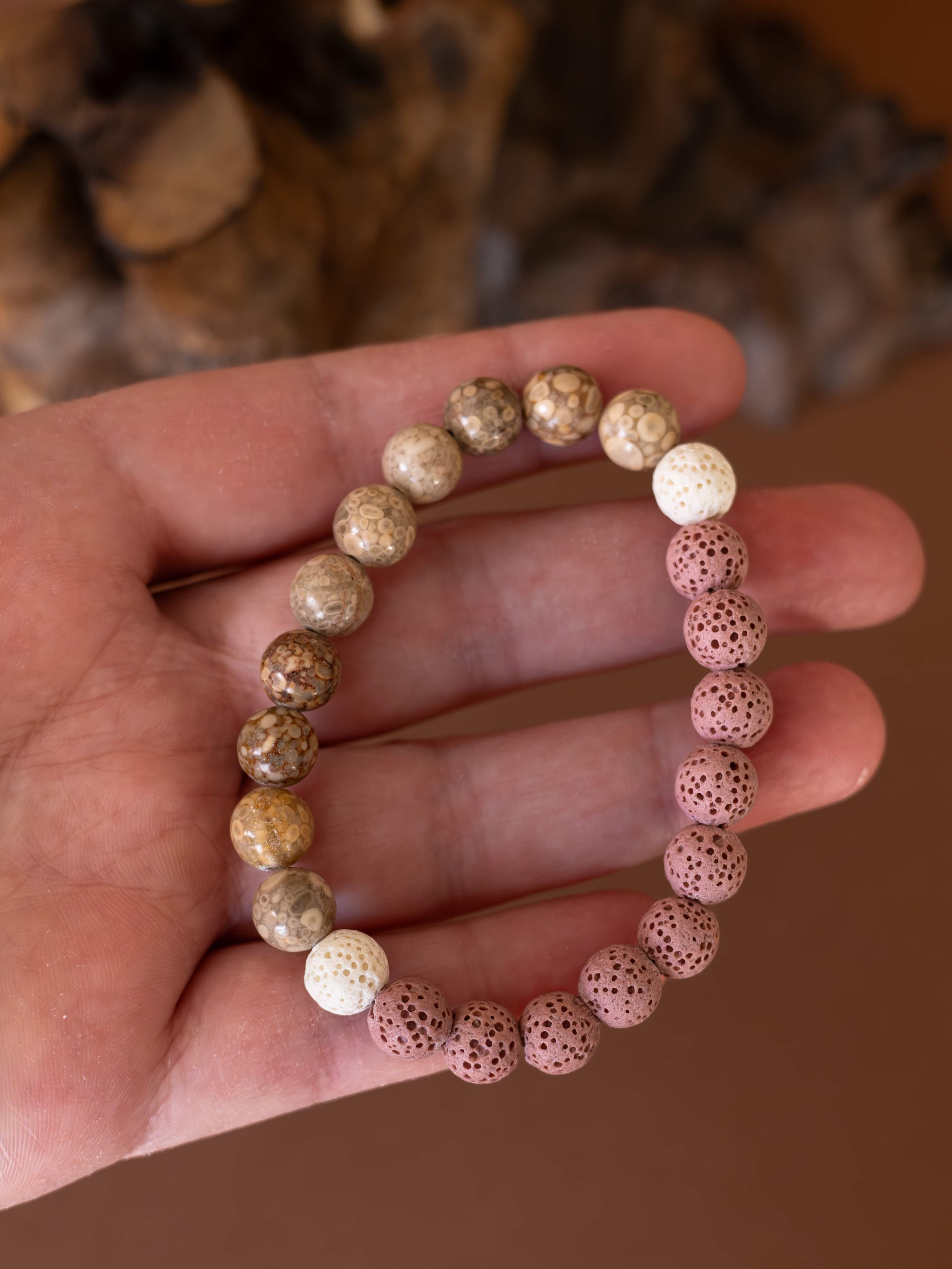 Náramek Duna odráží krásu přírodních prvků, kde se snoubí jemné tóny béžového jaspisu s hravými kontrasty růžových a bílých lávových kamínků. Tato kombinace symbolizuje rovnováhu mezi pevností země a lehkostí větru, mezi stabilitou a jemností.