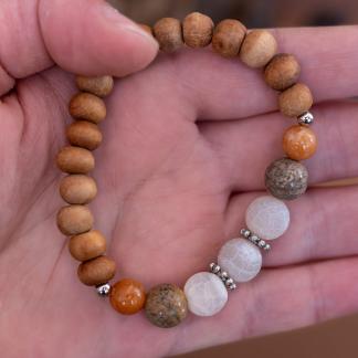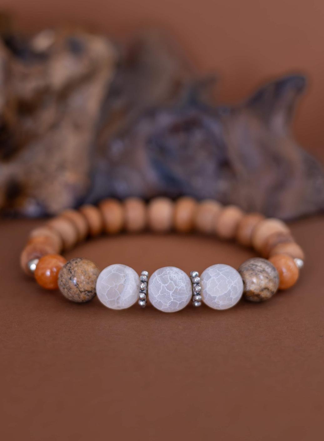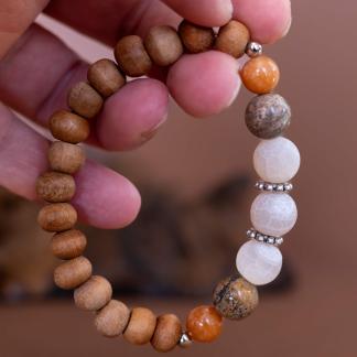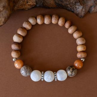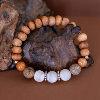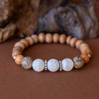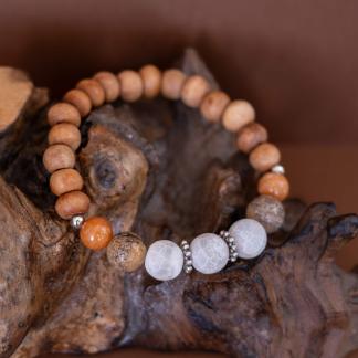 Náramek Solea je inspirován jemnou ženskou energií, která září zevnitř – tiše, klidně a s jistotou. Střed tvoří tři korálky z bílého mraženého achátu, symbolu čistoty a vnitřního světla. Jsou lemovány jaspisem a slunečním kamenem, které dodávají sílu, odvahu a radost. Zbytek náramku tvoří santalové korálky, které celku propůjčují klidnou a meditační atmosféru.