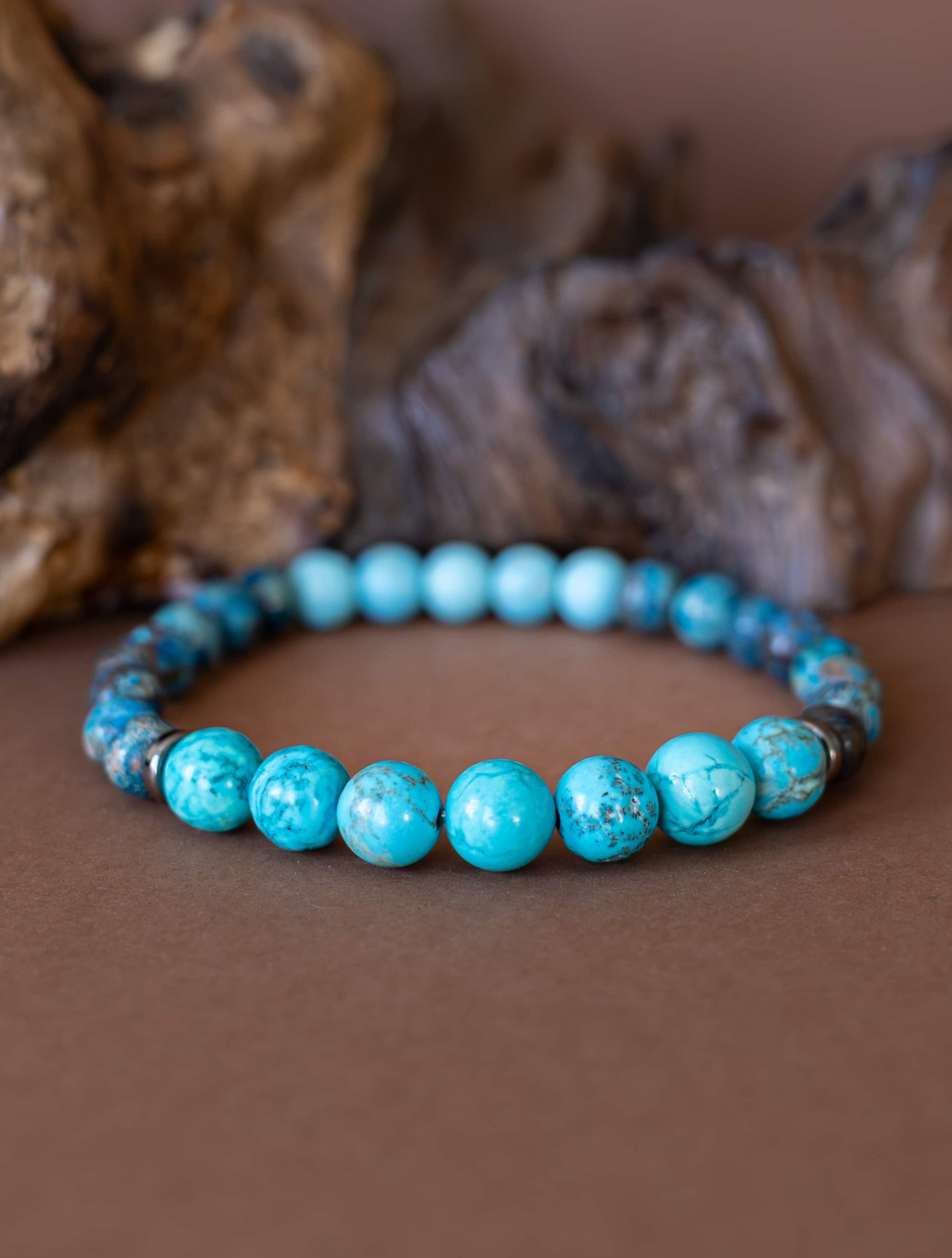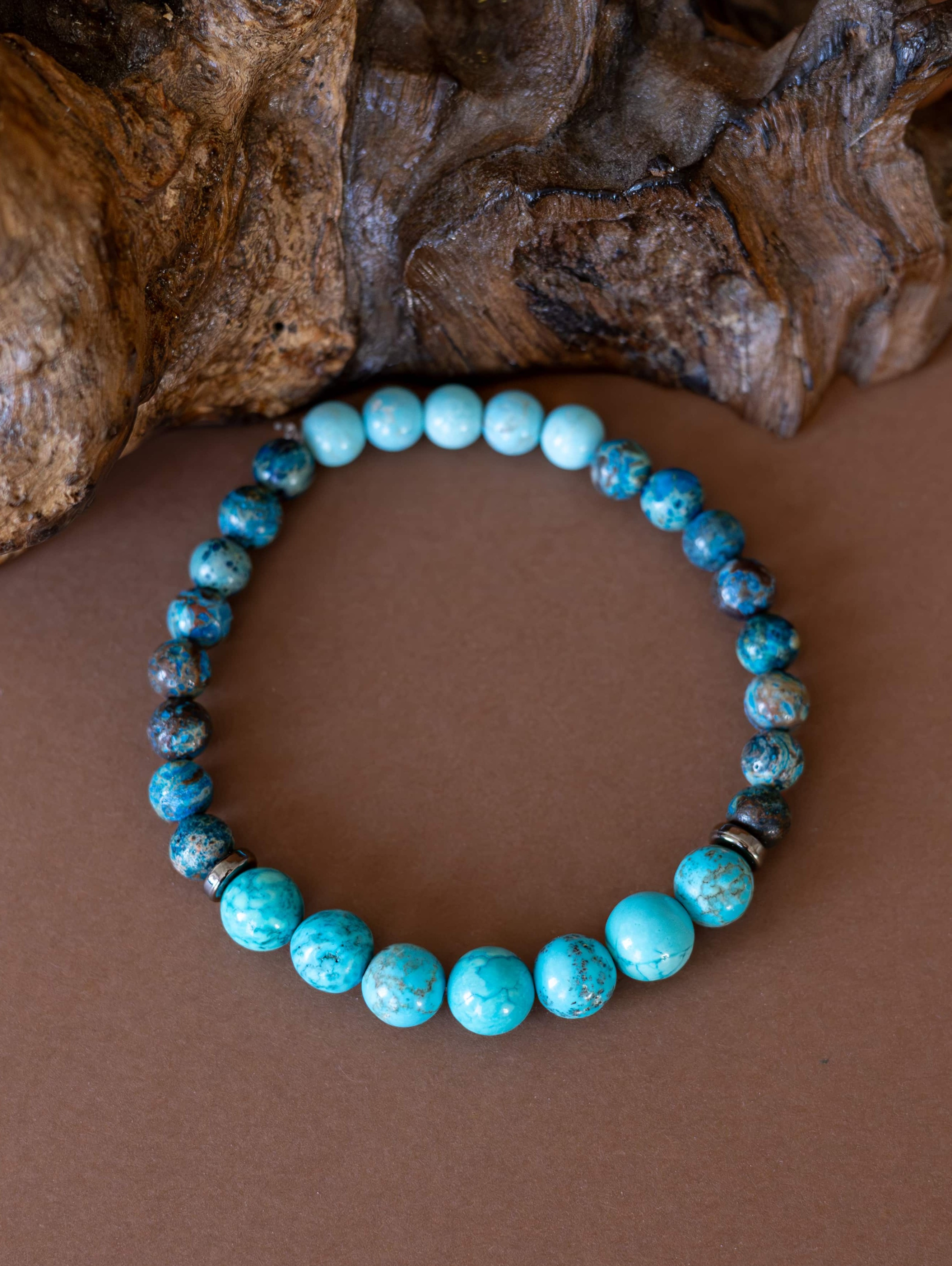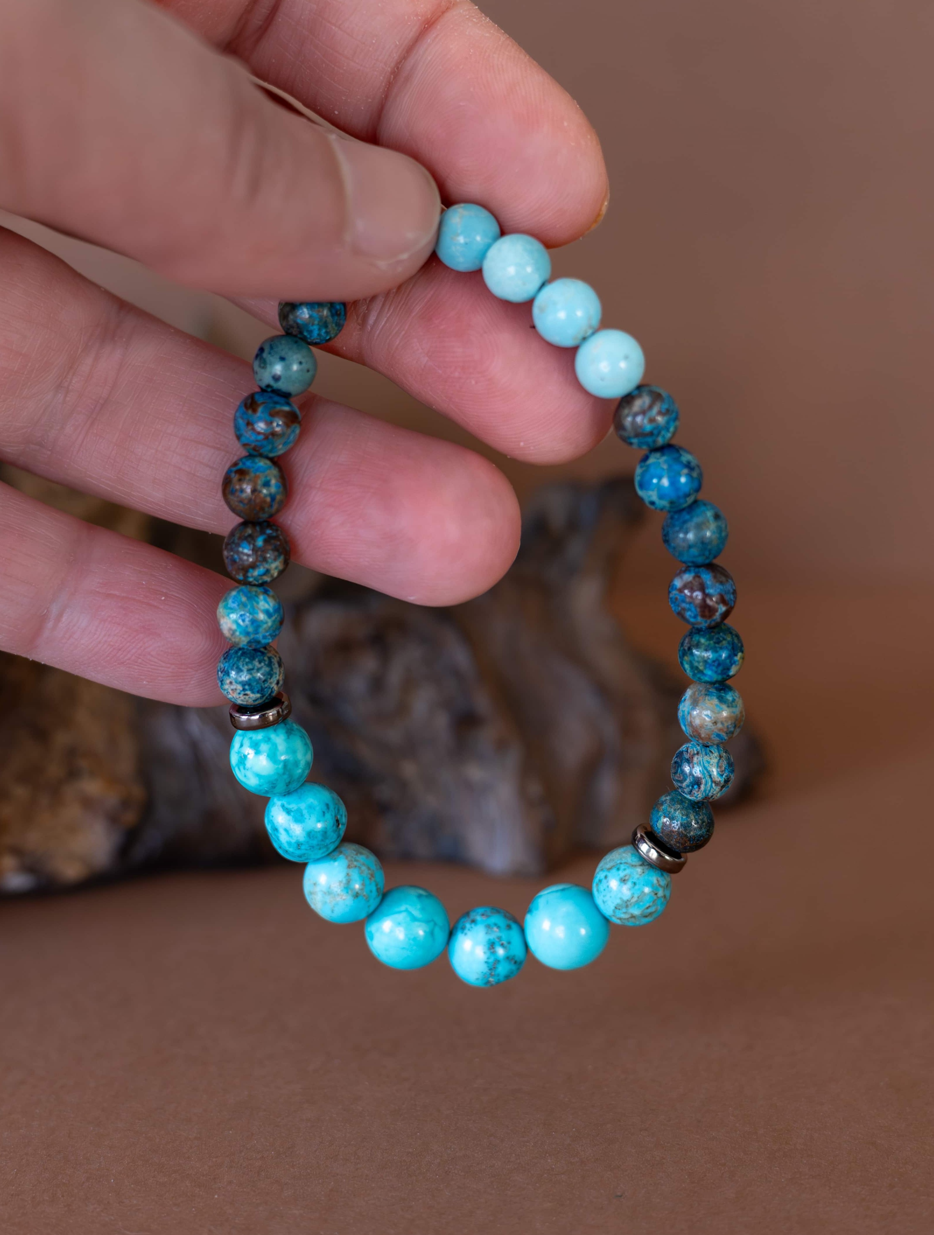 Náramek Ztišení je jemným průvodcem pro chvíle, kdy je třeba zklidnit mysl, uvolnit napětí a ponořit se do ticha. Kombinace tyrkysových odstínů magnezitu, chryzokolu a jaspisu působí harmonicky a vyrovnaně – jako hladina jezera při východu slunce.
