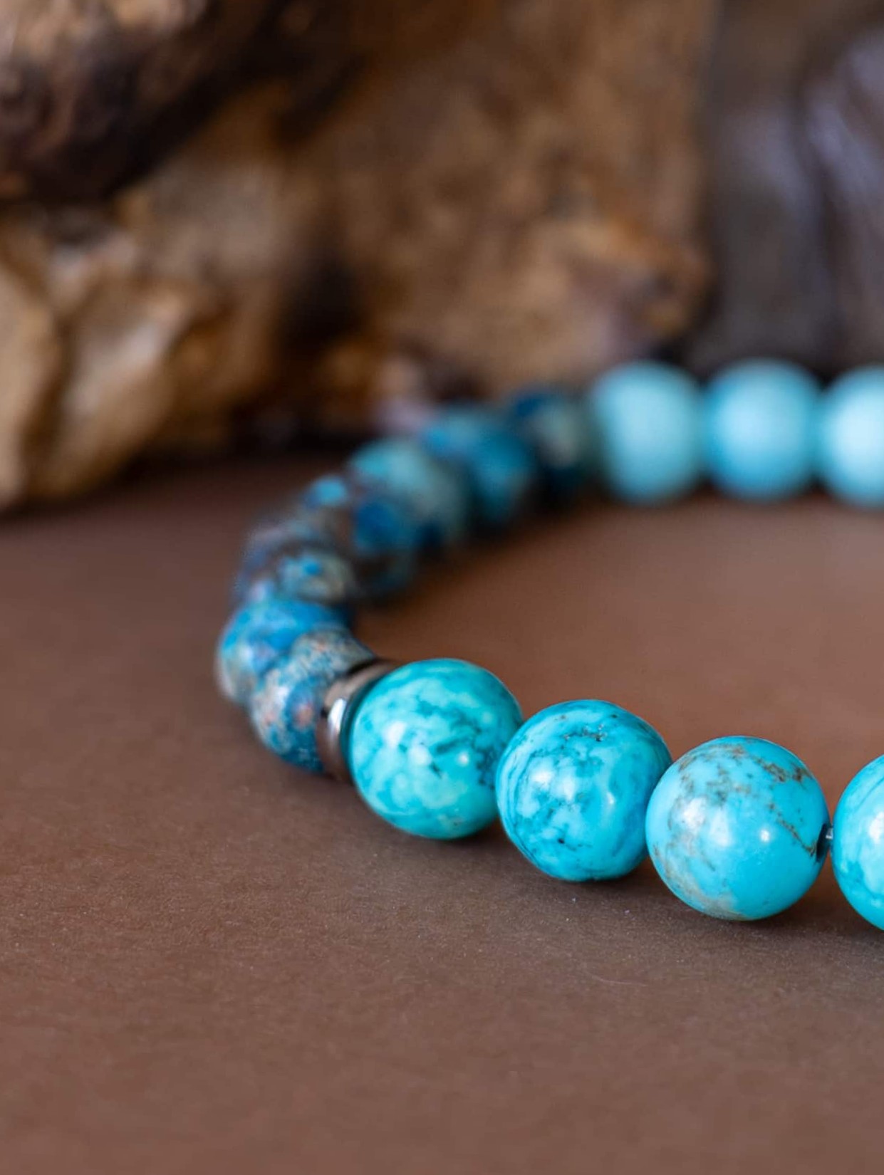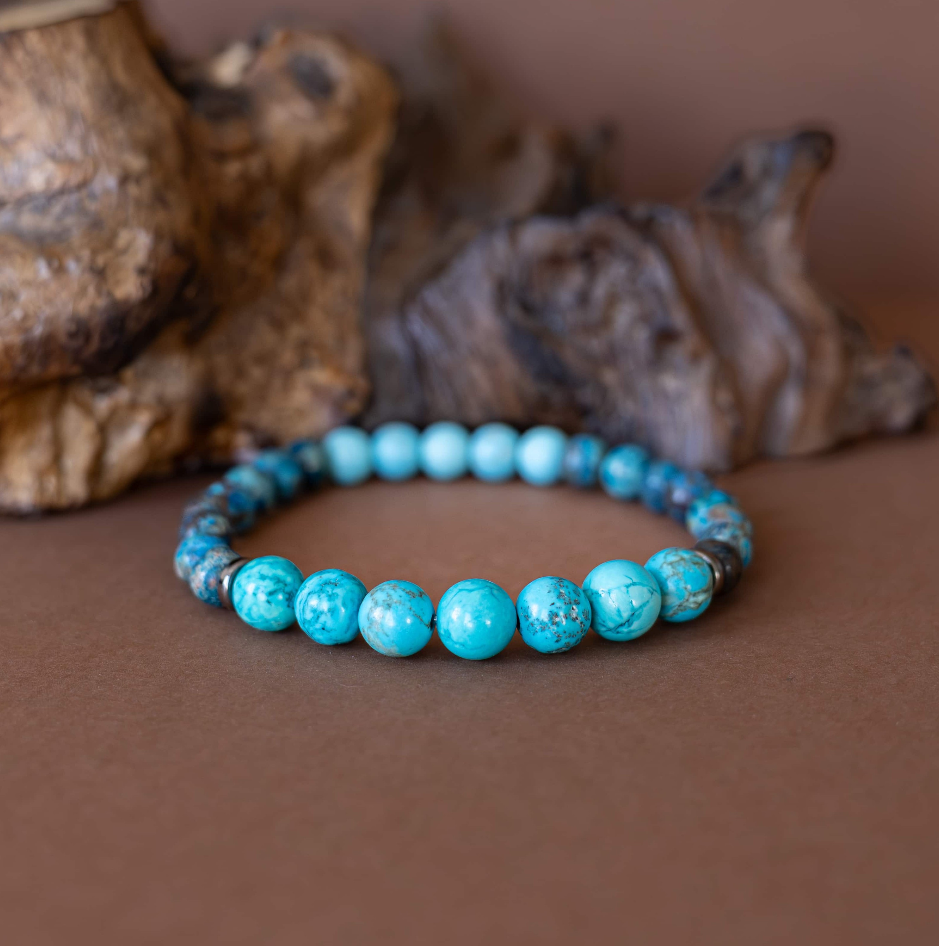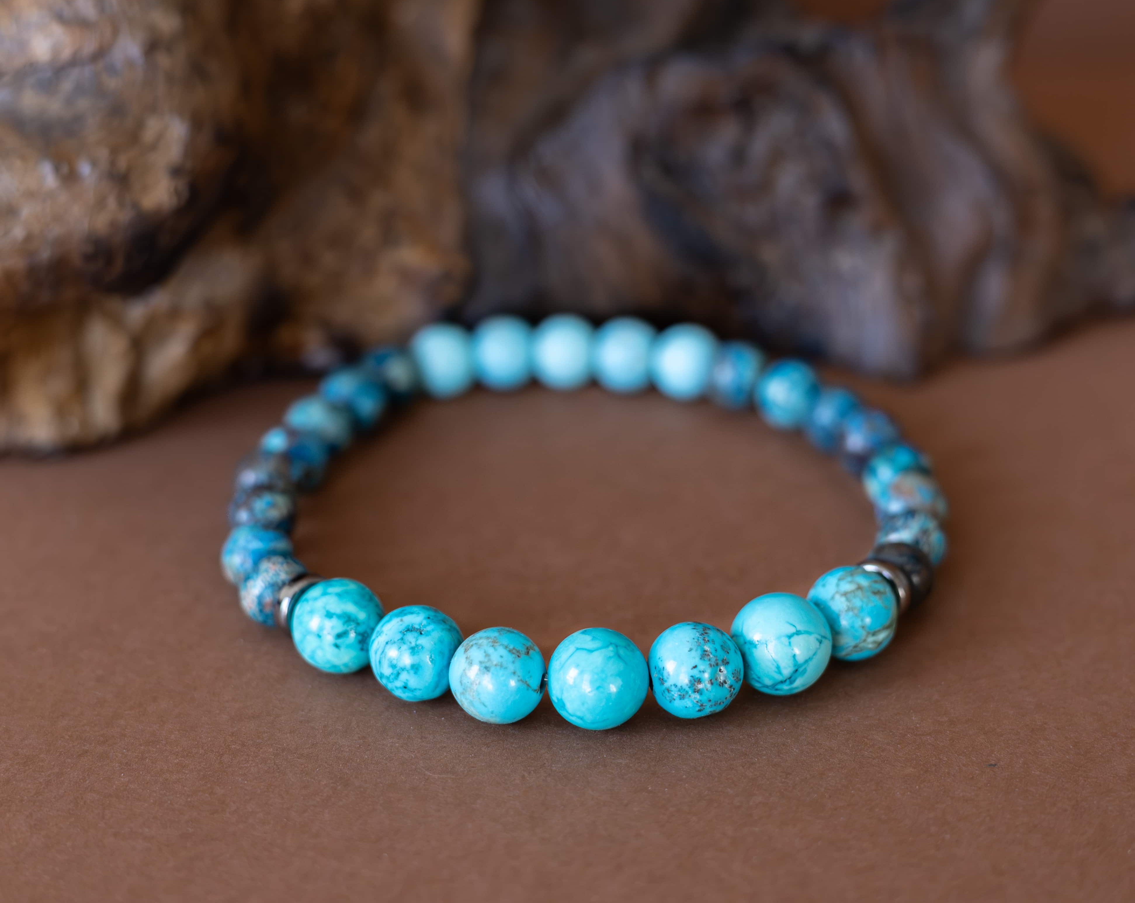 Náramek Ztišení je jemným průvodcem pro chvíle, kdy je třeba zklidnit mysl, uvolnit napětí a ponořit se do ticha. Kombinace tyrkysových odstínů magnezitu, chryzokolu a jaspisu působí harmonicky a vyrovnaně – jako hladina jezera při východu slunce.