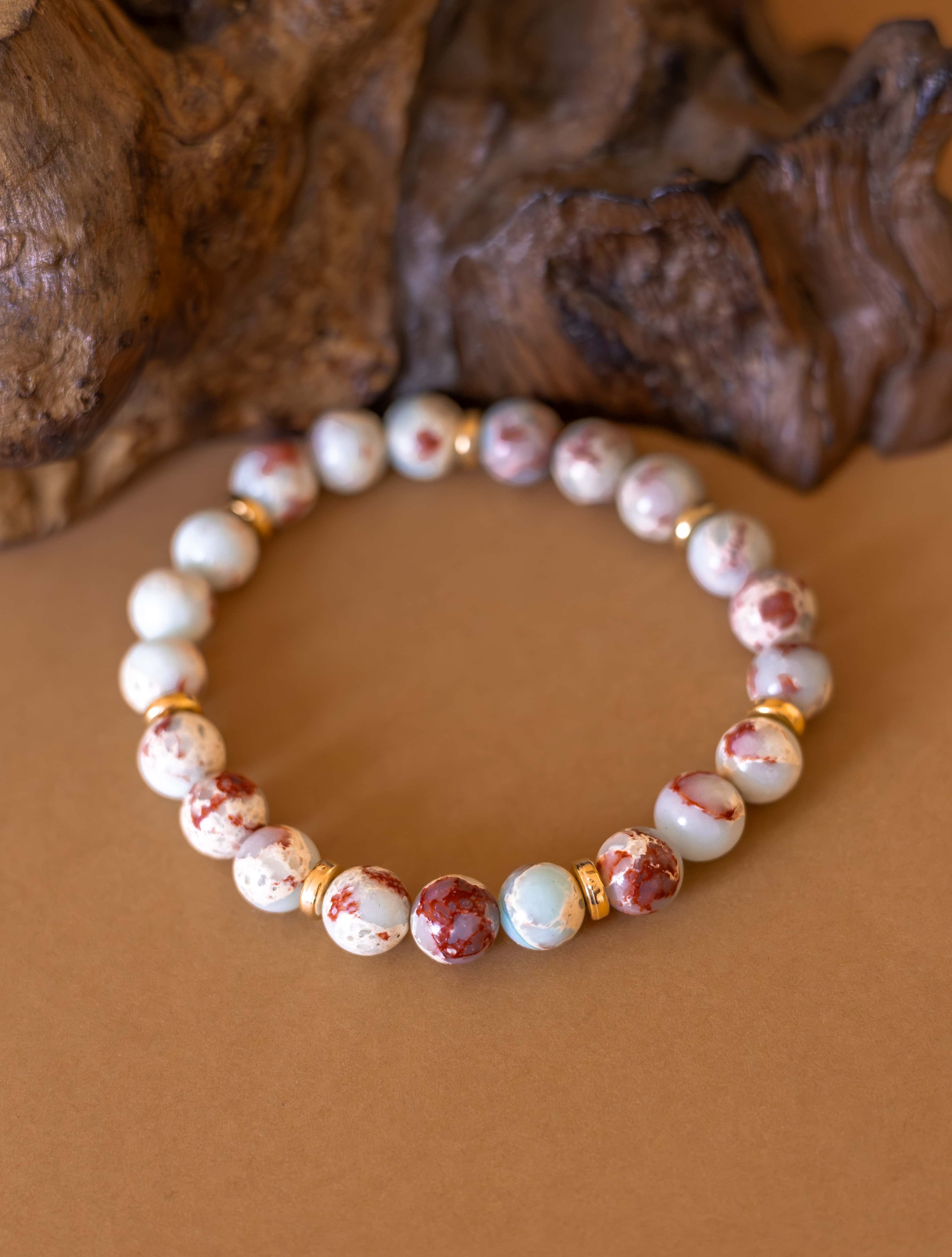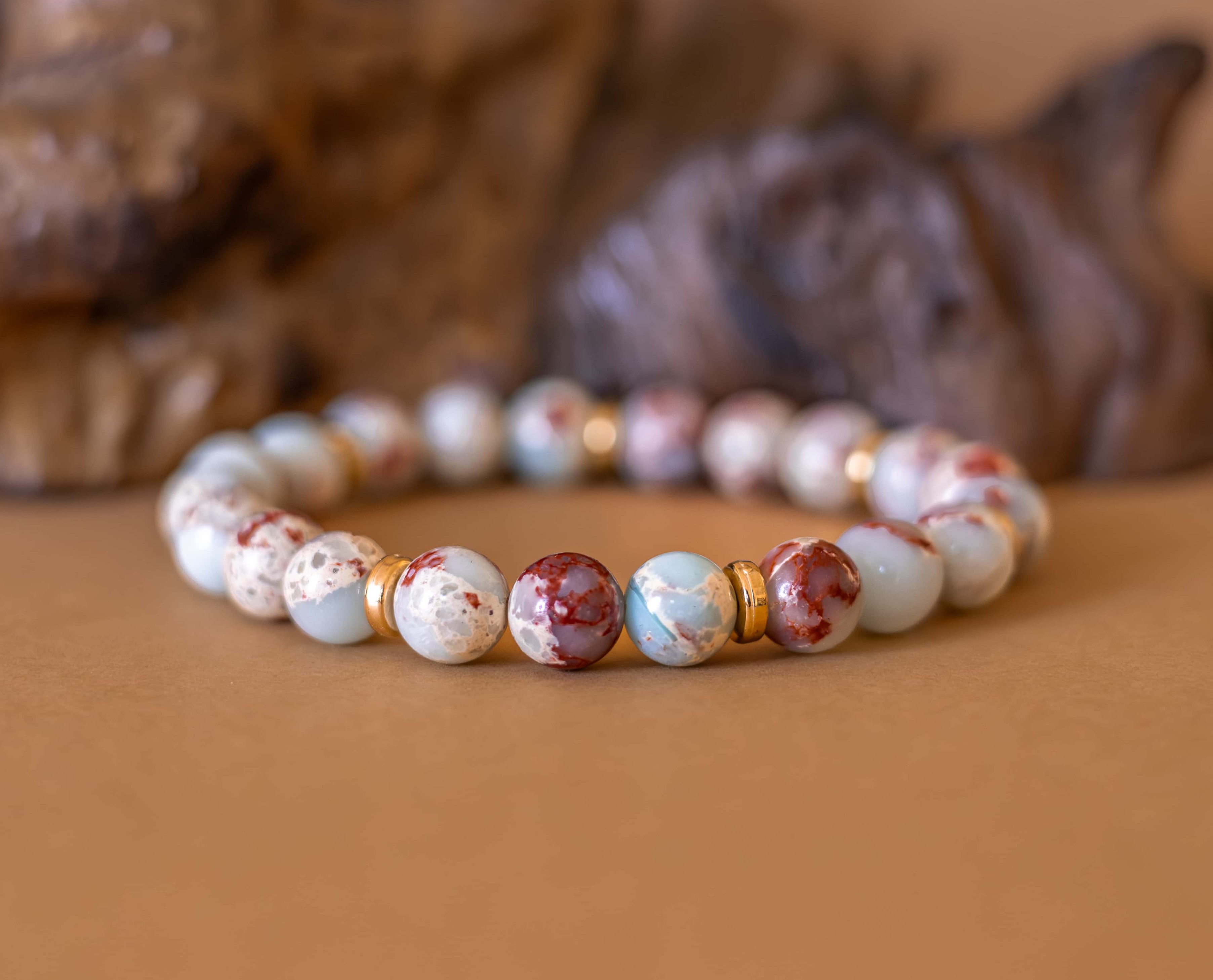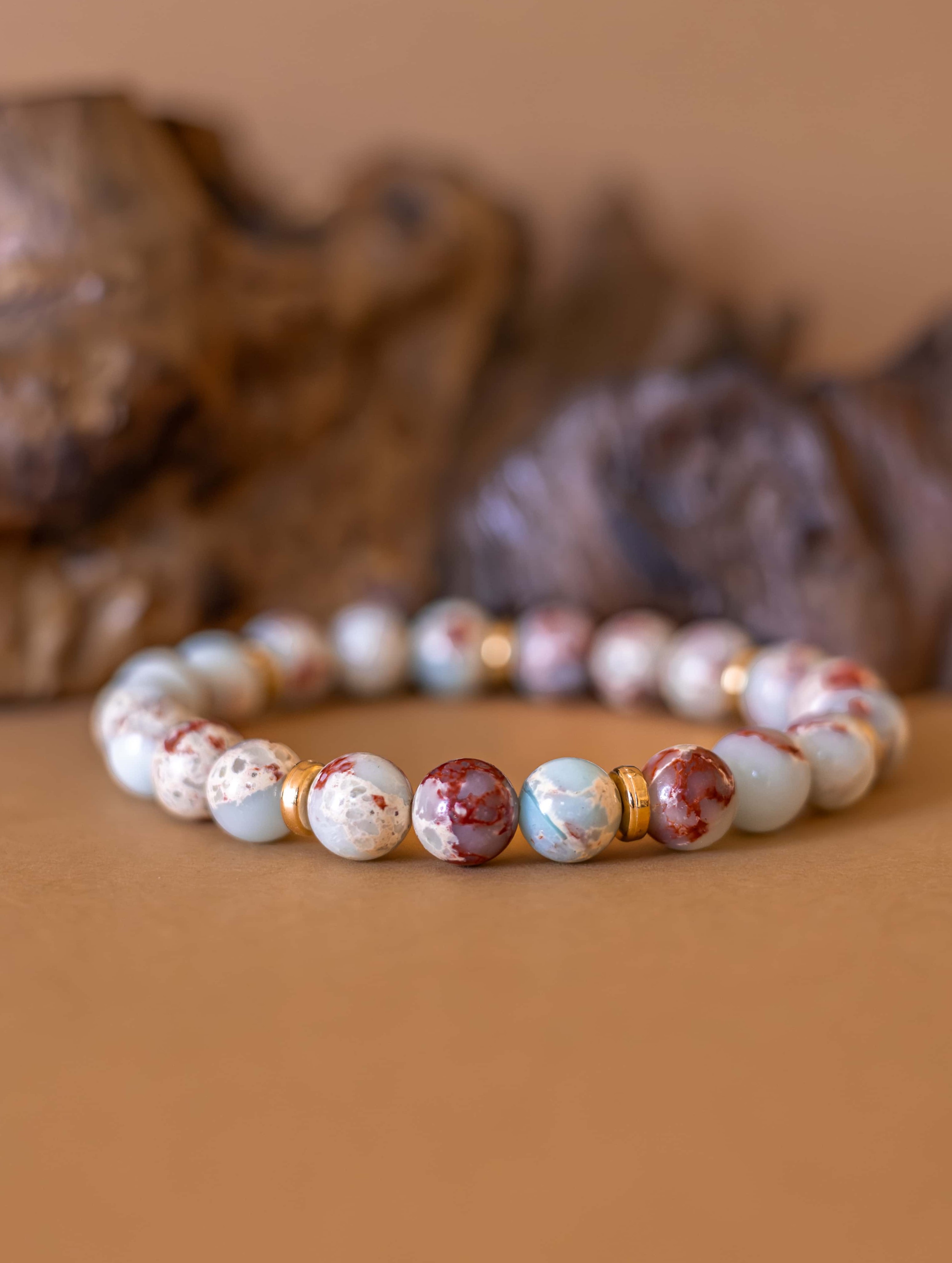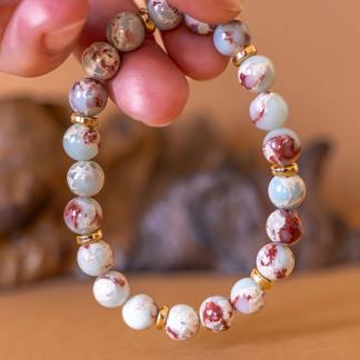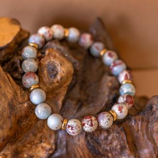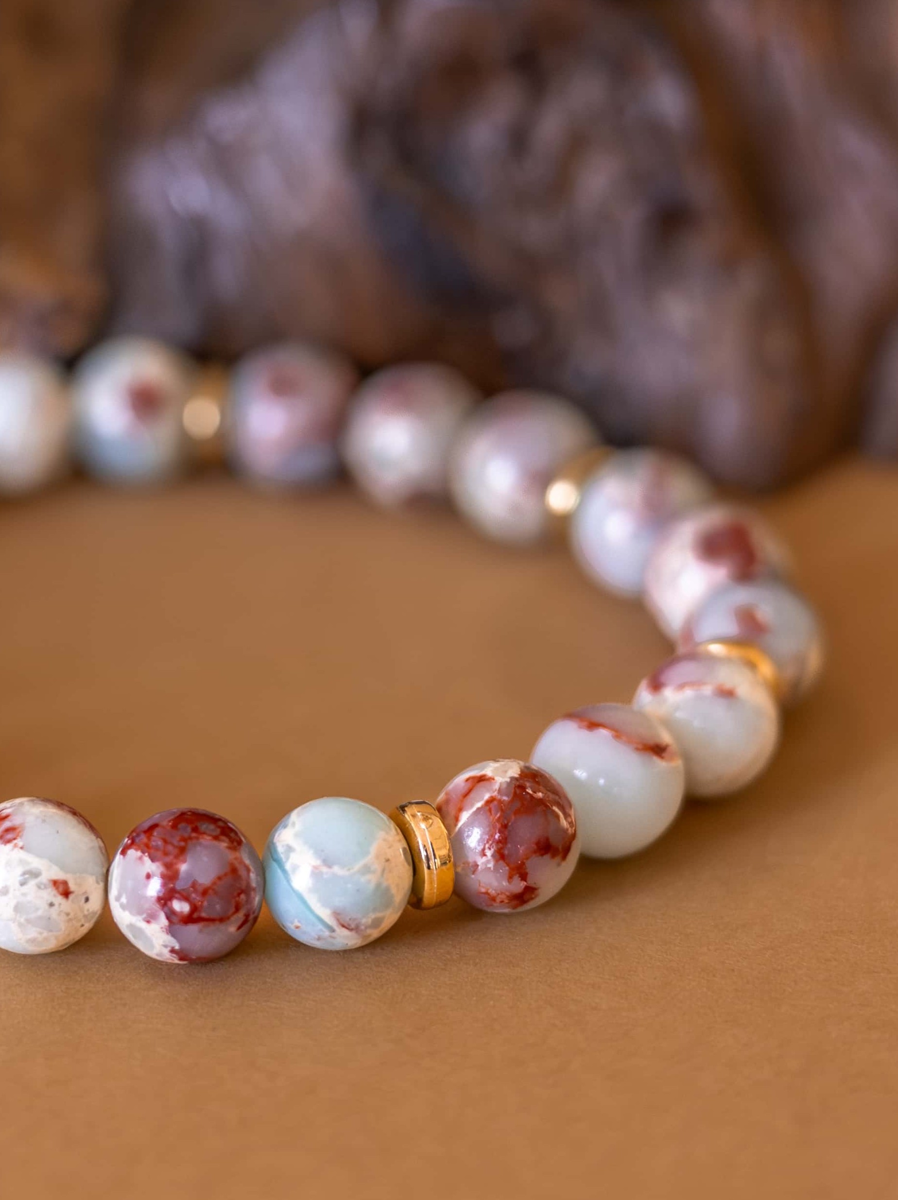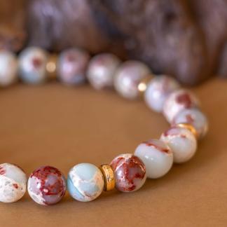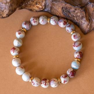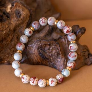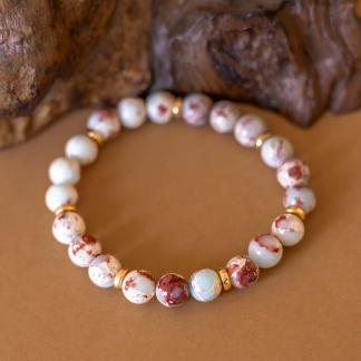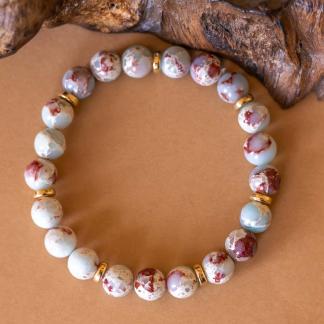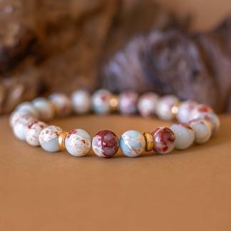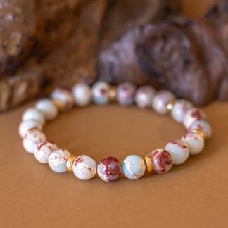 Spojení přírodního jaspisu s jemnými červenohnědými žílami a zlatými mezidíly vytváří harmonii, která zklidňuje mysl a zároveň připomíná sílu ženské energie. Jaspis podporuje stabilitu, odvahu a vyrovnanost – je to kámen, který stojí při vás, když potřebujete vnitřní oporu.