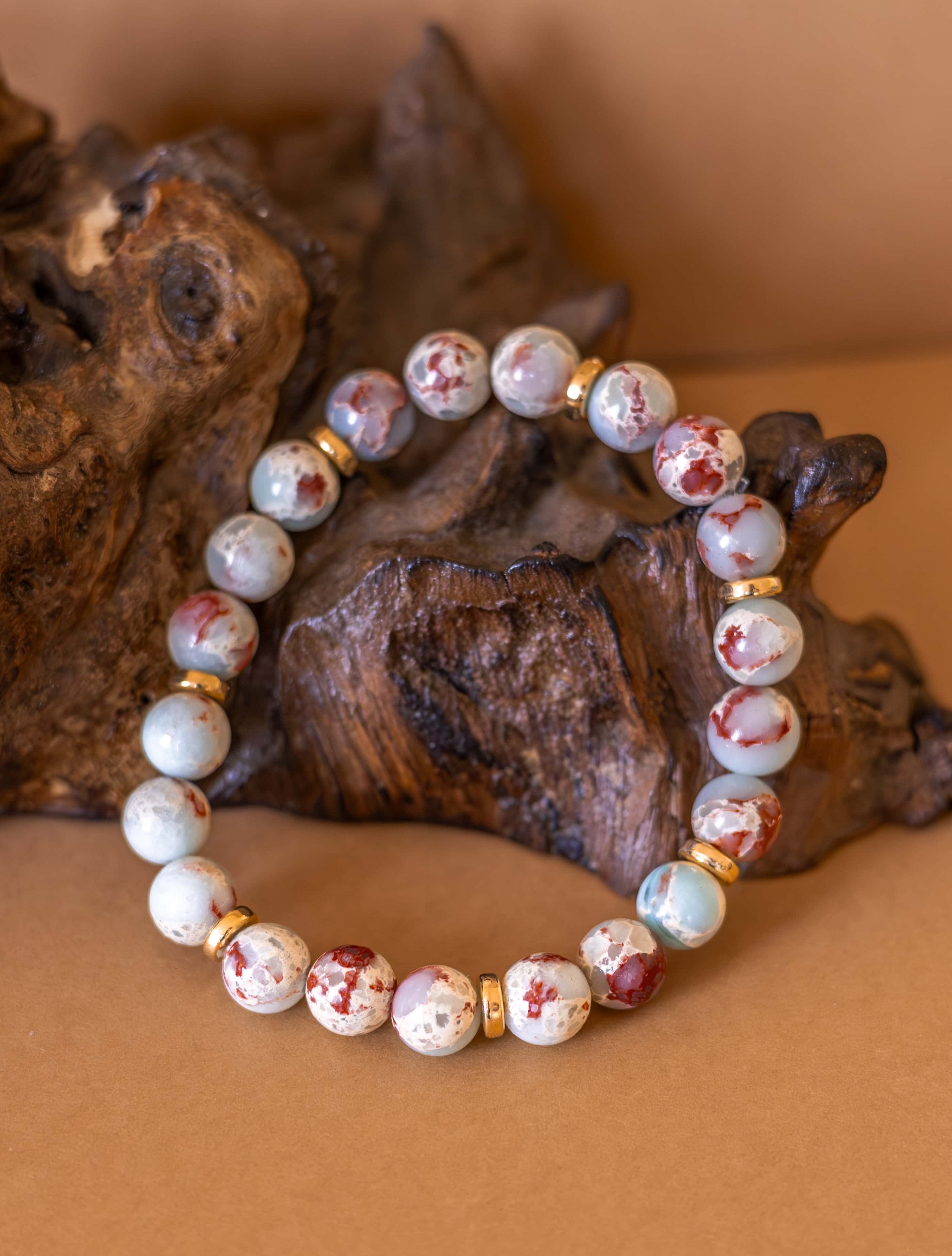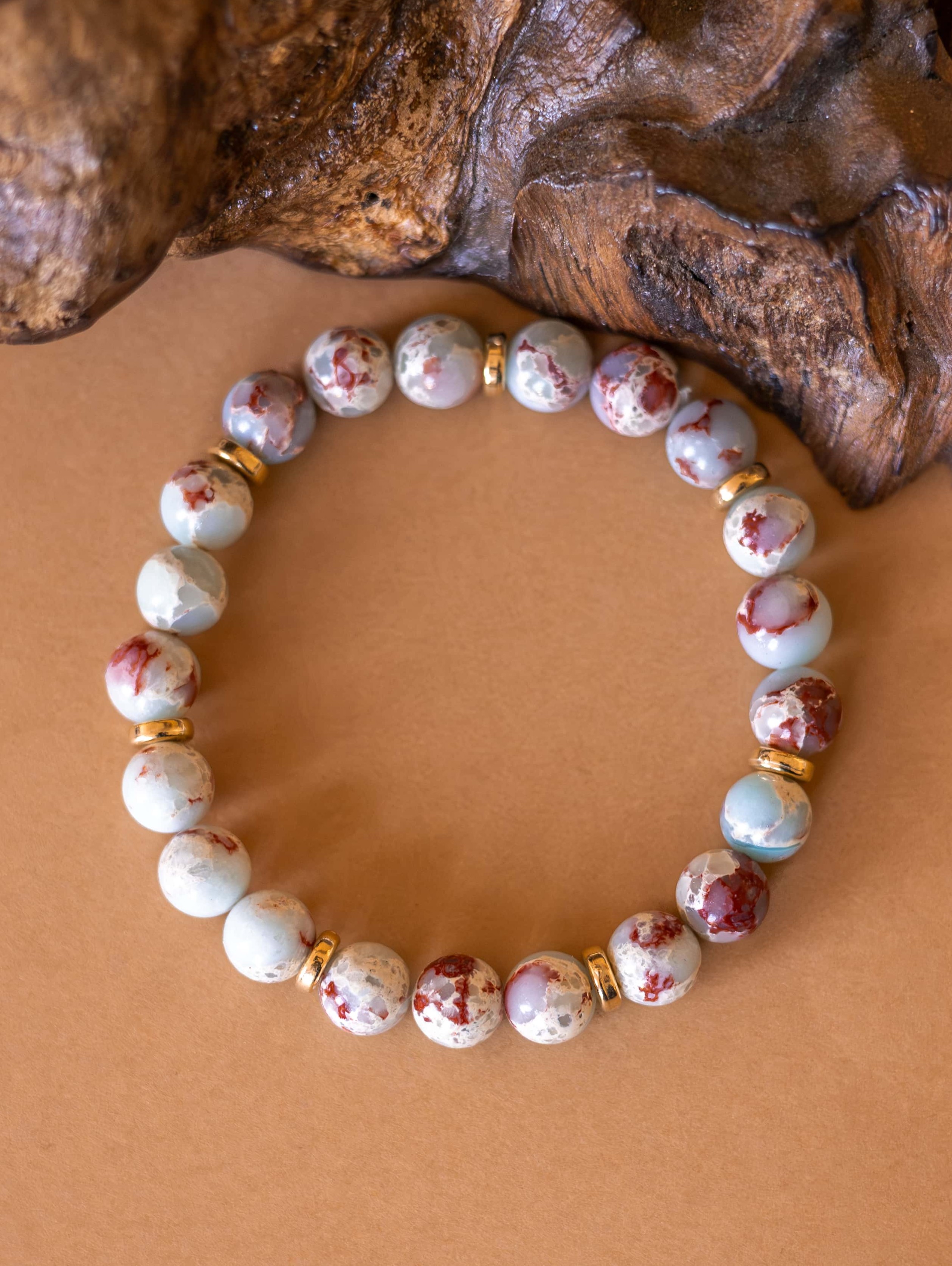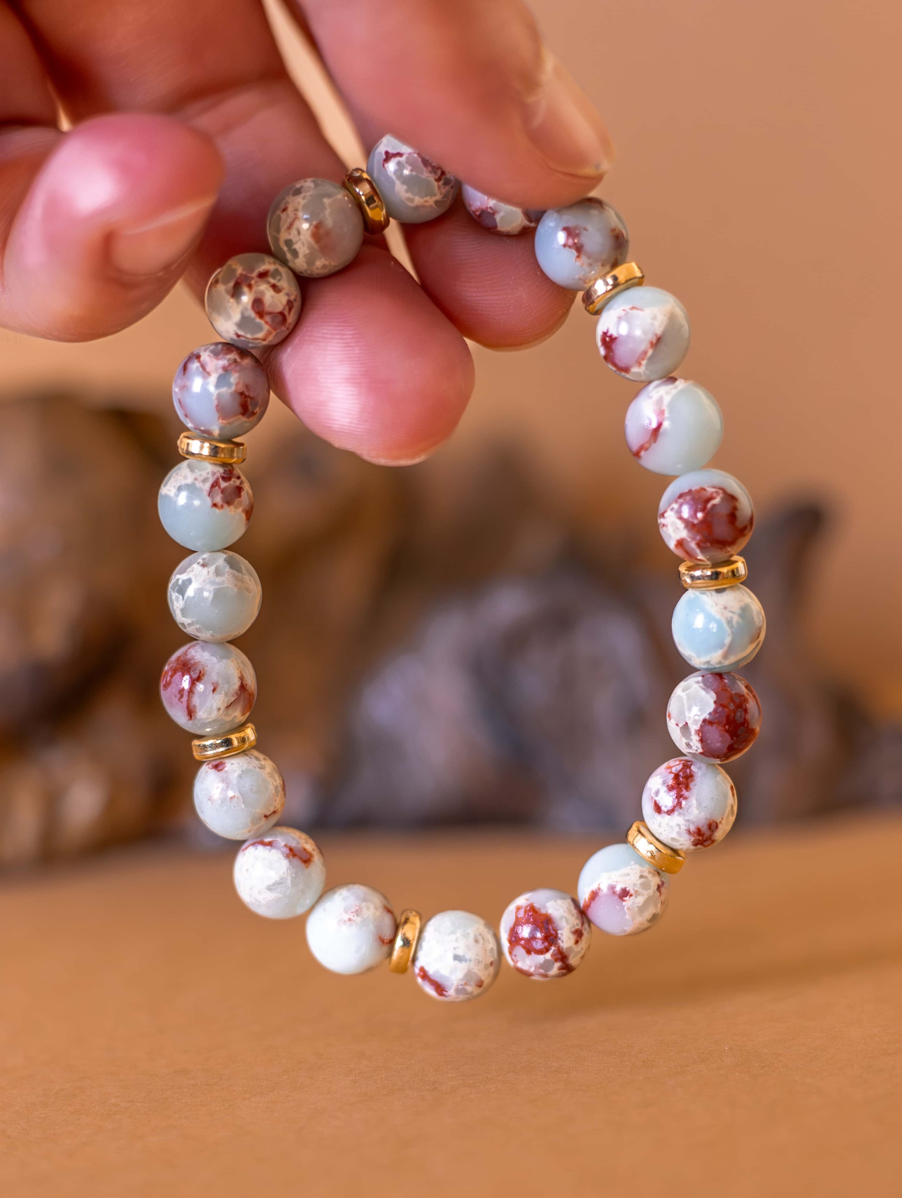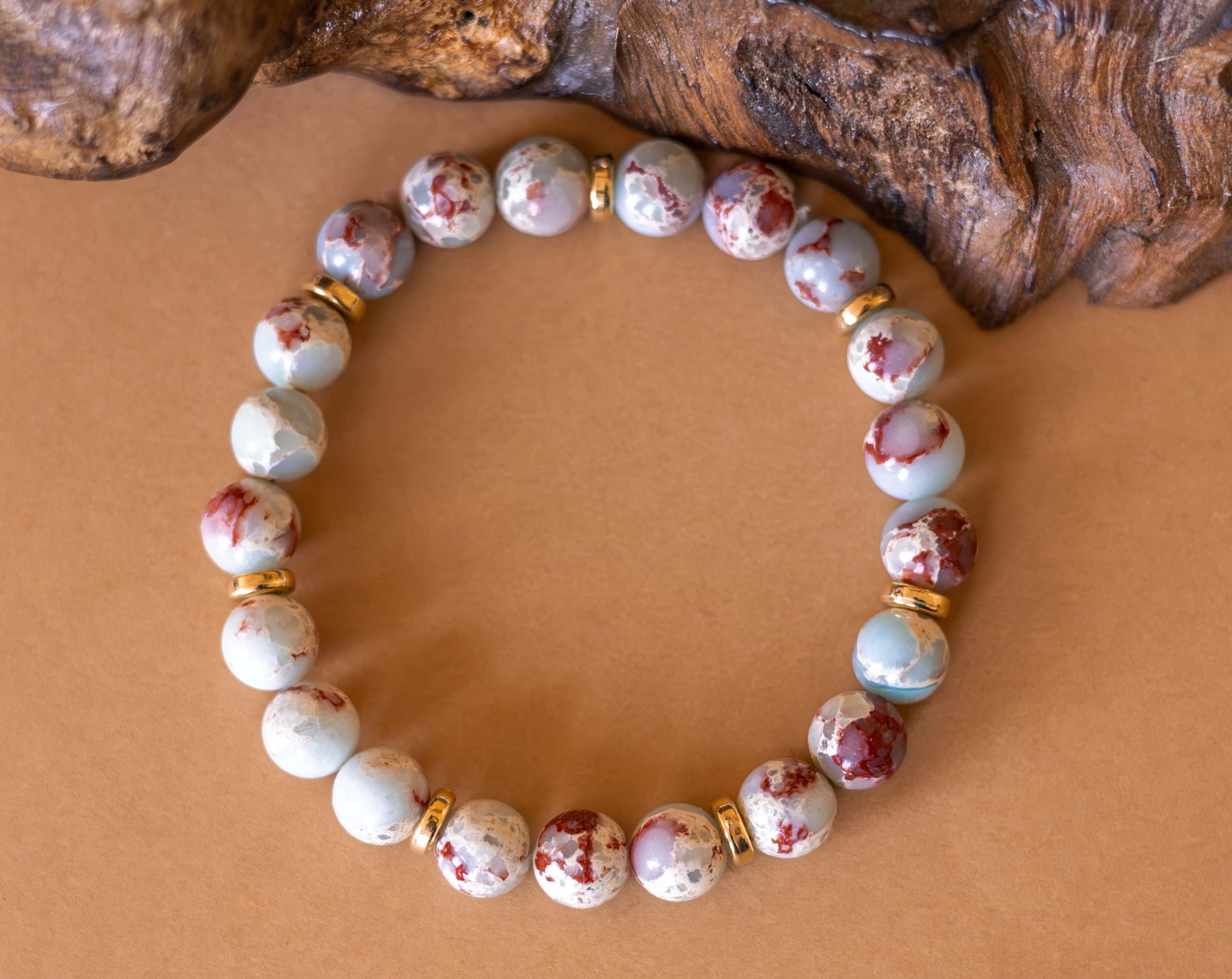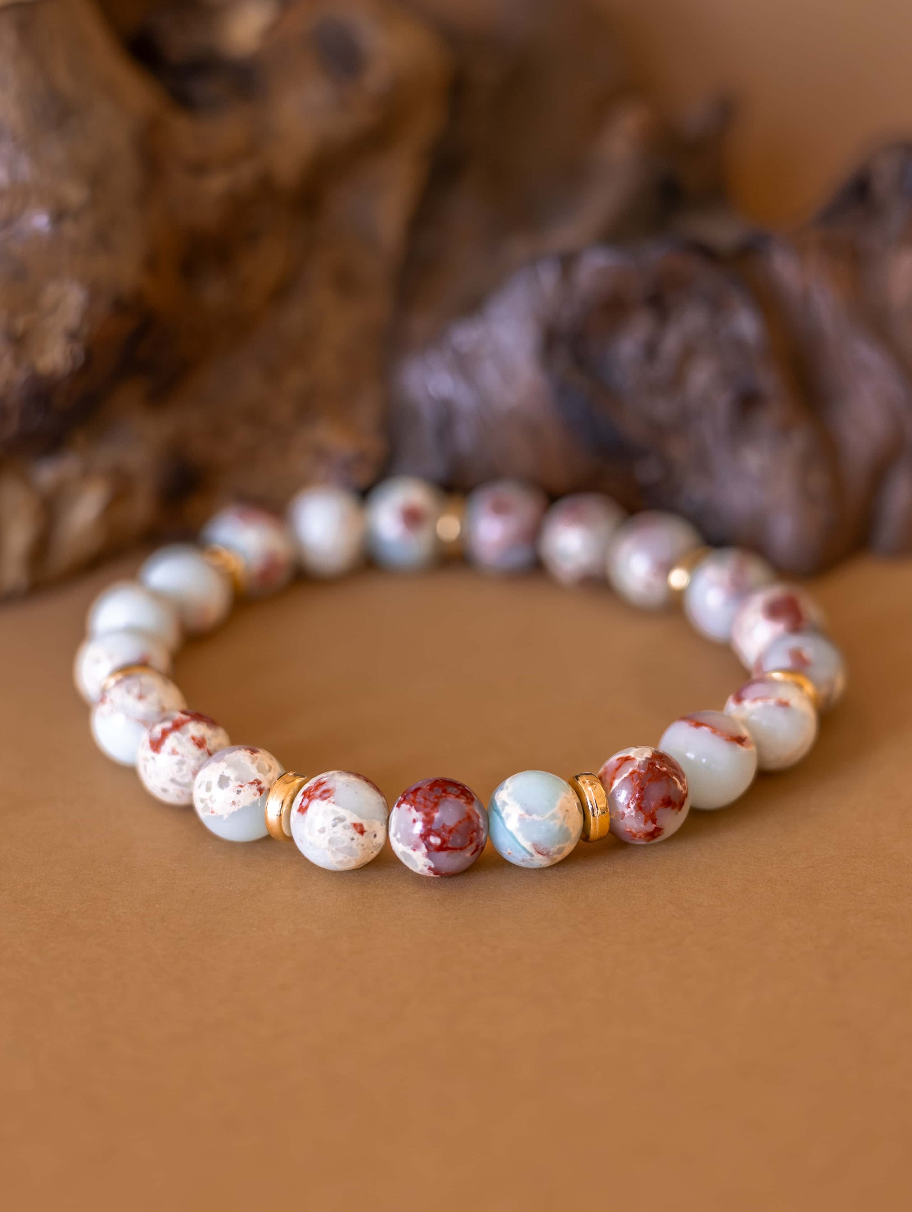 Spojení přírodního jaspisu s jemnými červenohnědými žílami a zlatými mezidíly vytváří harmonii, která zklidňuje mysl a zároveň připomíná sílu ženské energie. Jaspis podporuje stabilitu, odvahu a vyrovnanost – je to kámen, který stojí při vás, když potřebujete vnitřní oporu.