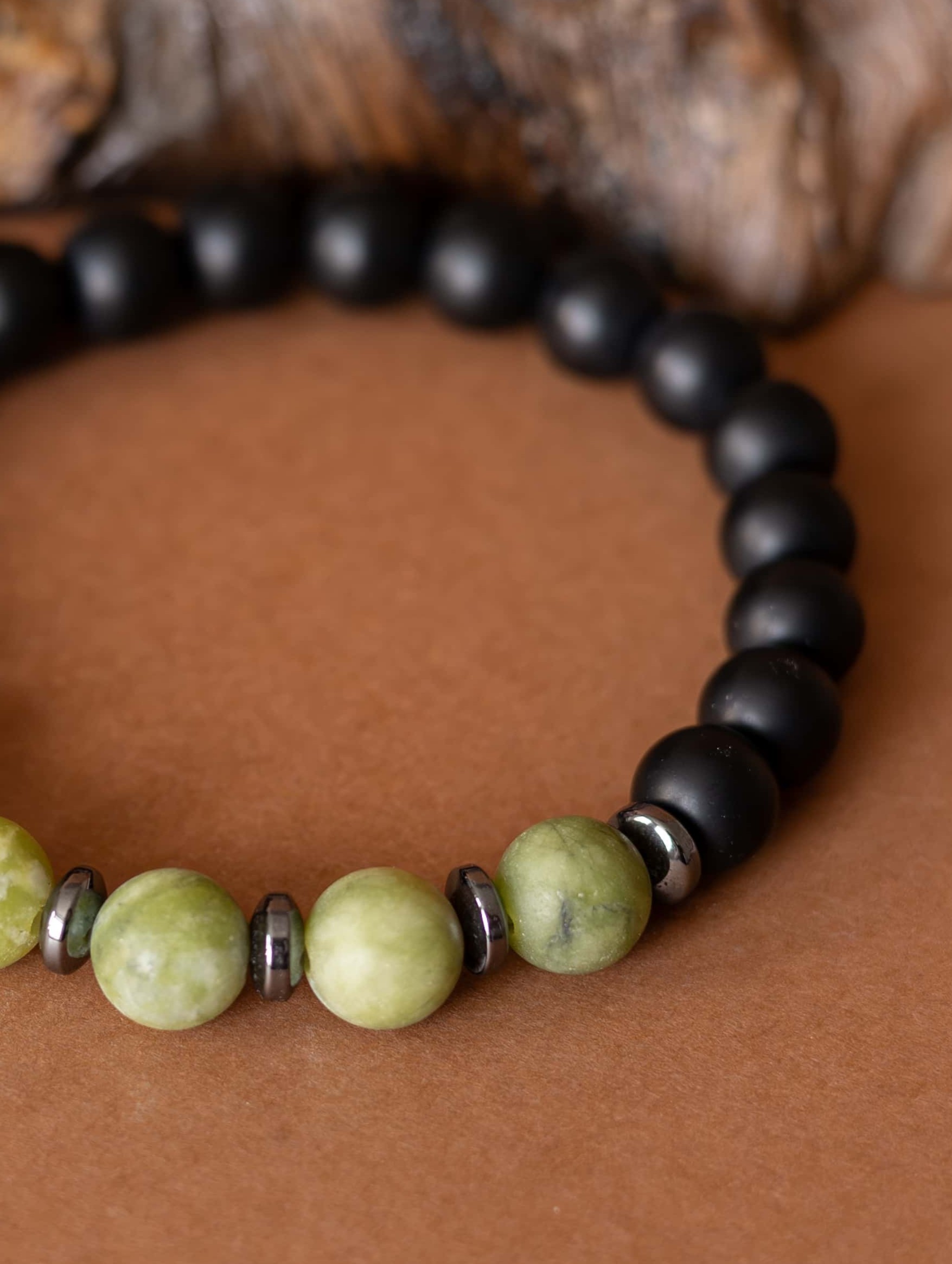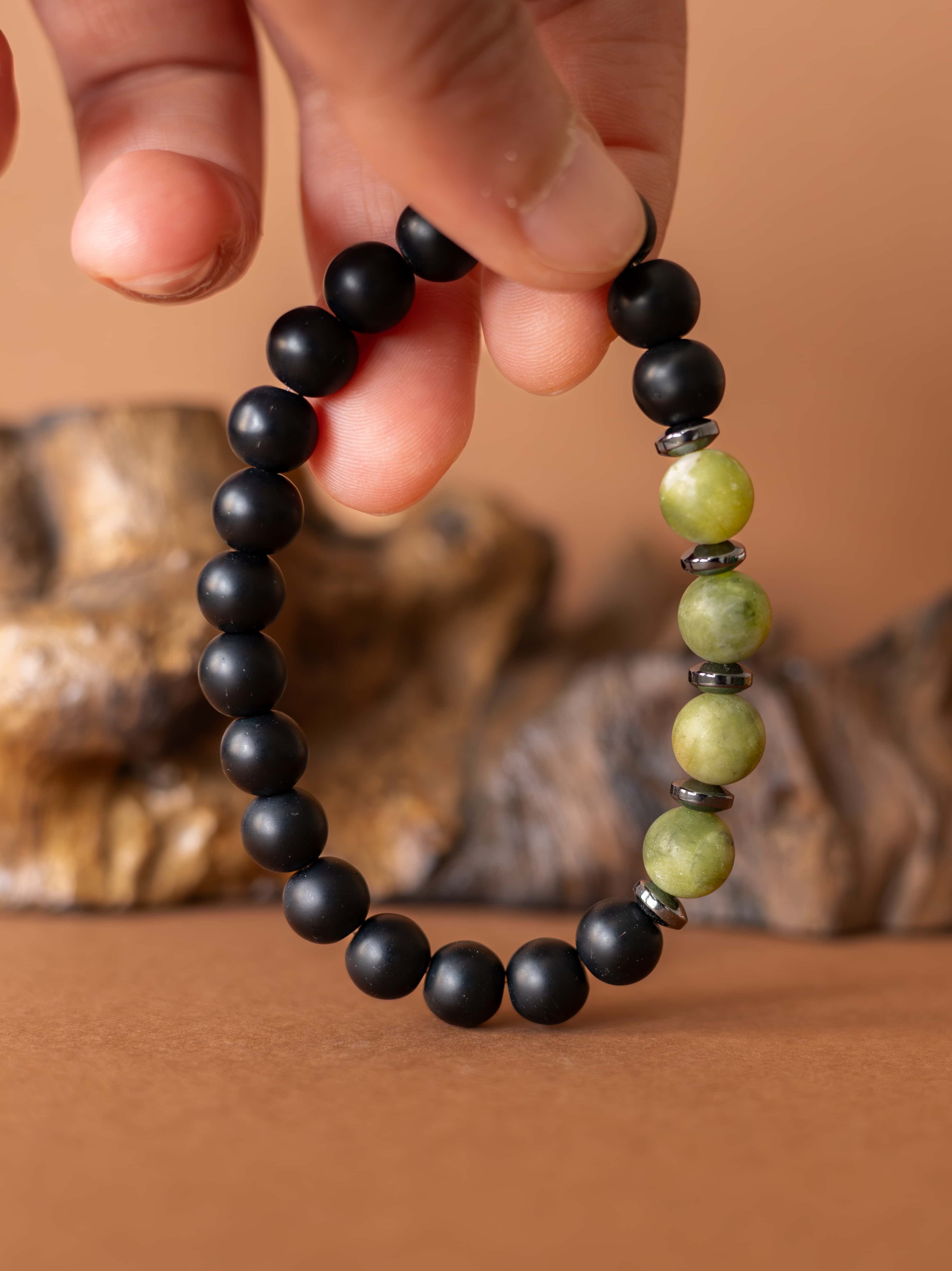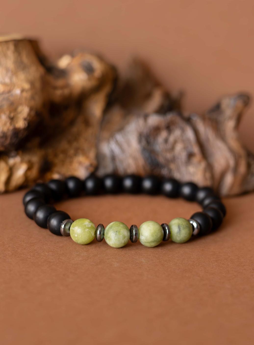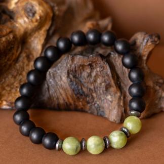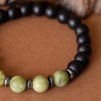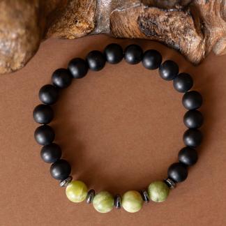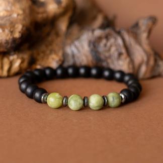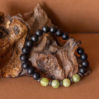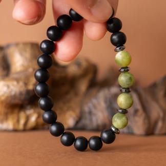 Kombinace zeleného jadeitu, hematitu a černého matného onyxu symbolizuje klidnou sílu, stabilitu a vnitřní soustředění.