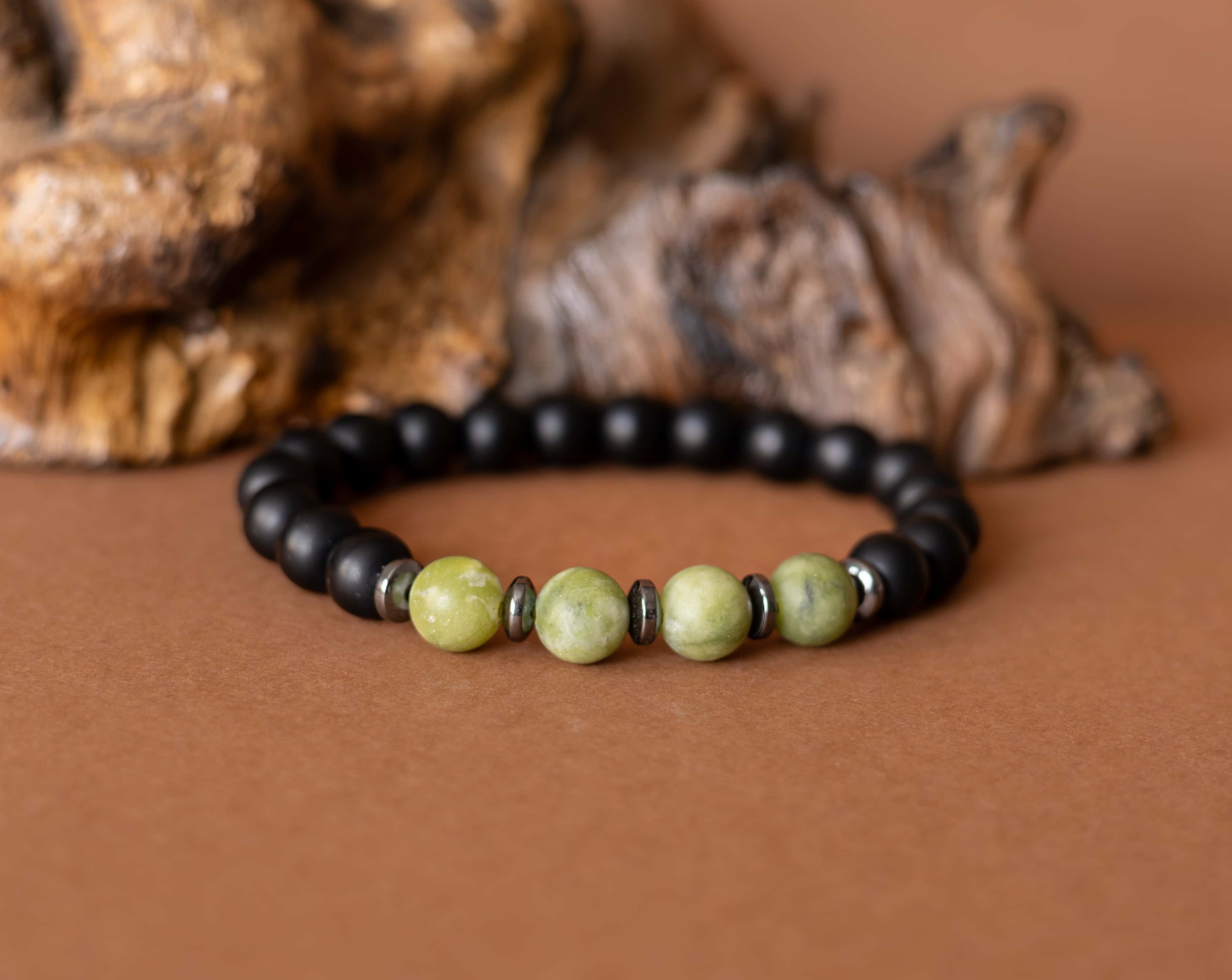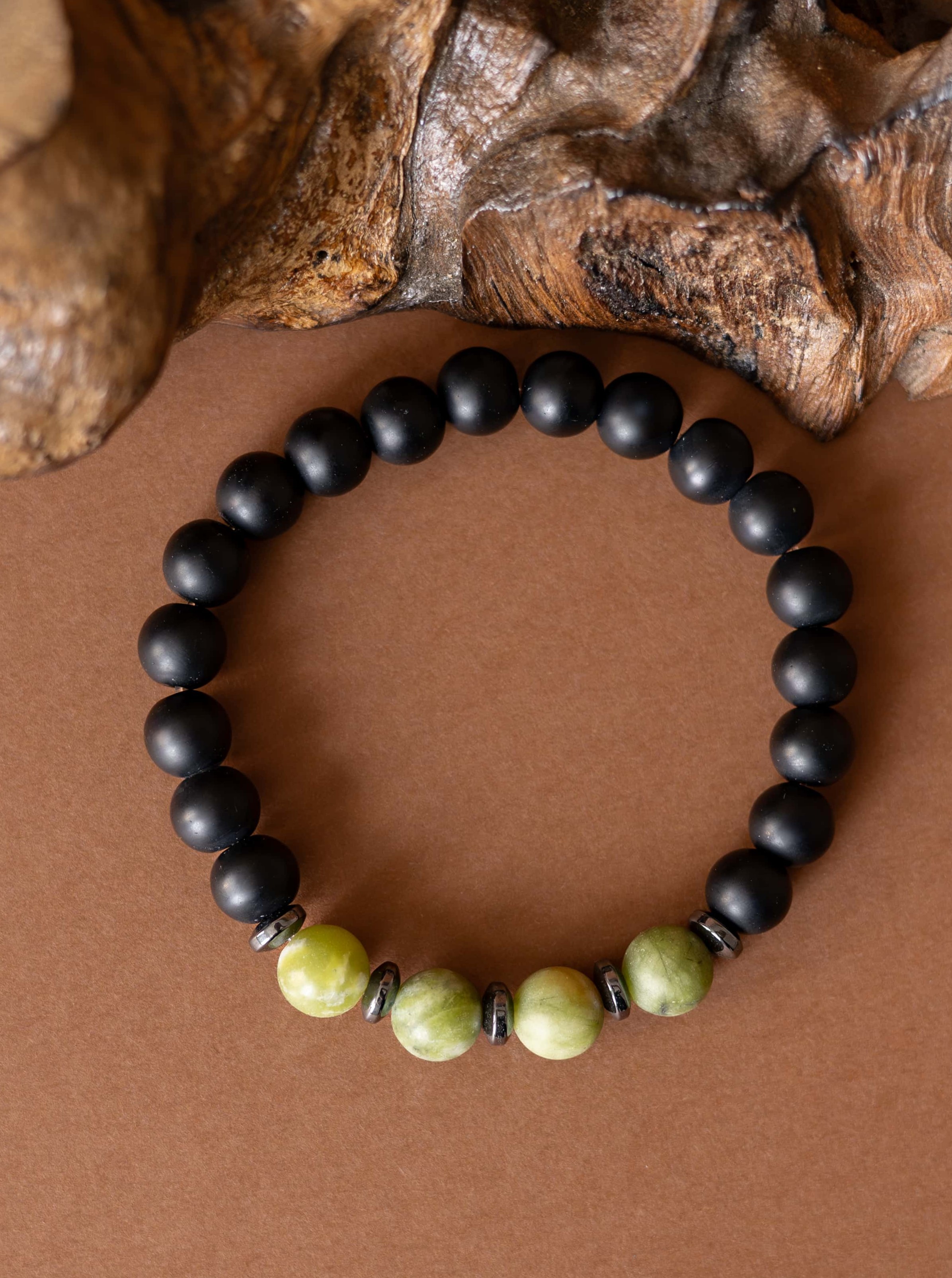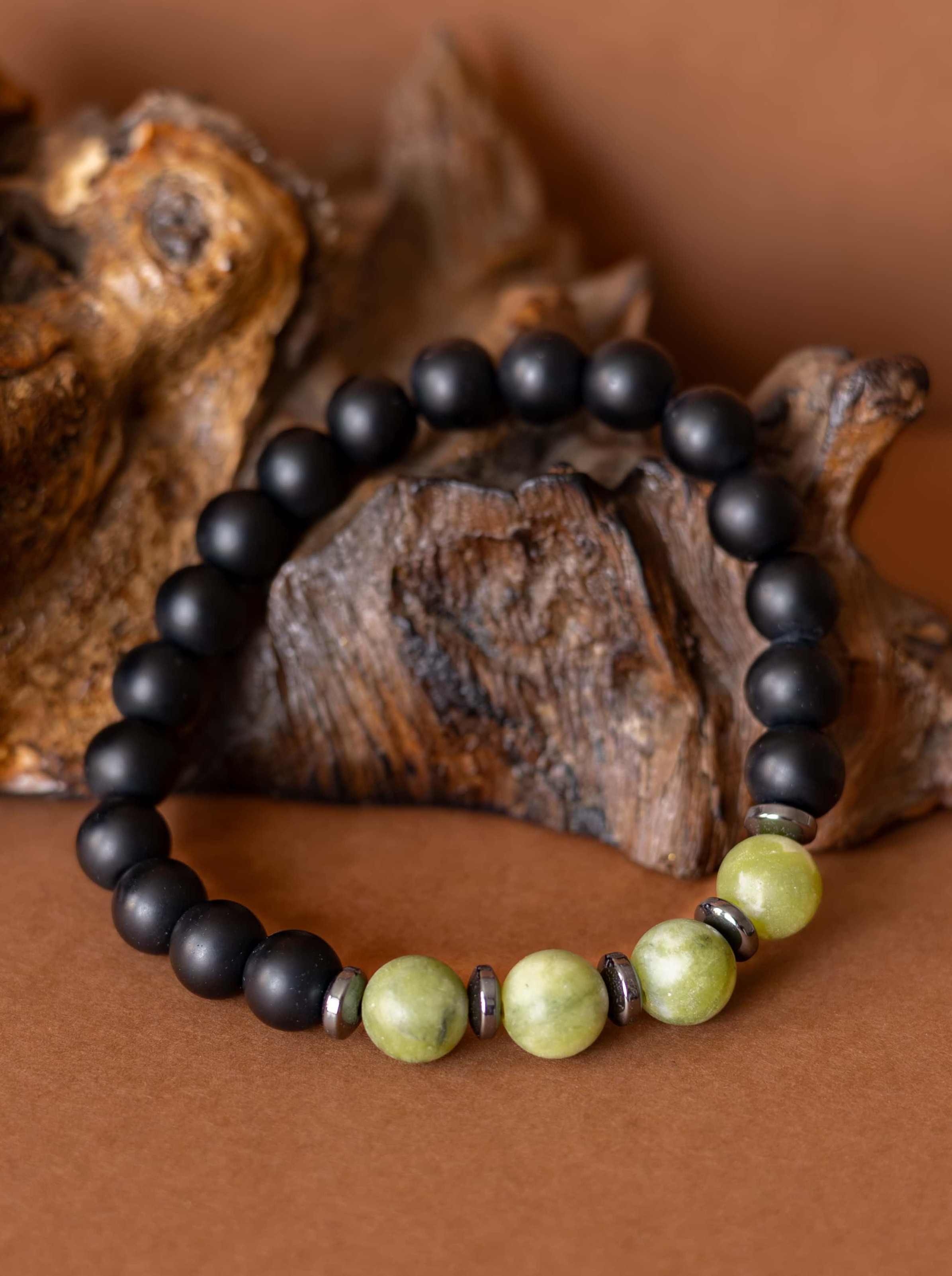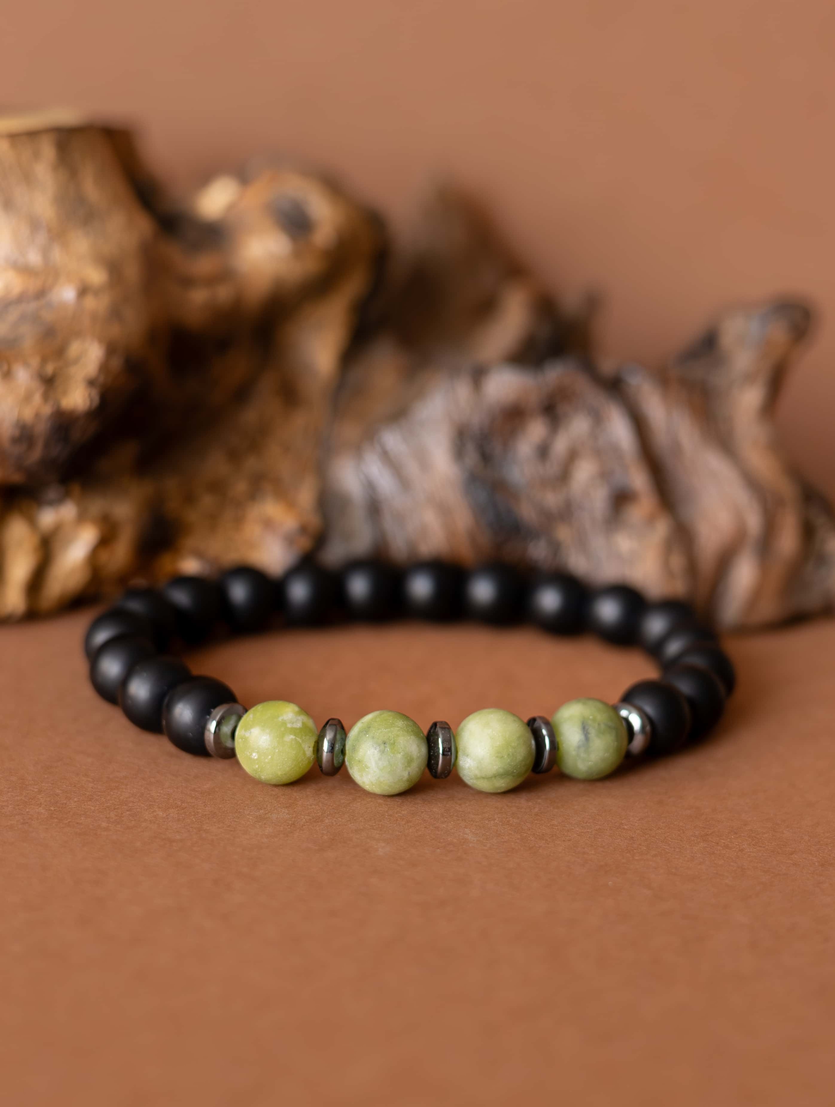 Kombinace zeleného jadeitu, hematitu a černého matného onyxu symbolizuje klidnou sílu, stabilitu a vnitřní soustředění.