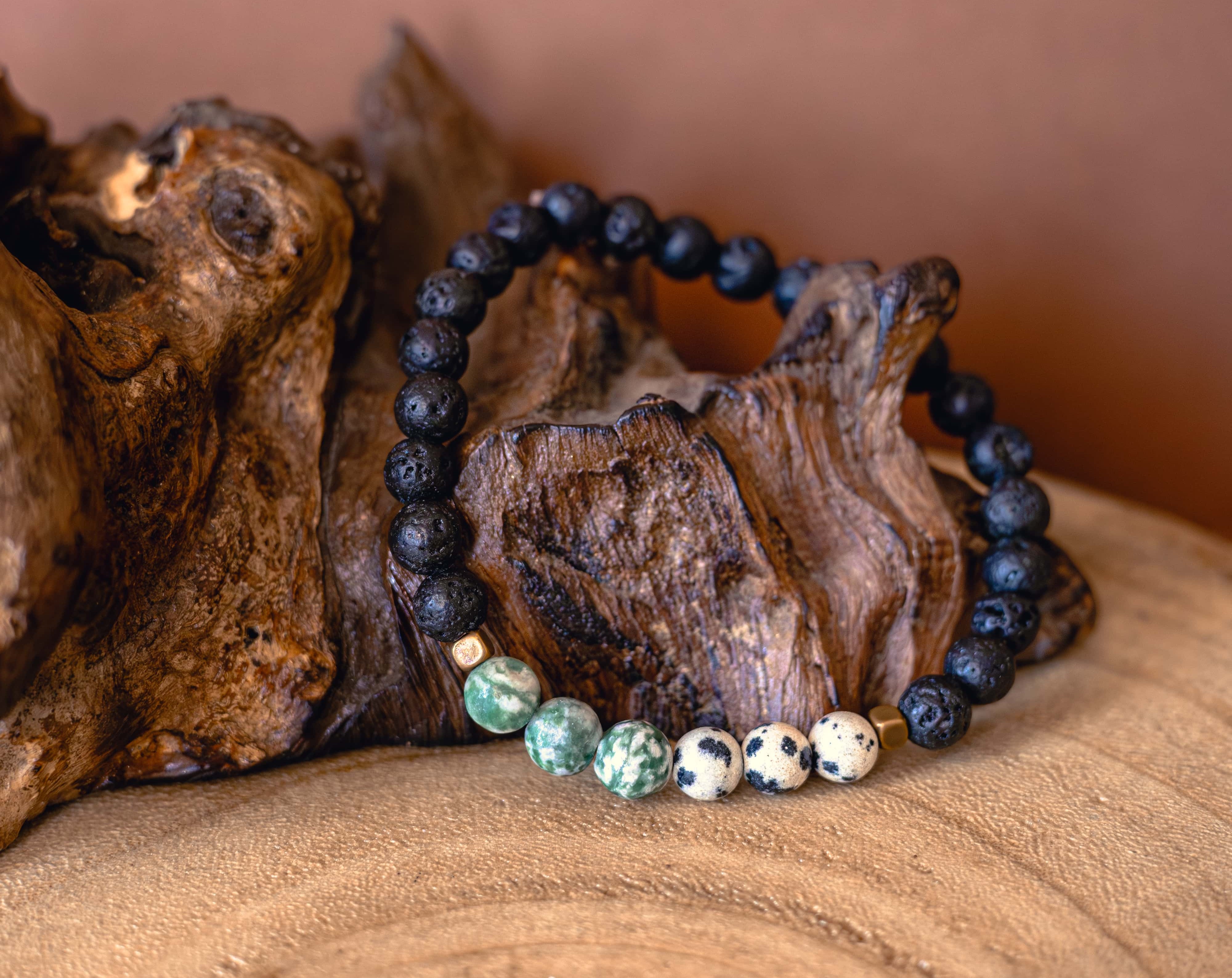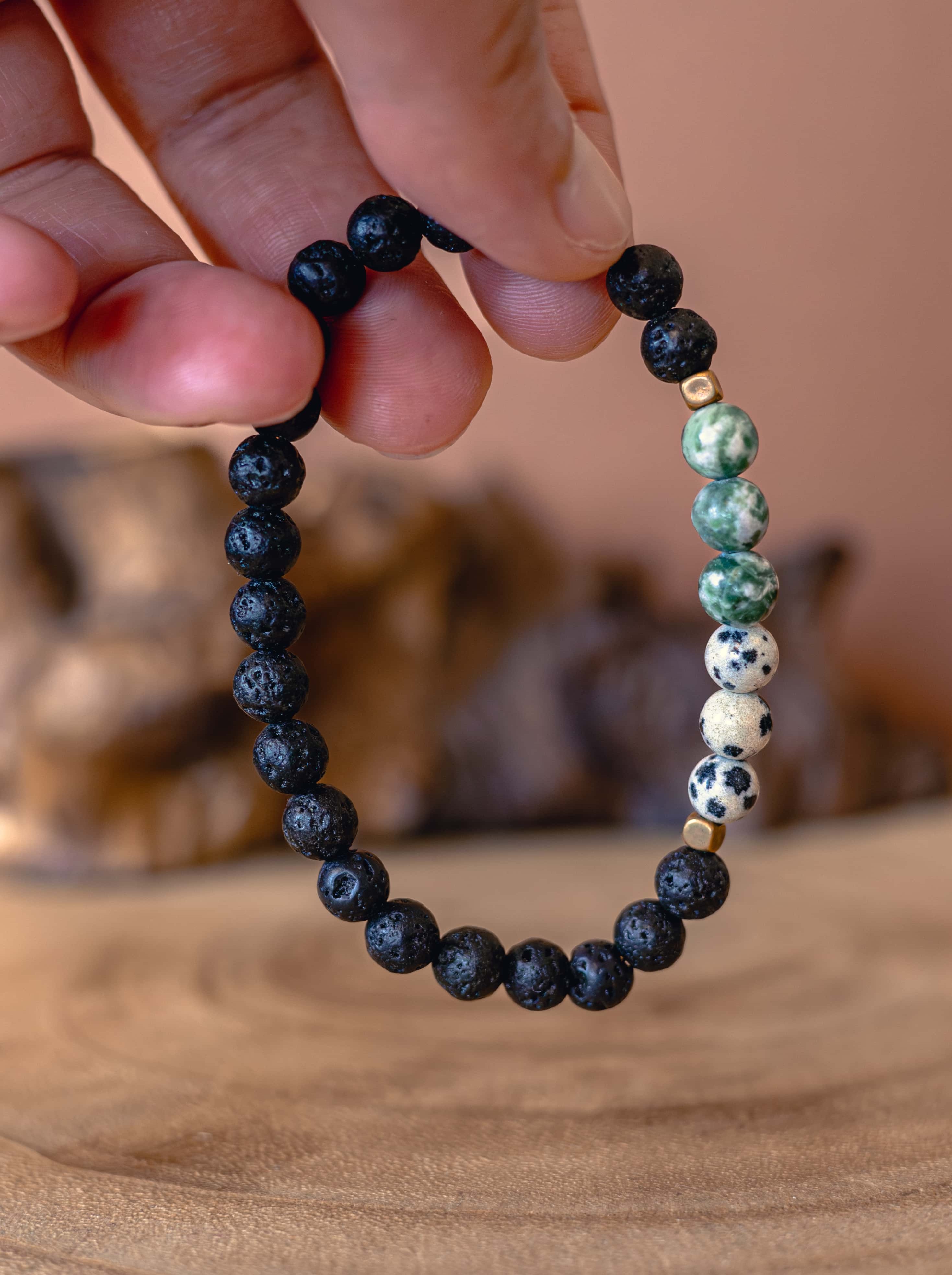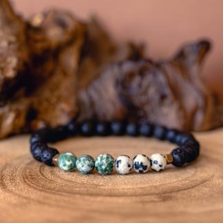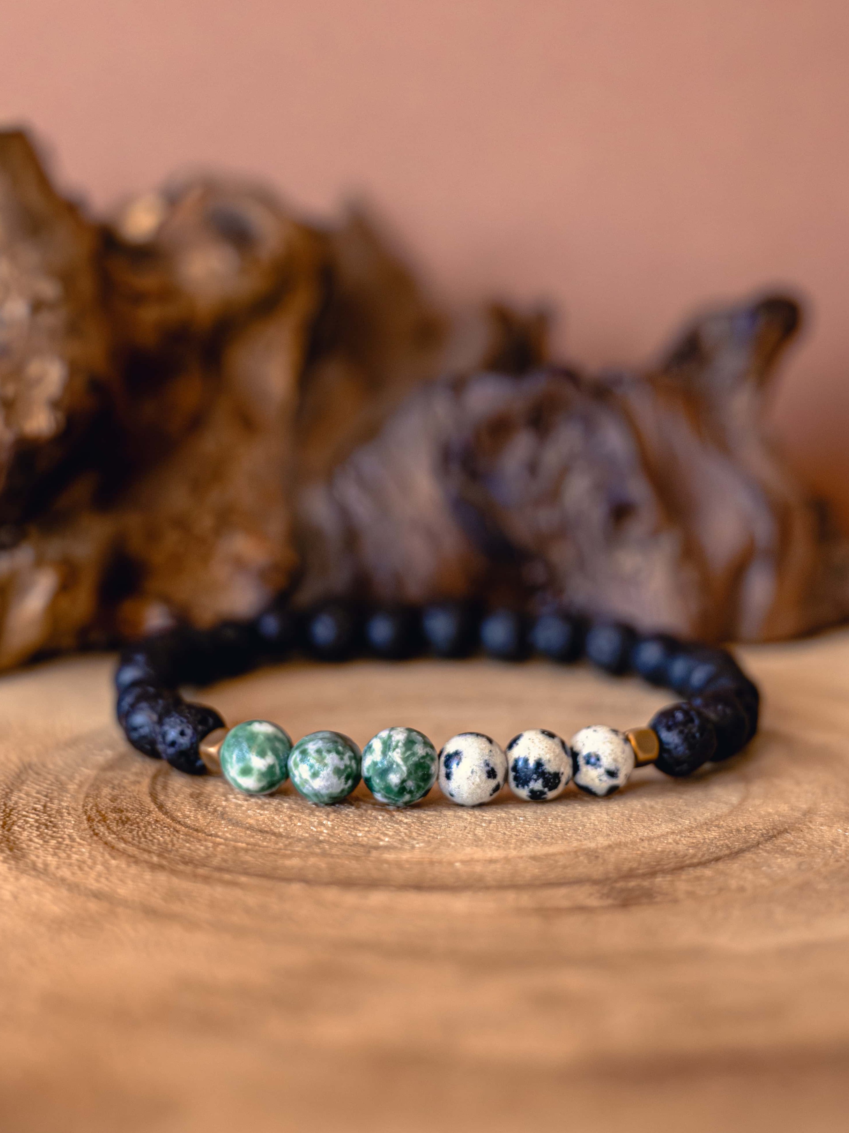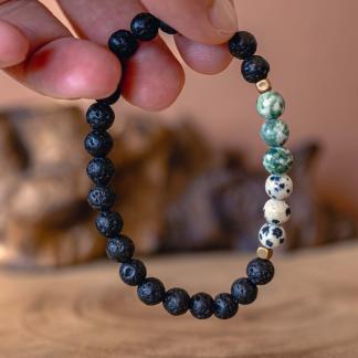 Lávový kámen podporuje odolnost a vnitřní sílu, mechový achát přináší rovnováhu a harmonii, zatímco dalmatin jaspis pomáhá chránit před negativními vlivy a posiluje duševní stabilitu.