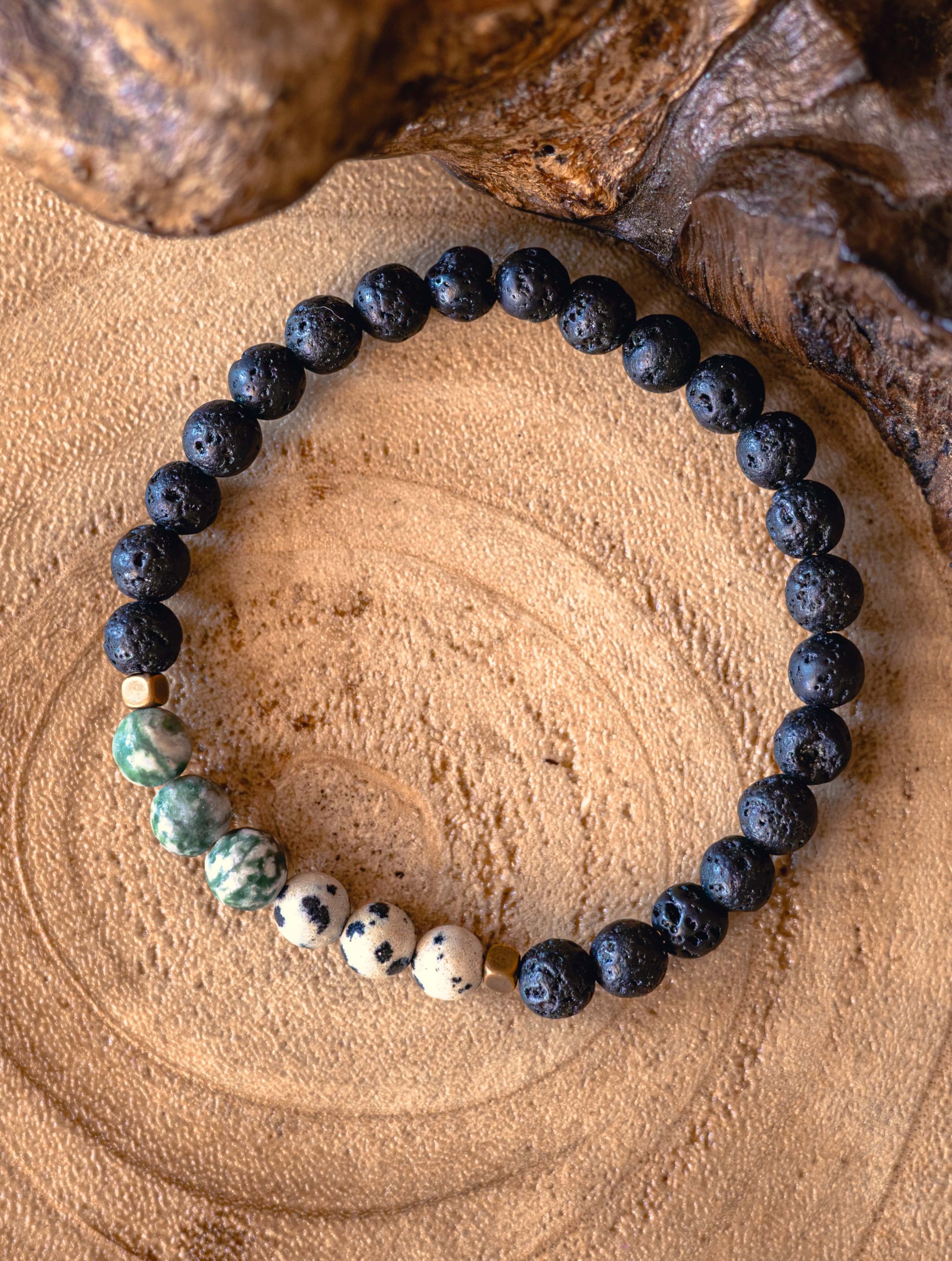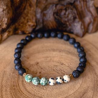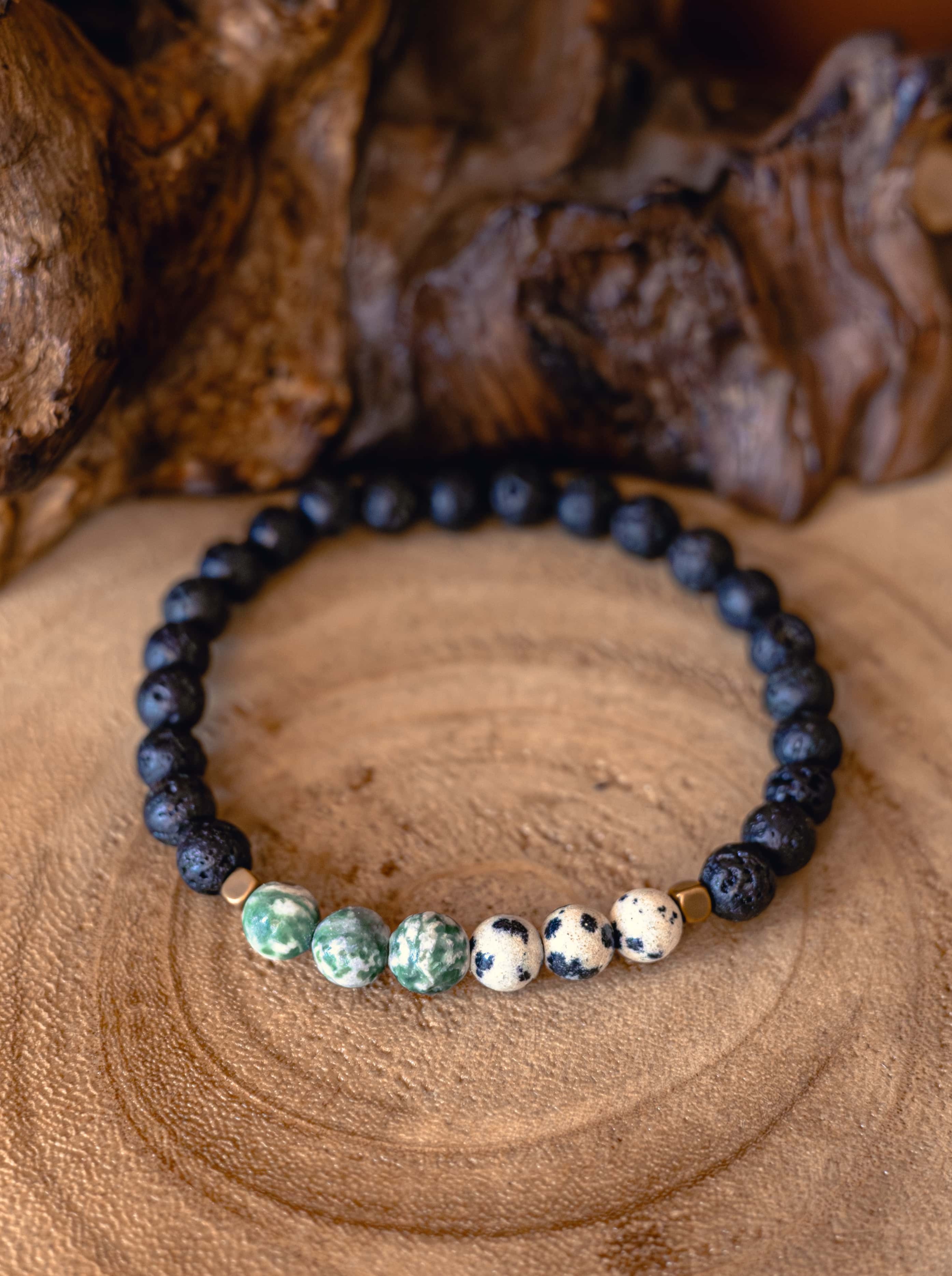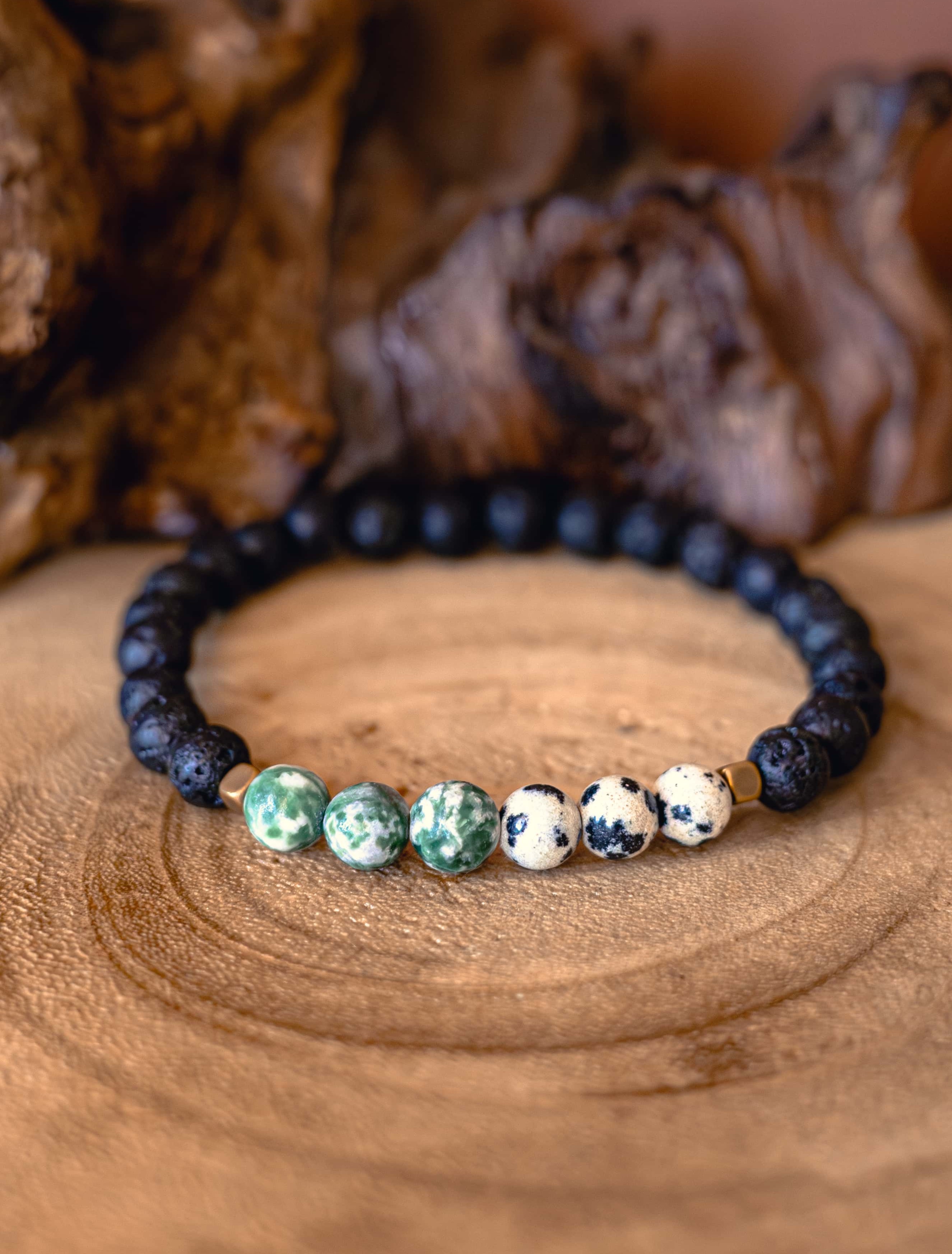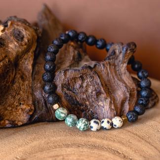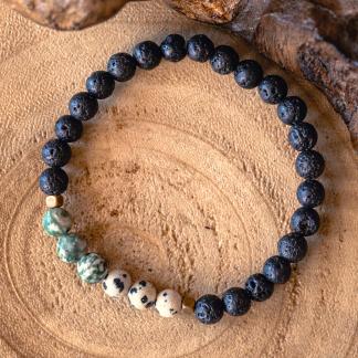 Lávový kámen podporuje odolnost a vnitřní sílu, mechový achát přináší rovnováhu a harmonii, zatímco dalmatin jaspis pomáhá chránit před negativními vlivy a posiluje duševní stabilitu.