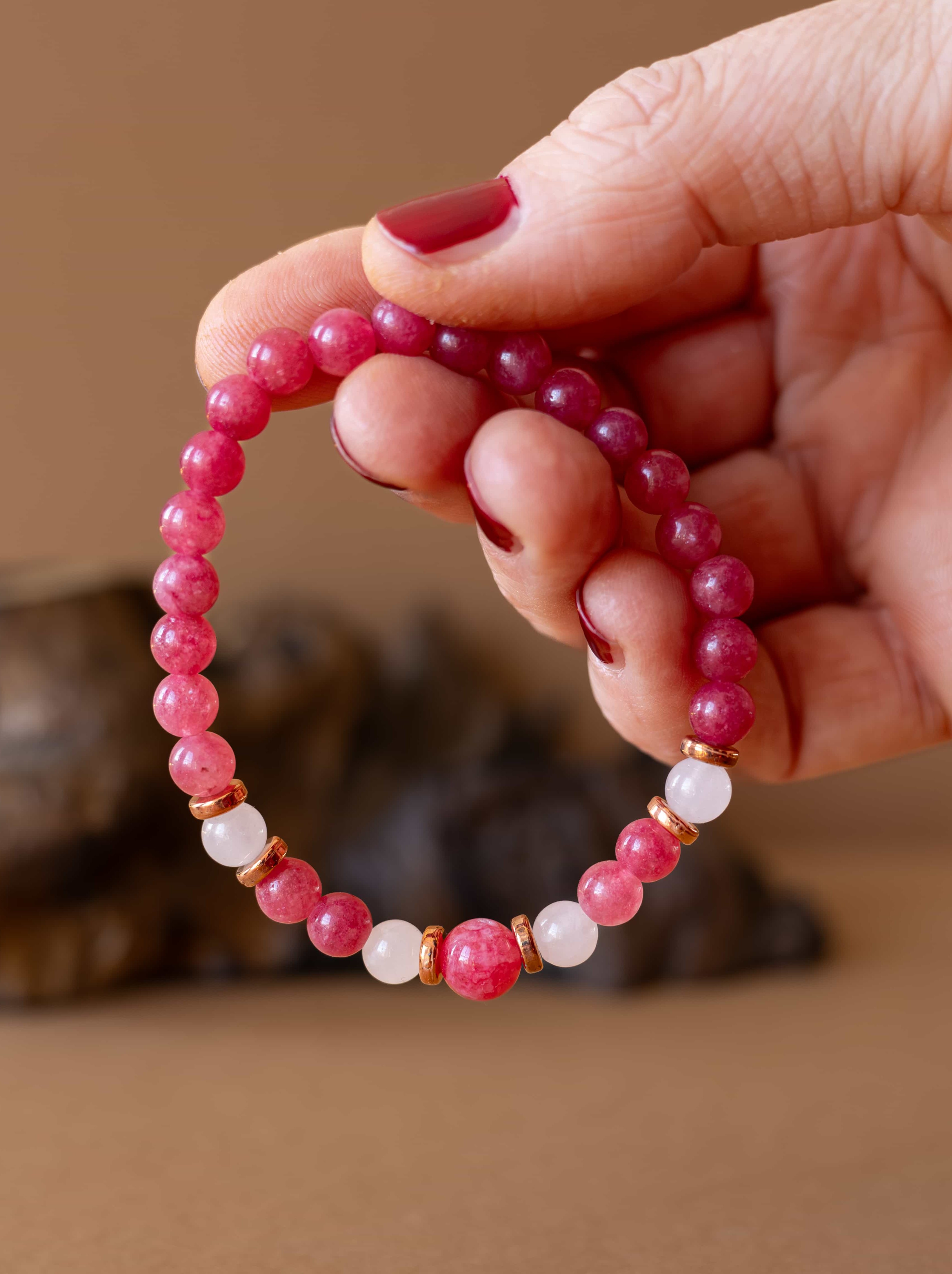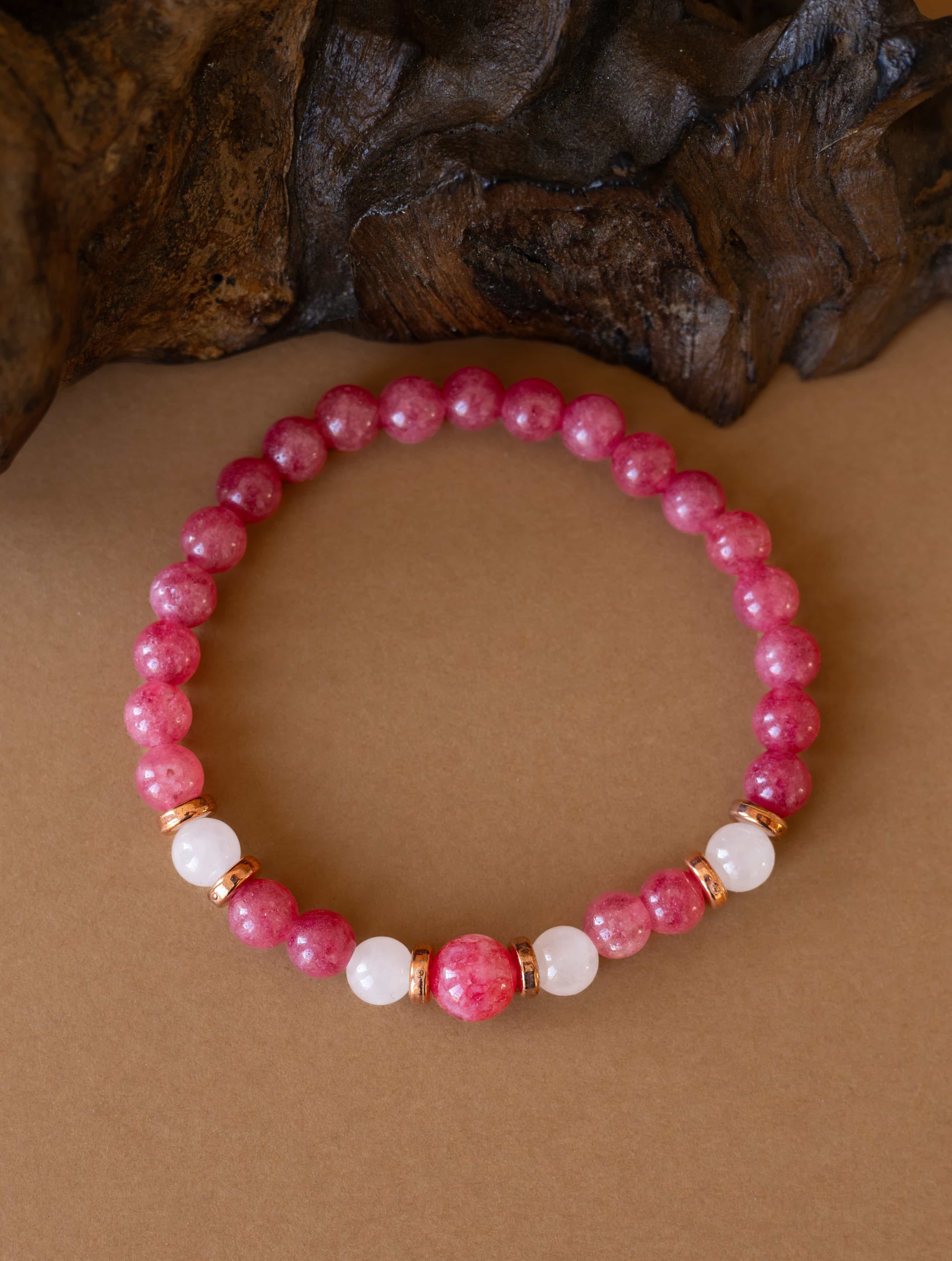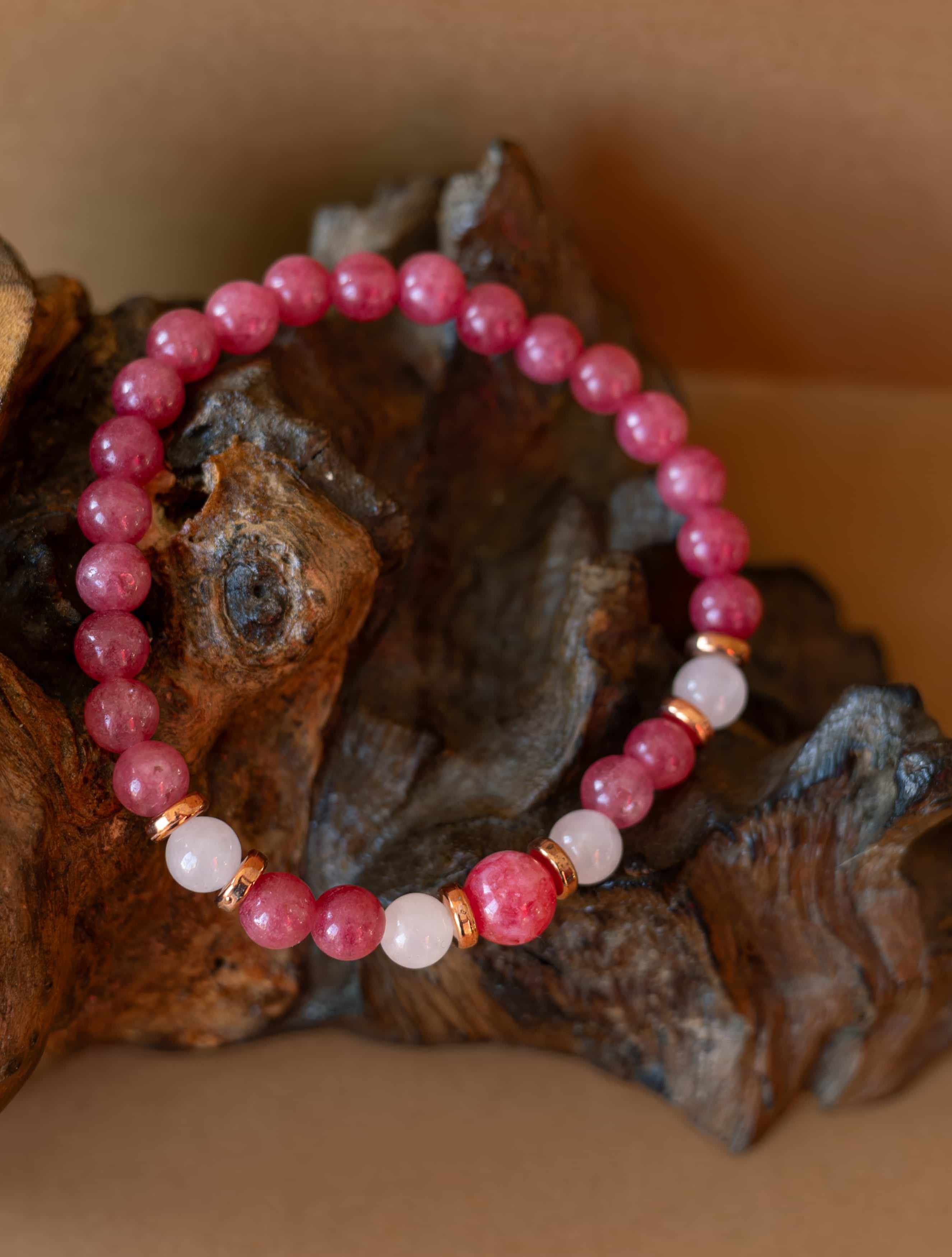 Náramek Jemnost je oslavou něhy, lásky a vnitřní harmonie. Spojení brazilského rodonitu a růženínu vytváří vyváženou kombinaci podporující sebelásku, emocionální rovnováhu a harmonické vztahy.