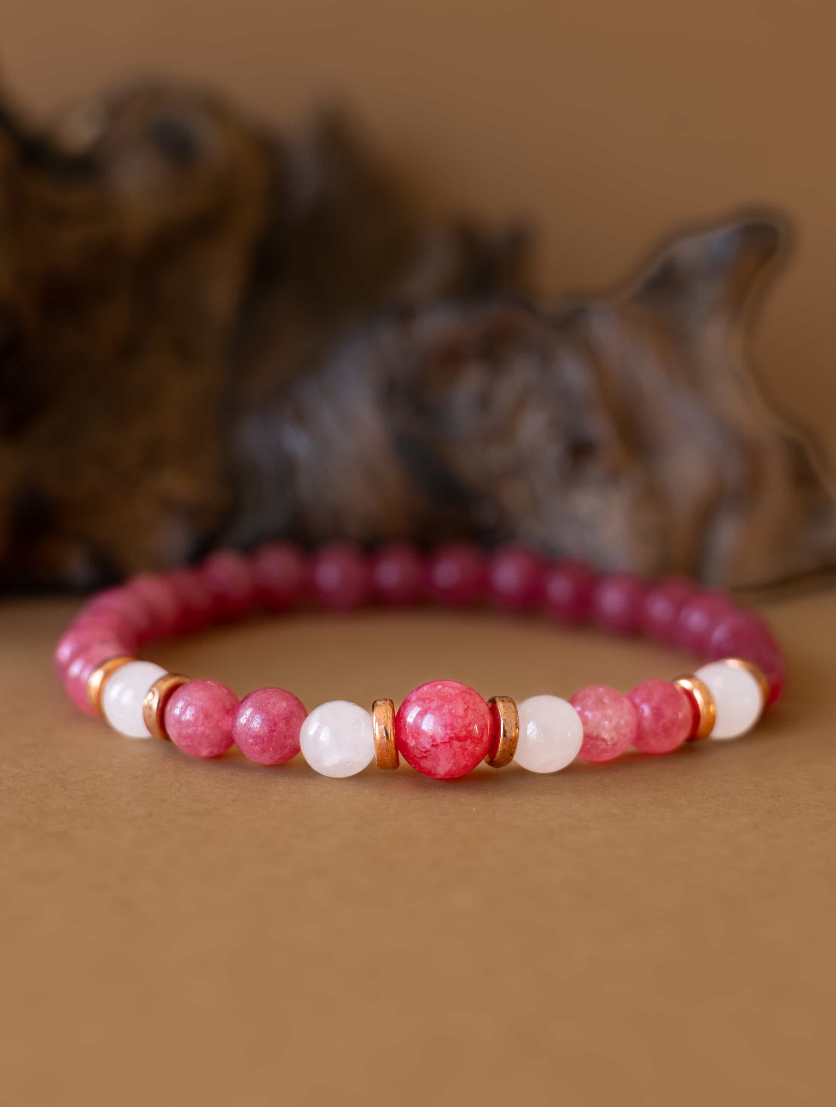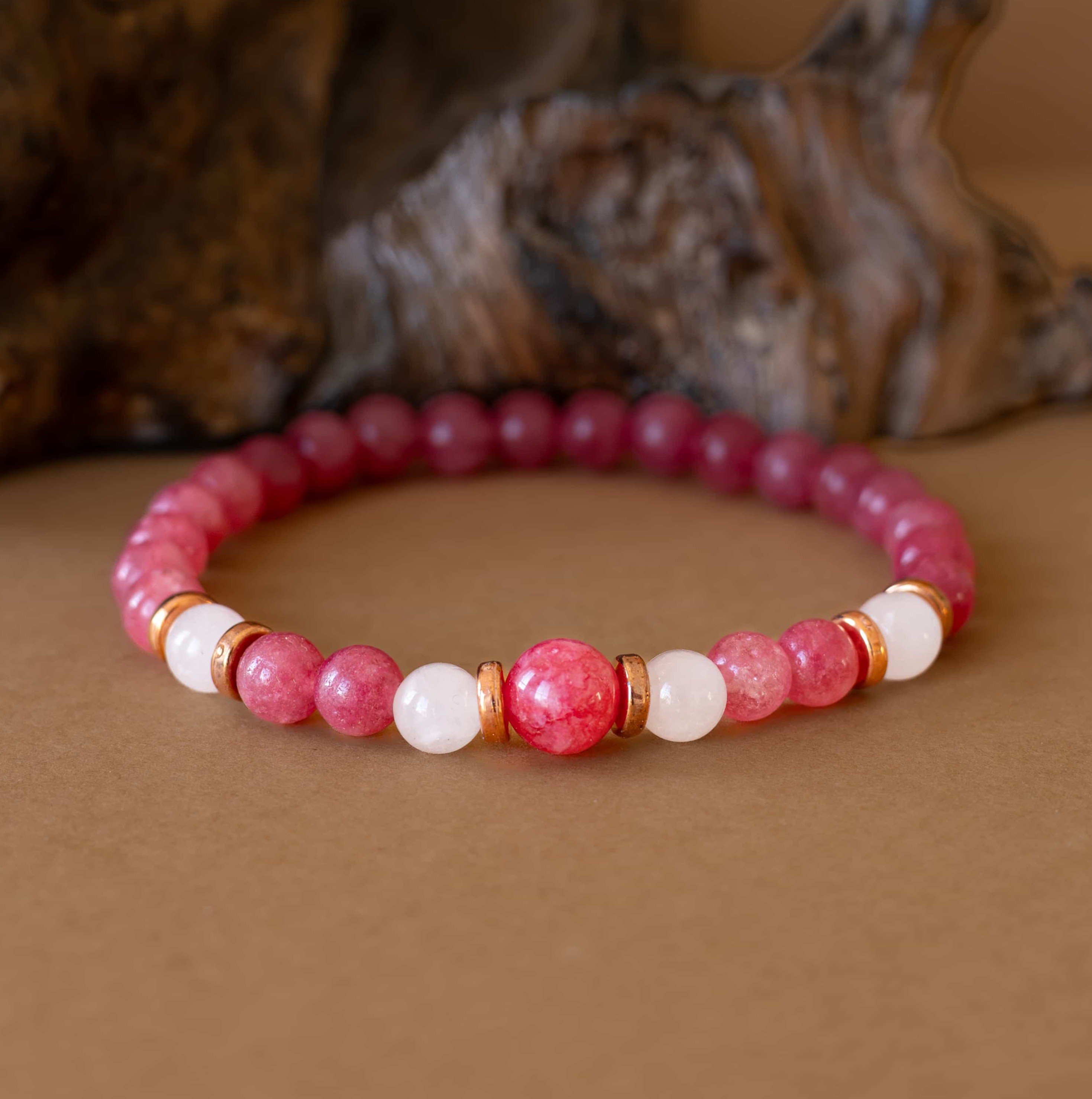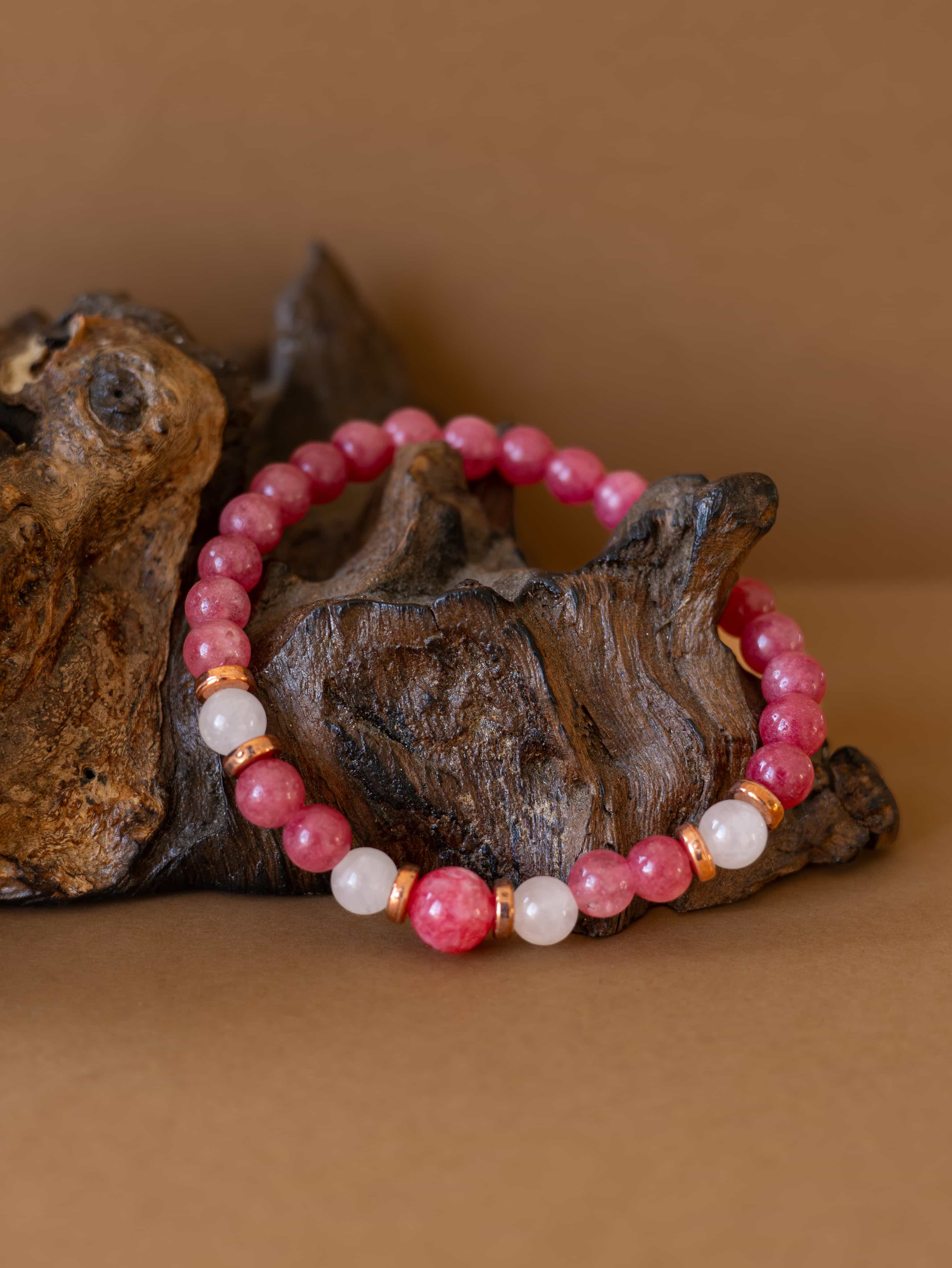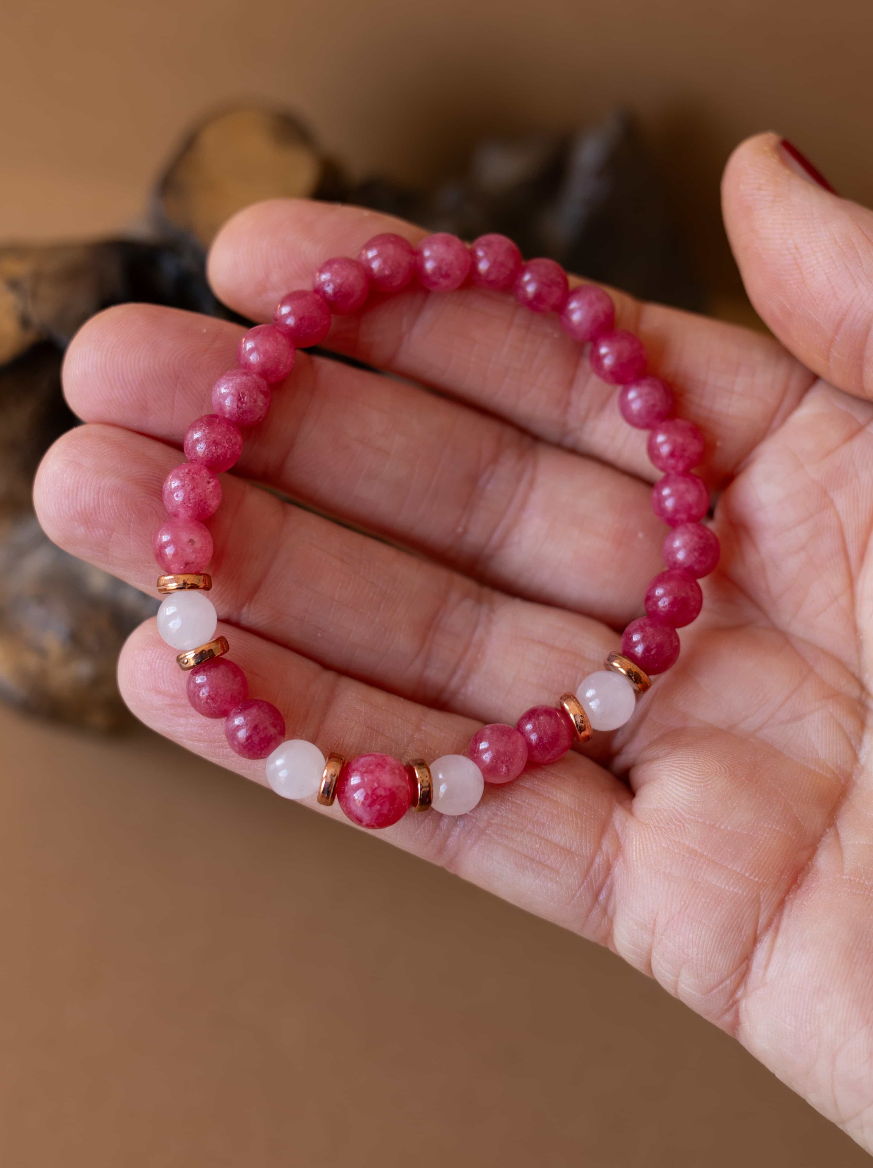 Náramek Jemnost je oslavou něhy, lásky a vnitřní harmonie. Spojení brazilského rodonitu a růženínu vytváří vyváženou kombinaci podporující sebelásku, emocionální rovnováhu a harmonické vztahy.