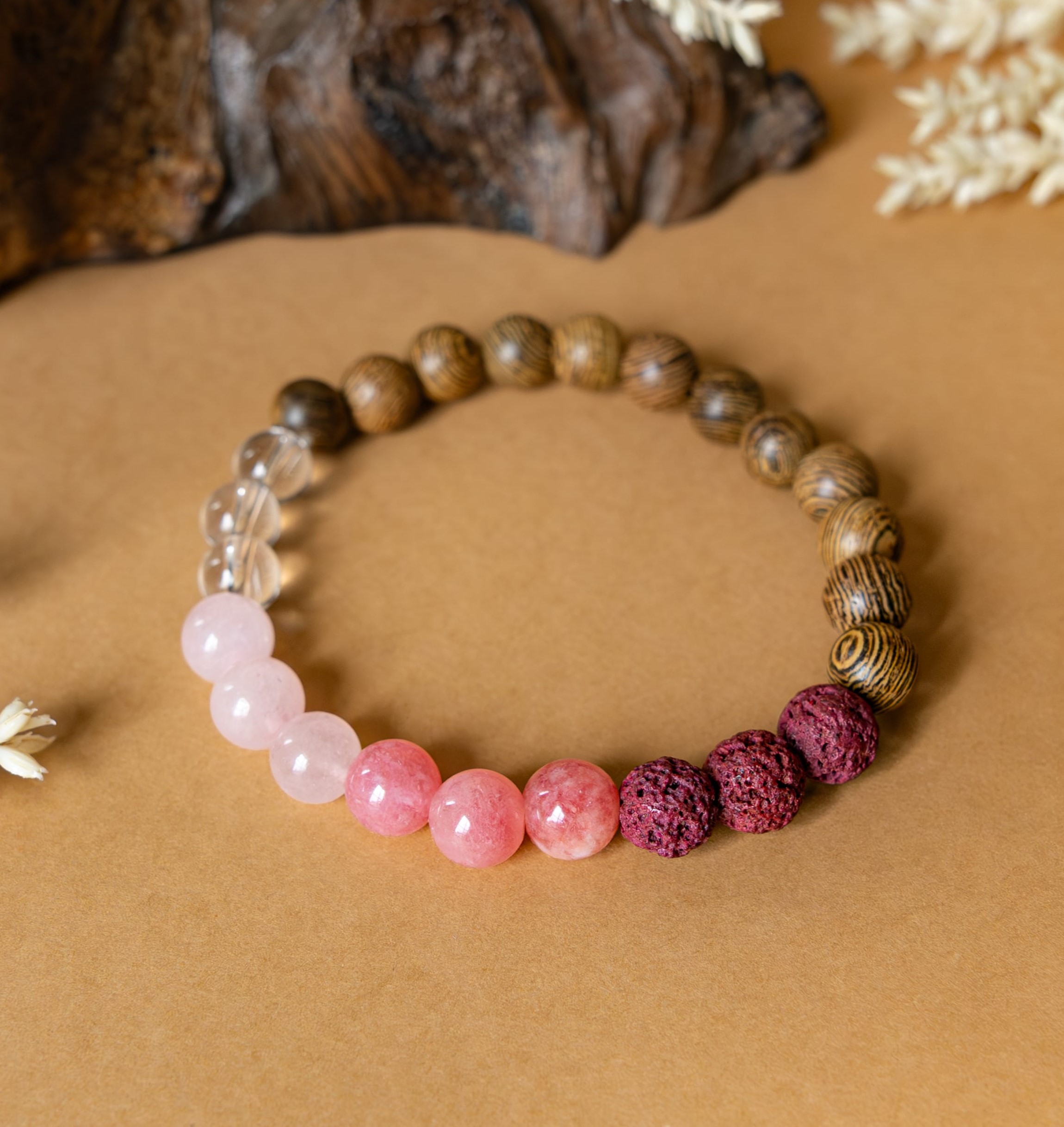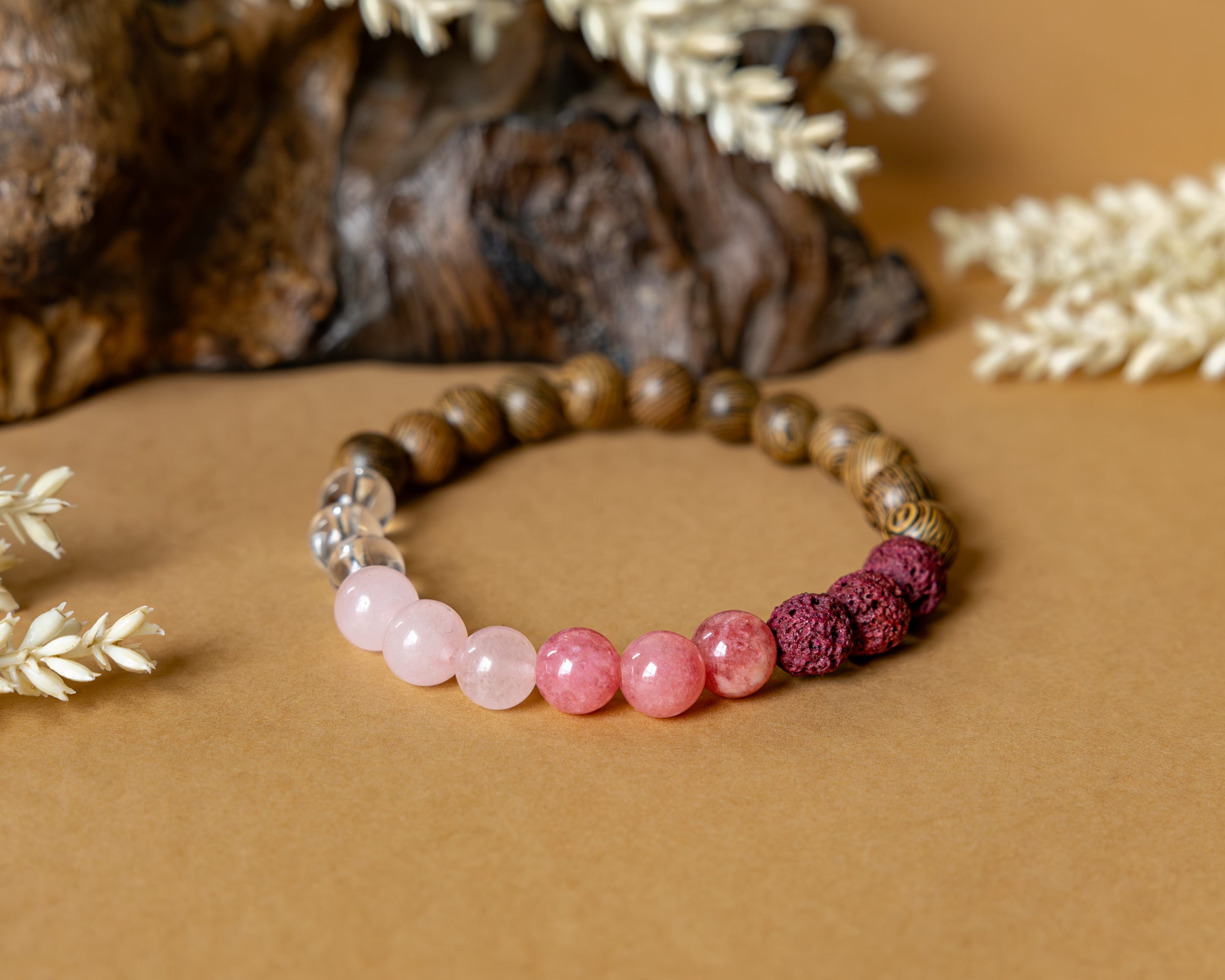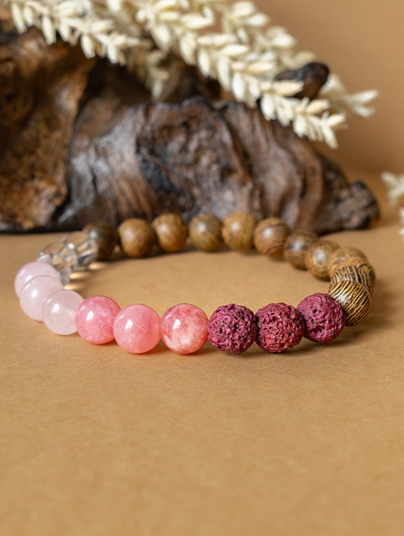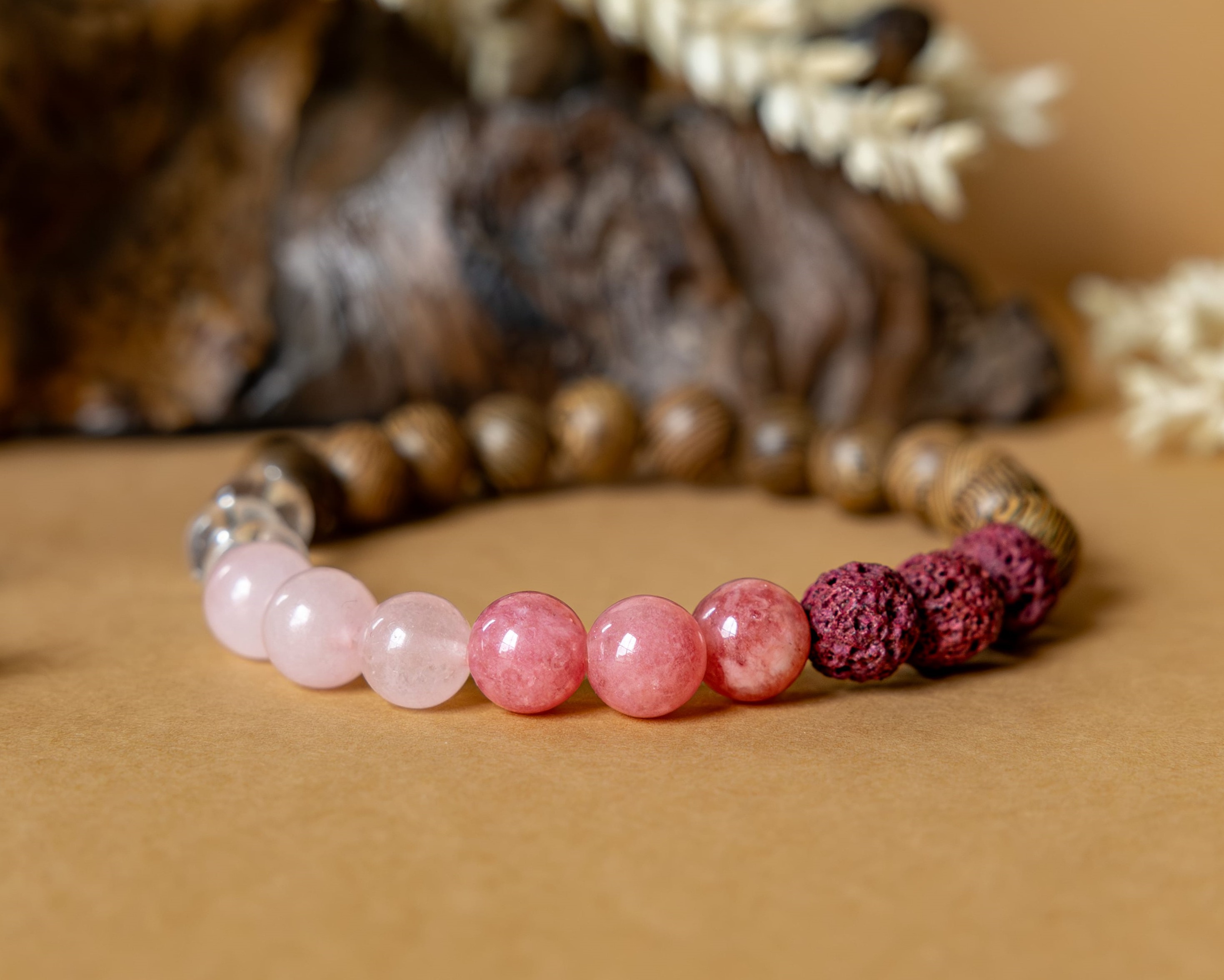 Kombinace červené lávy, rodonchrozitu, růženínu a křišťálu symbolizuje vášeň, vnitřní harmonii a čistotu duše. Červená láva přináší energii a odhodlání, rodochrozit podporuje emocionální rovnováhu, růženín je známý jako kámen lásky a křišťál zesiluje pozitivní energii a jasnost myšlení.
