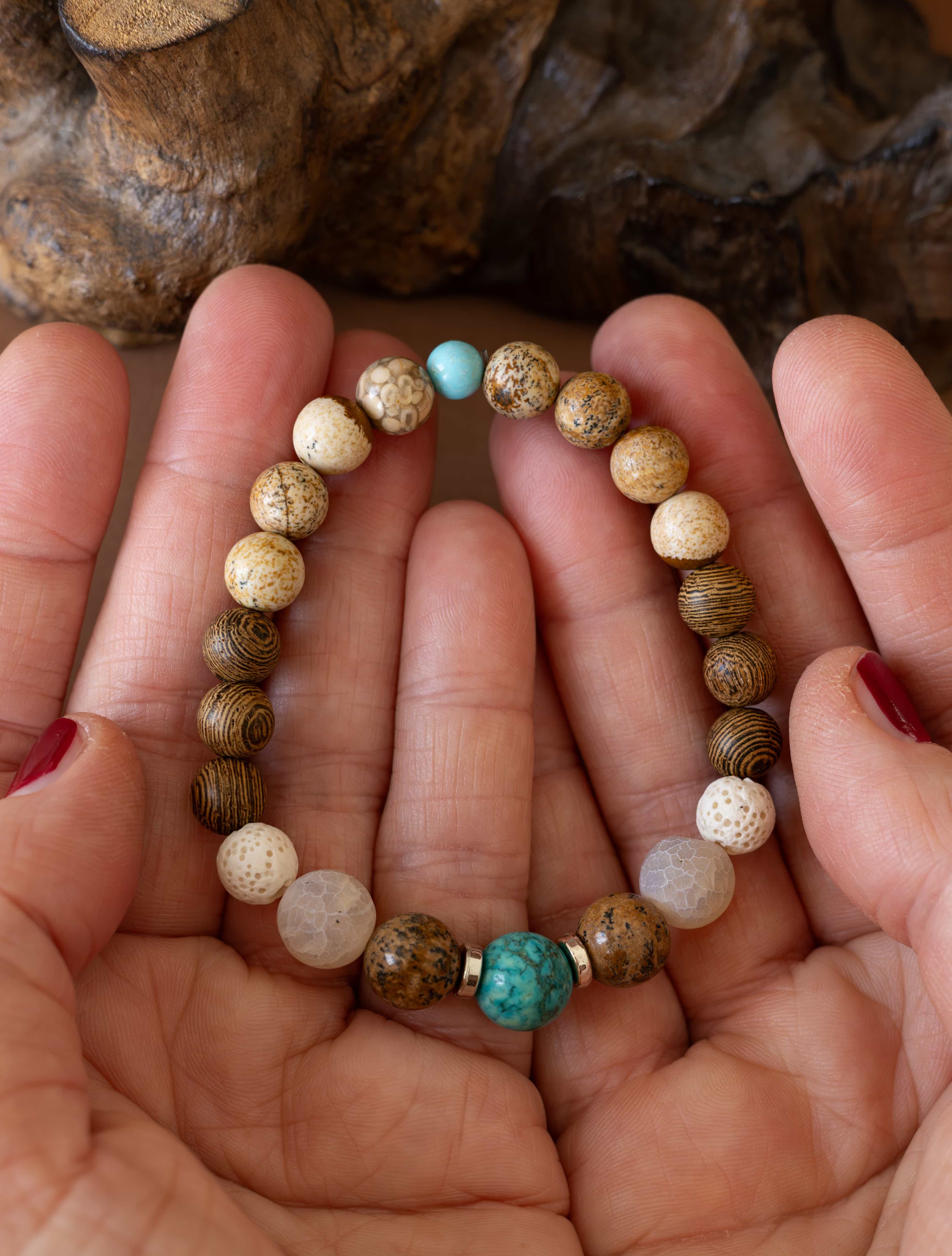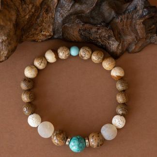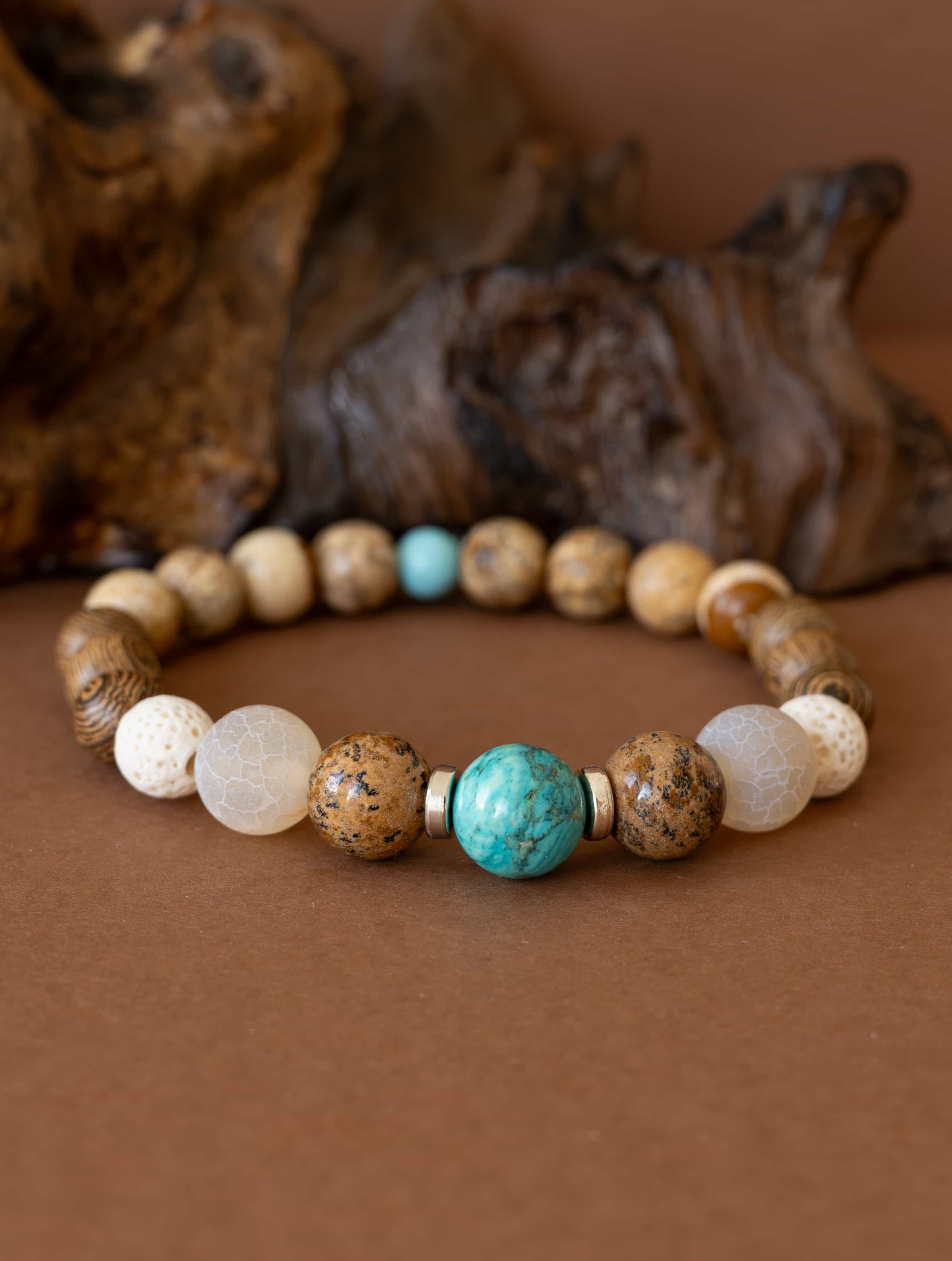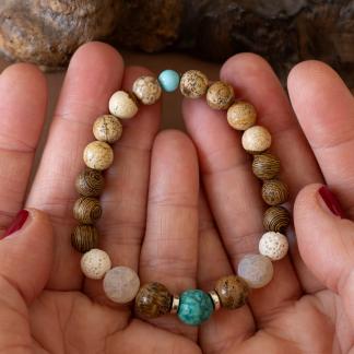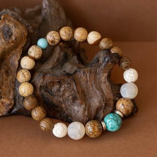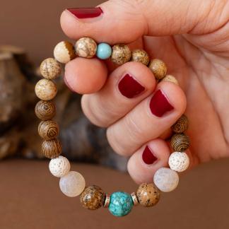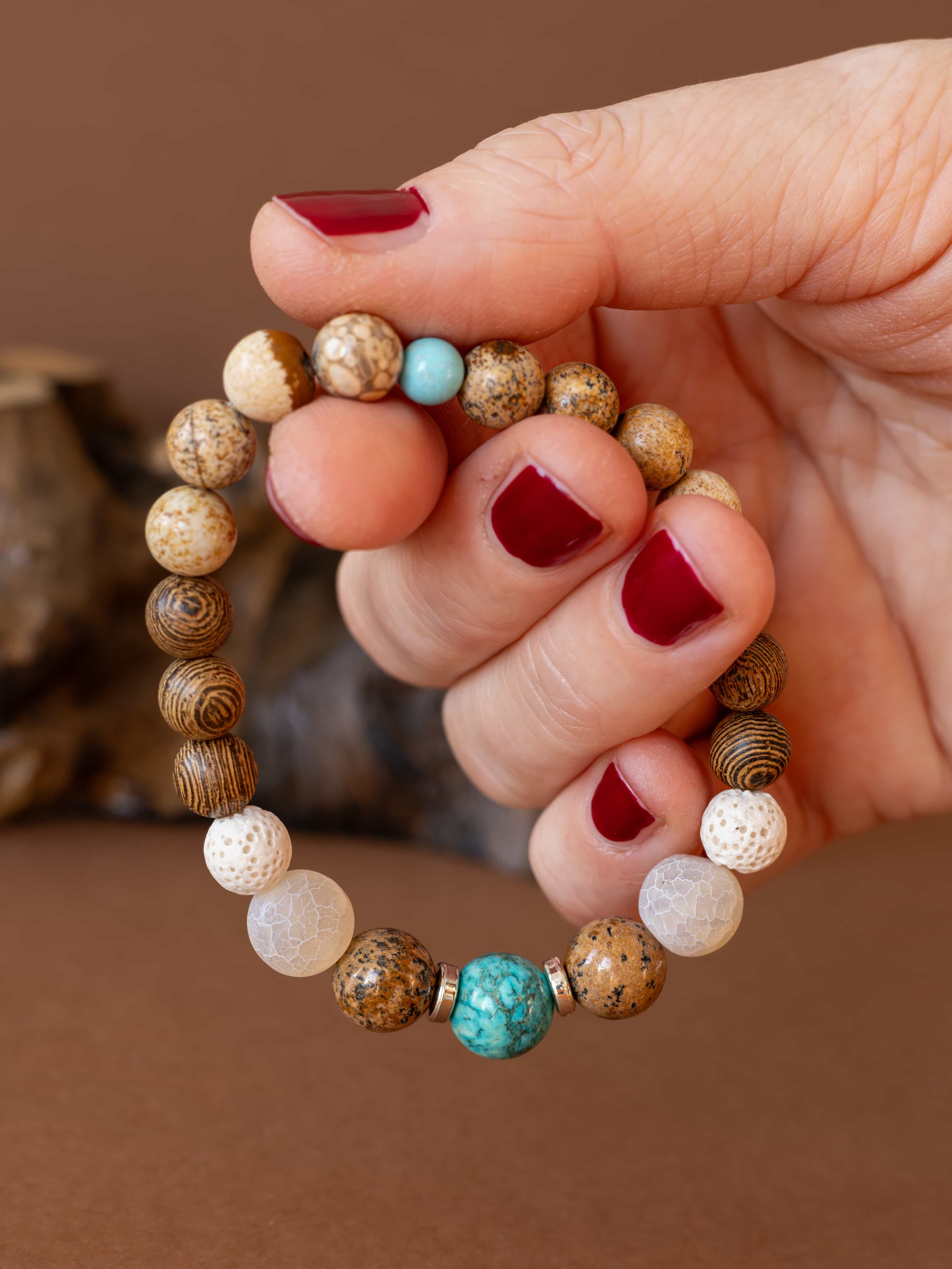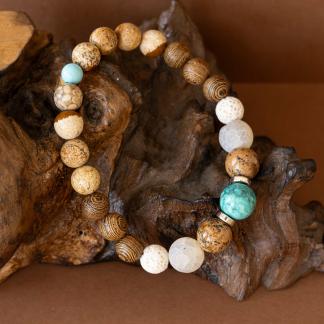Náramek MĚSÍC je navržen pro ty, kteří hledají vnitřní klid a spojení se svým cyklem a cyklem přírody. Kombinace korálků z tyrkysu, bílé lávy, jaspisu a dřeva symbolizuje uzemnění, rovnováhu a propojení s cykly měsíce.