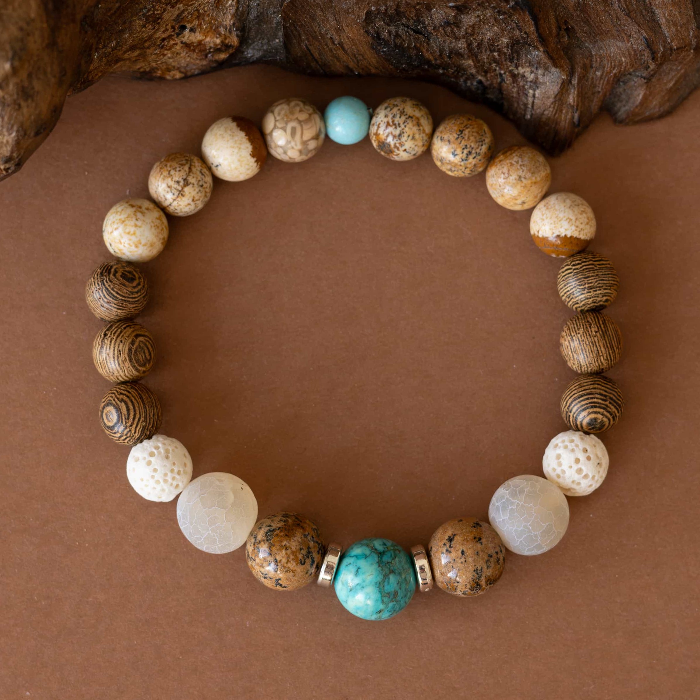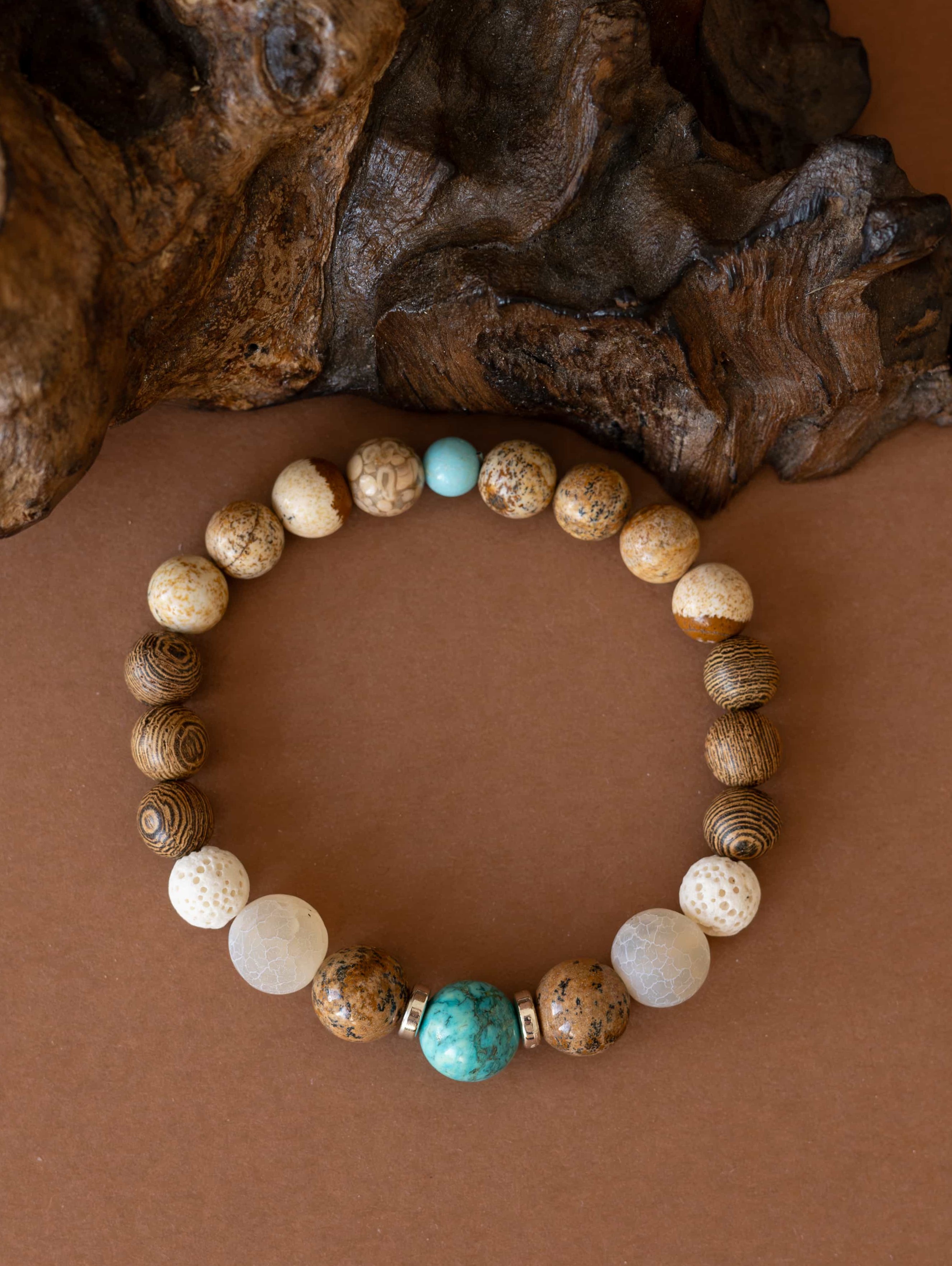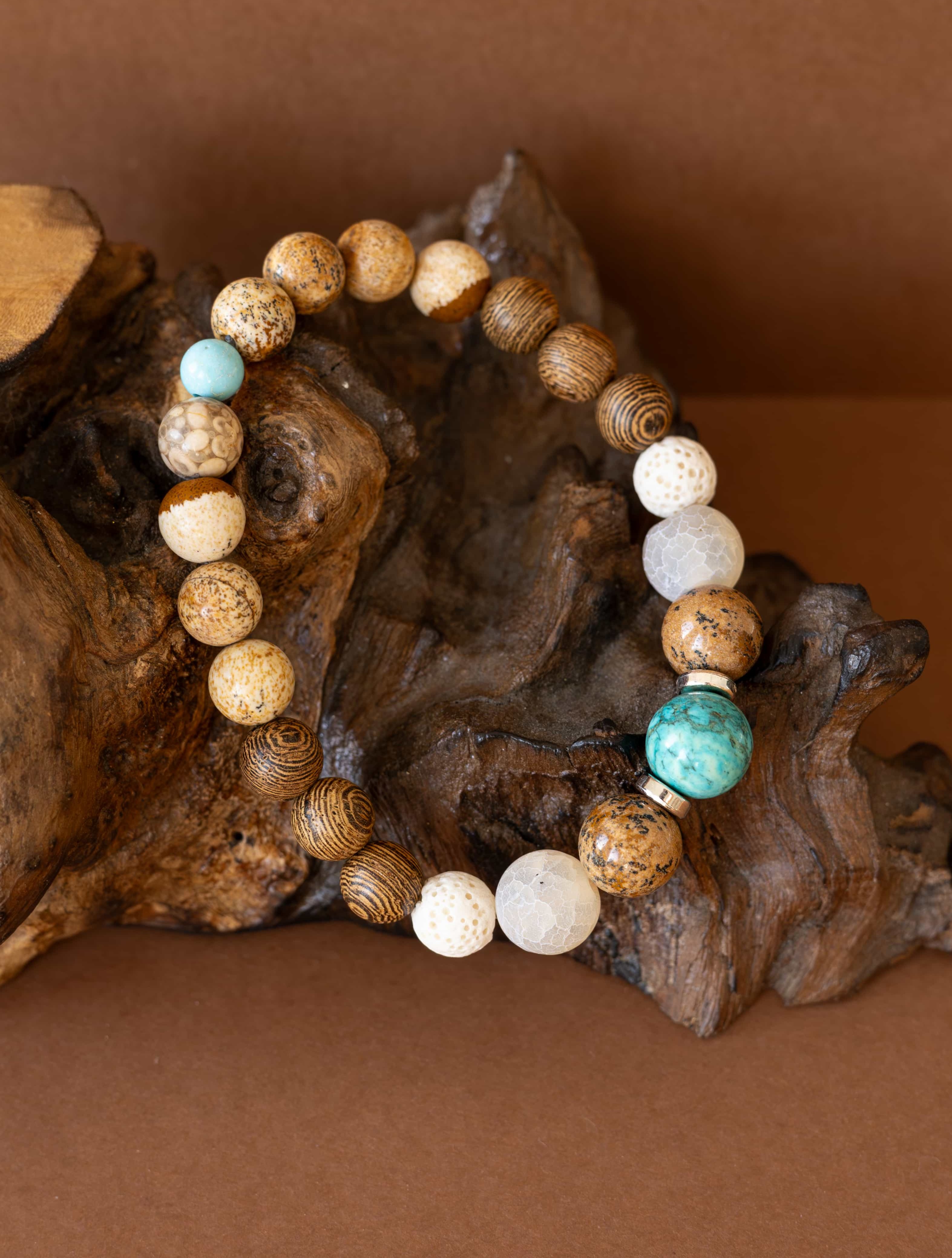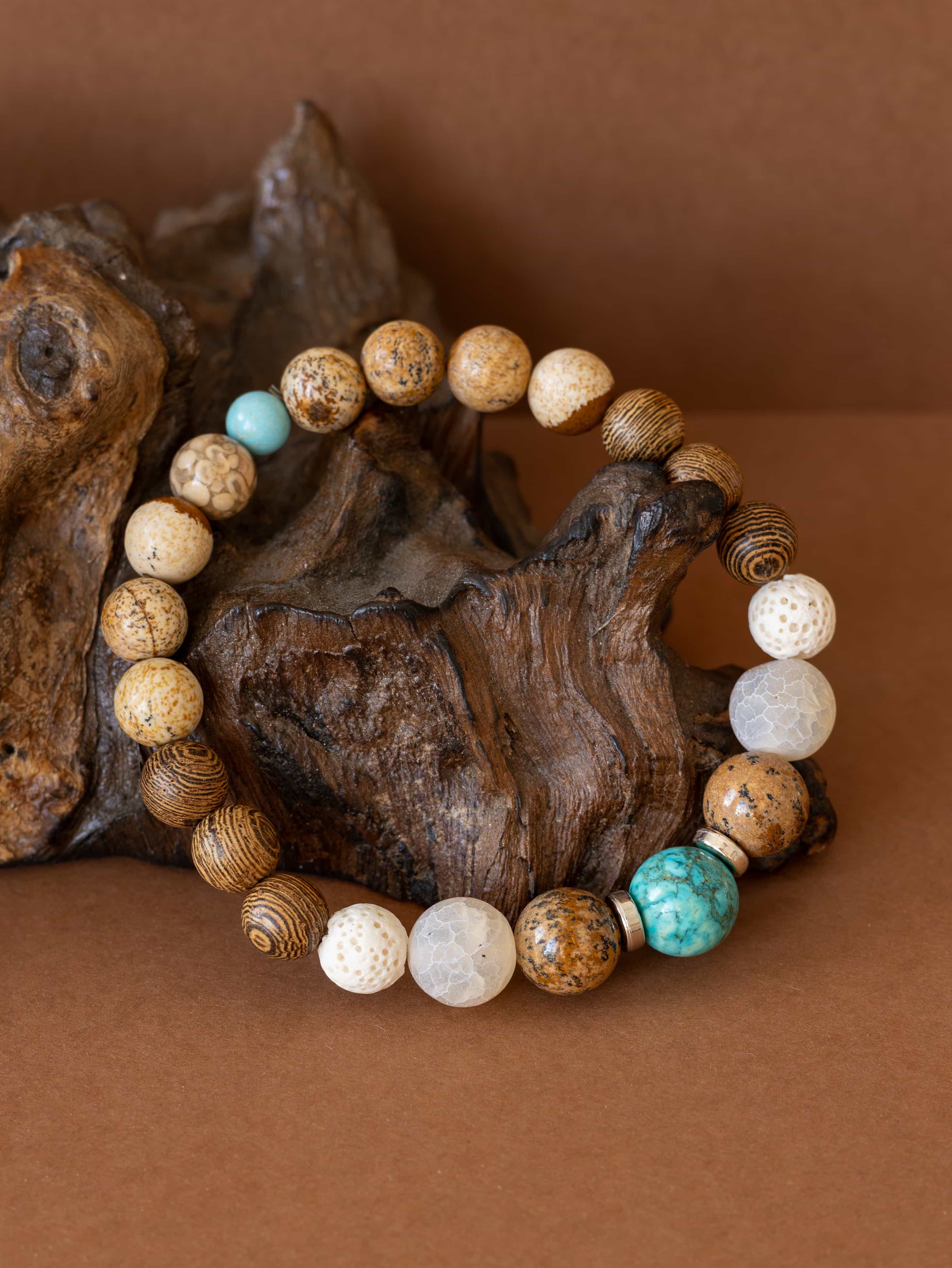Náramek MĚSÍC je navržen pro ty, kteří hledají vnitřní klid a spojení se svým cyklem a cyklem přírody. Kombinace korálků z tyrkysu, bílé lávy, jaspisu a dřeva symbolizuje uzemnění, rovnováhu a propojení s cykly měsíce.