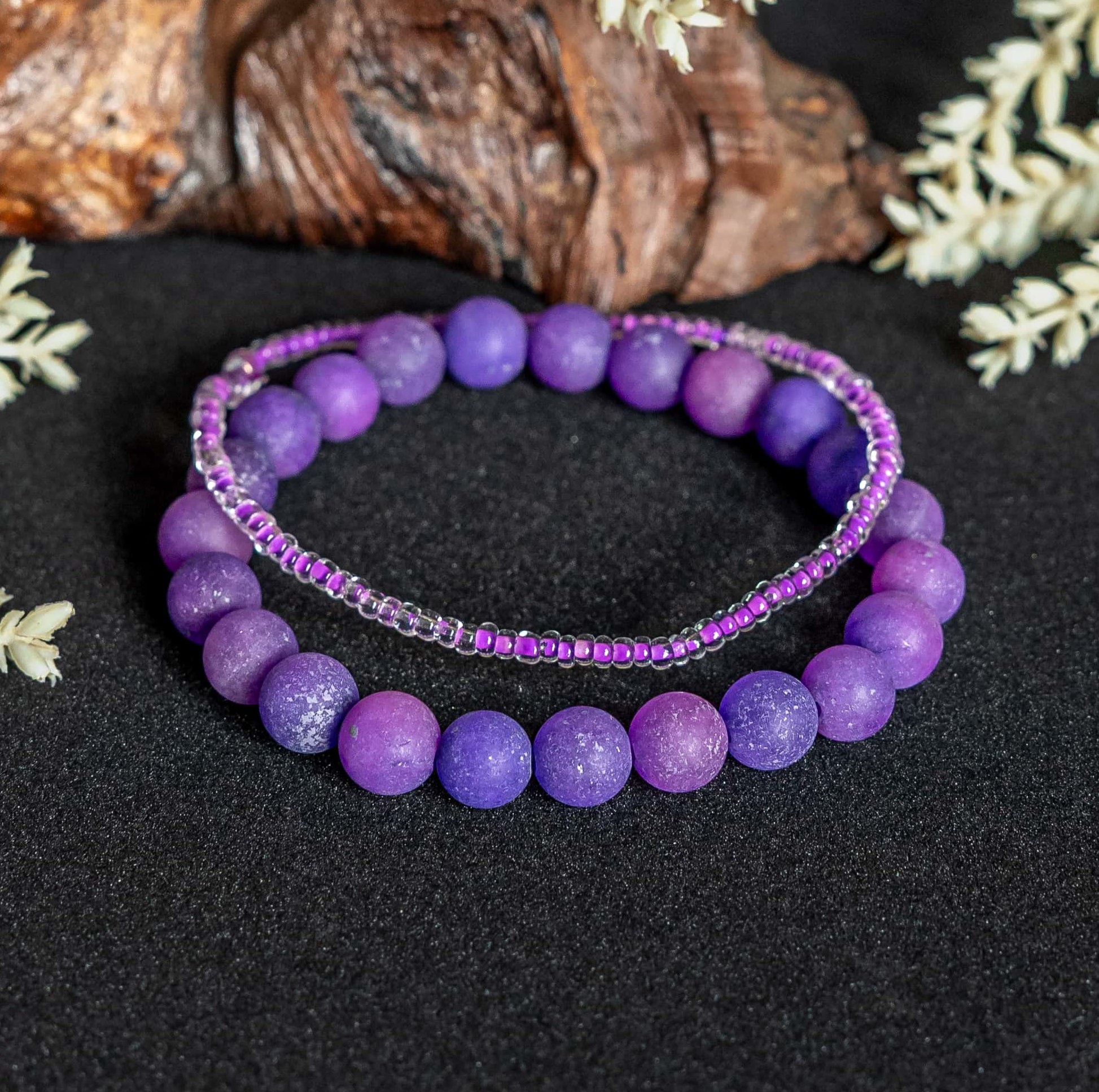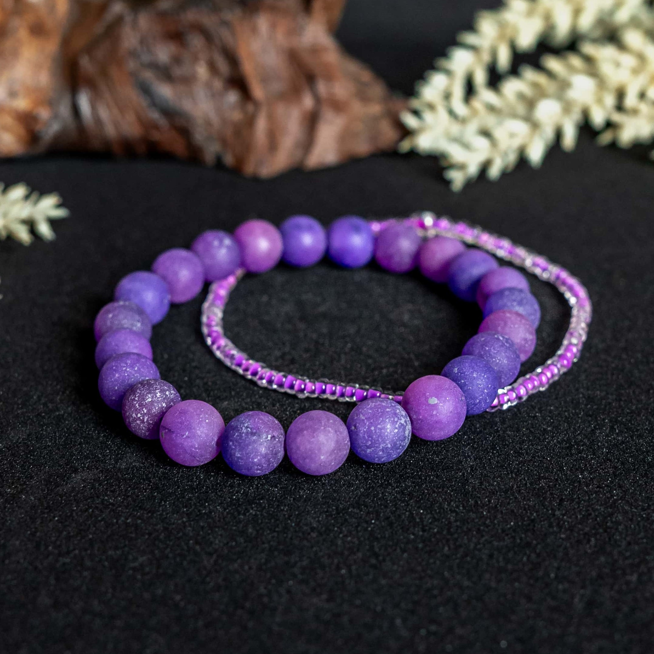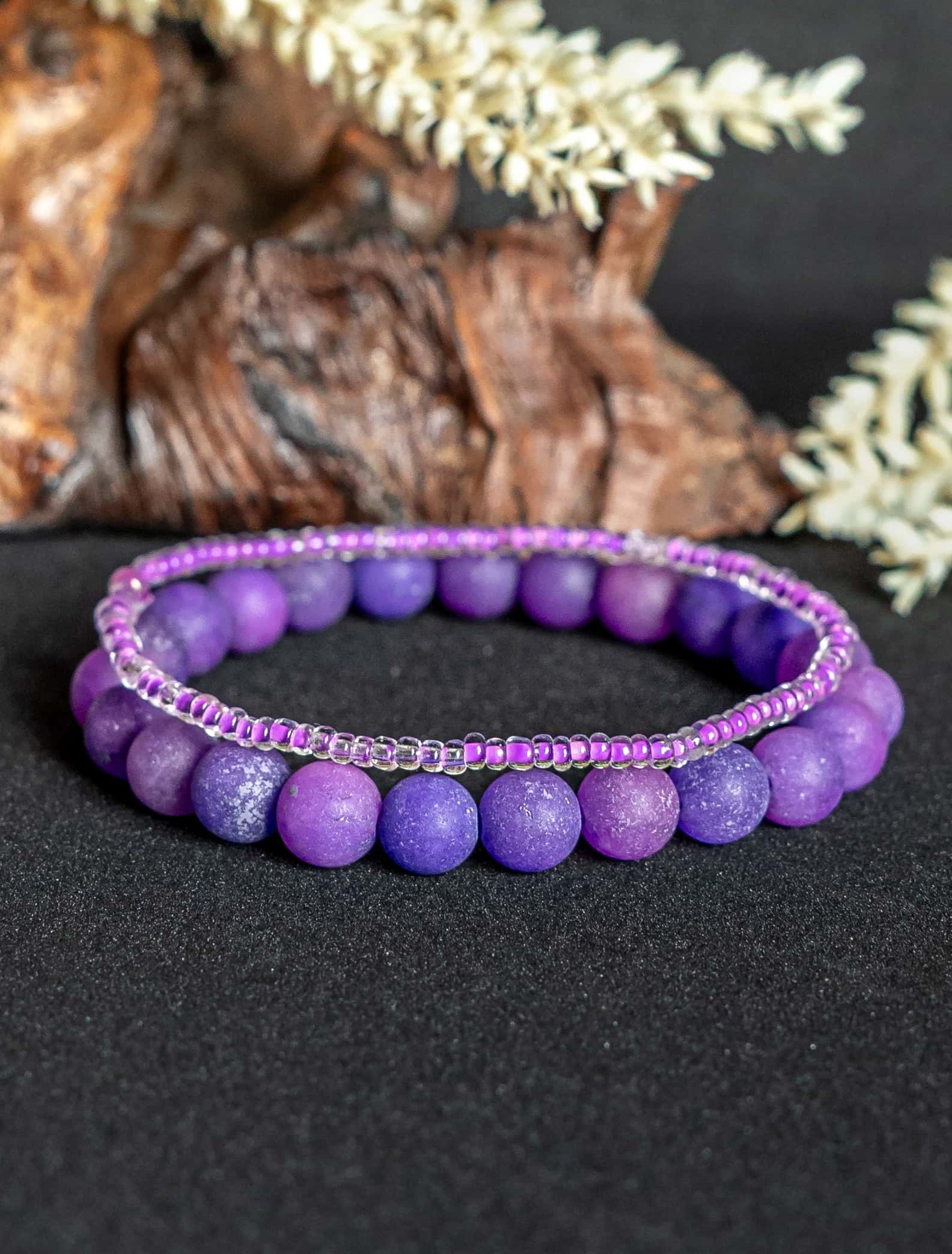 Druhý náramek, složený z jemných rokajlových korálků v něžné fialkové barvě, přináší do setu lehkost a hravost. Společně tvoří harmonický celek, který je zároveň výrazný i jemný.