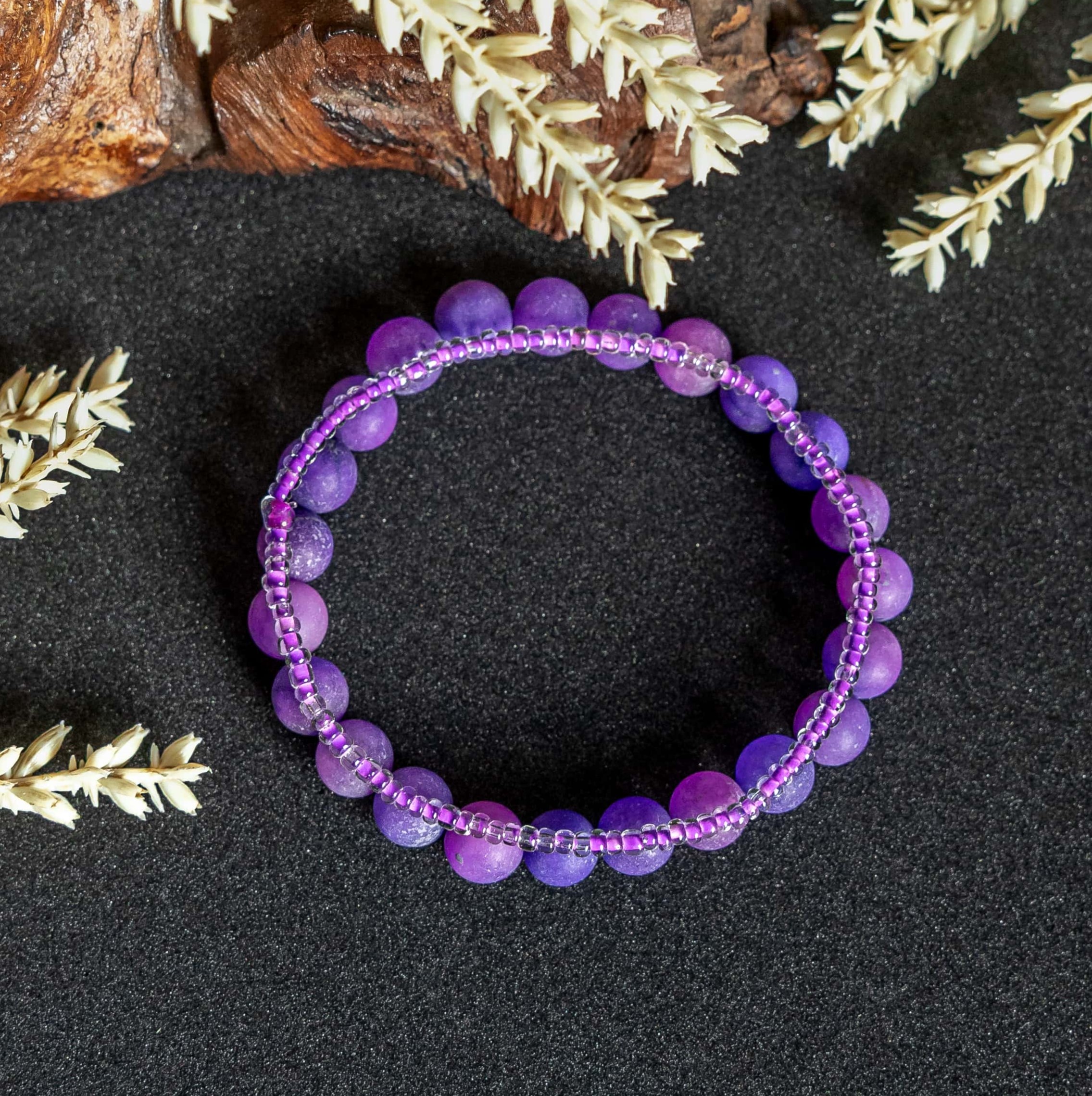 První náramek, vytvořený z fialového achátu, symbolizuje duchovní sílu, klid a intuici. Achát je známý jako kámen rovnováhy, který podporuje soustředění, ochrany a emoční stability.