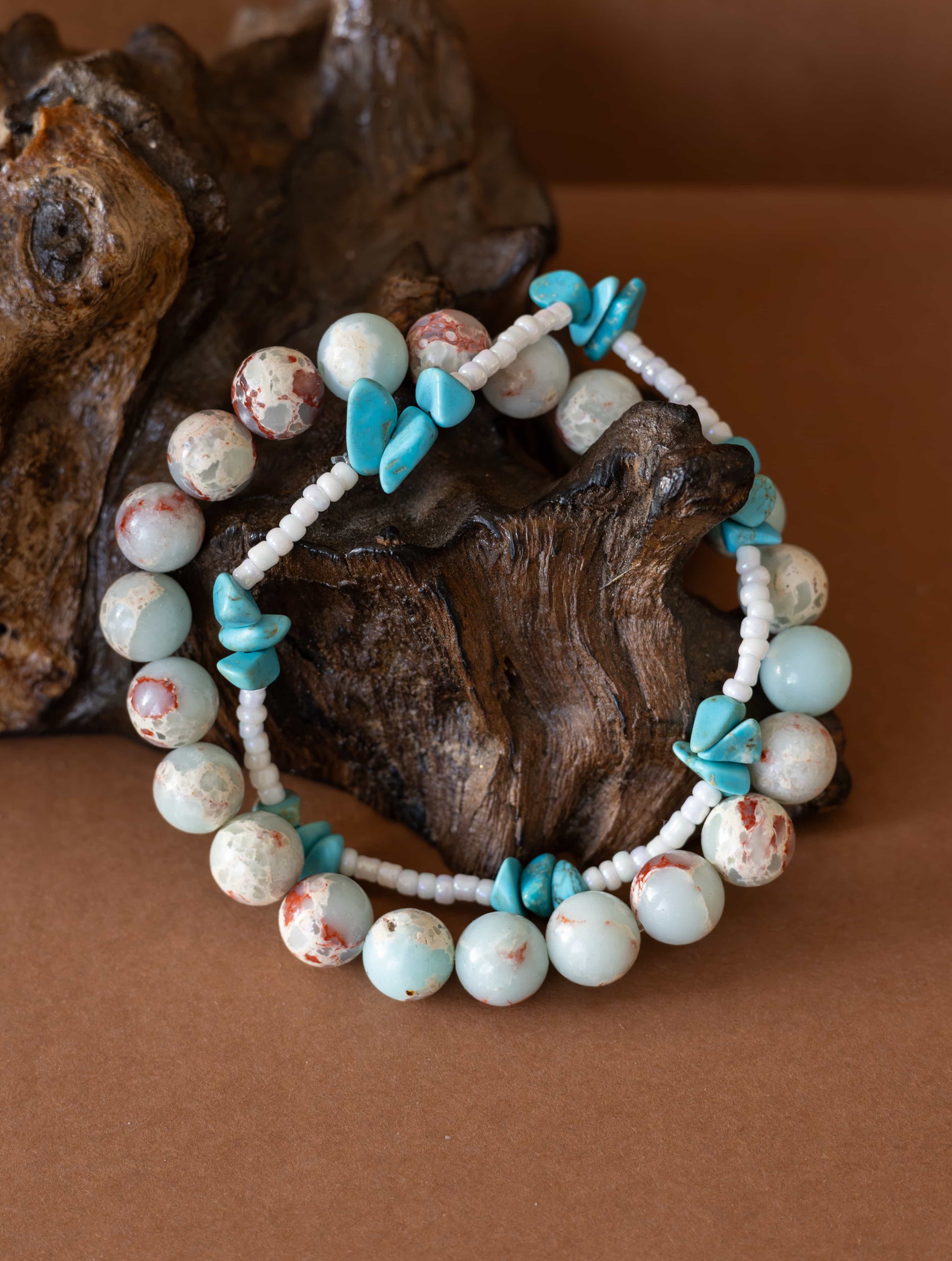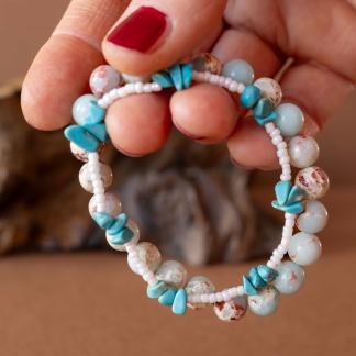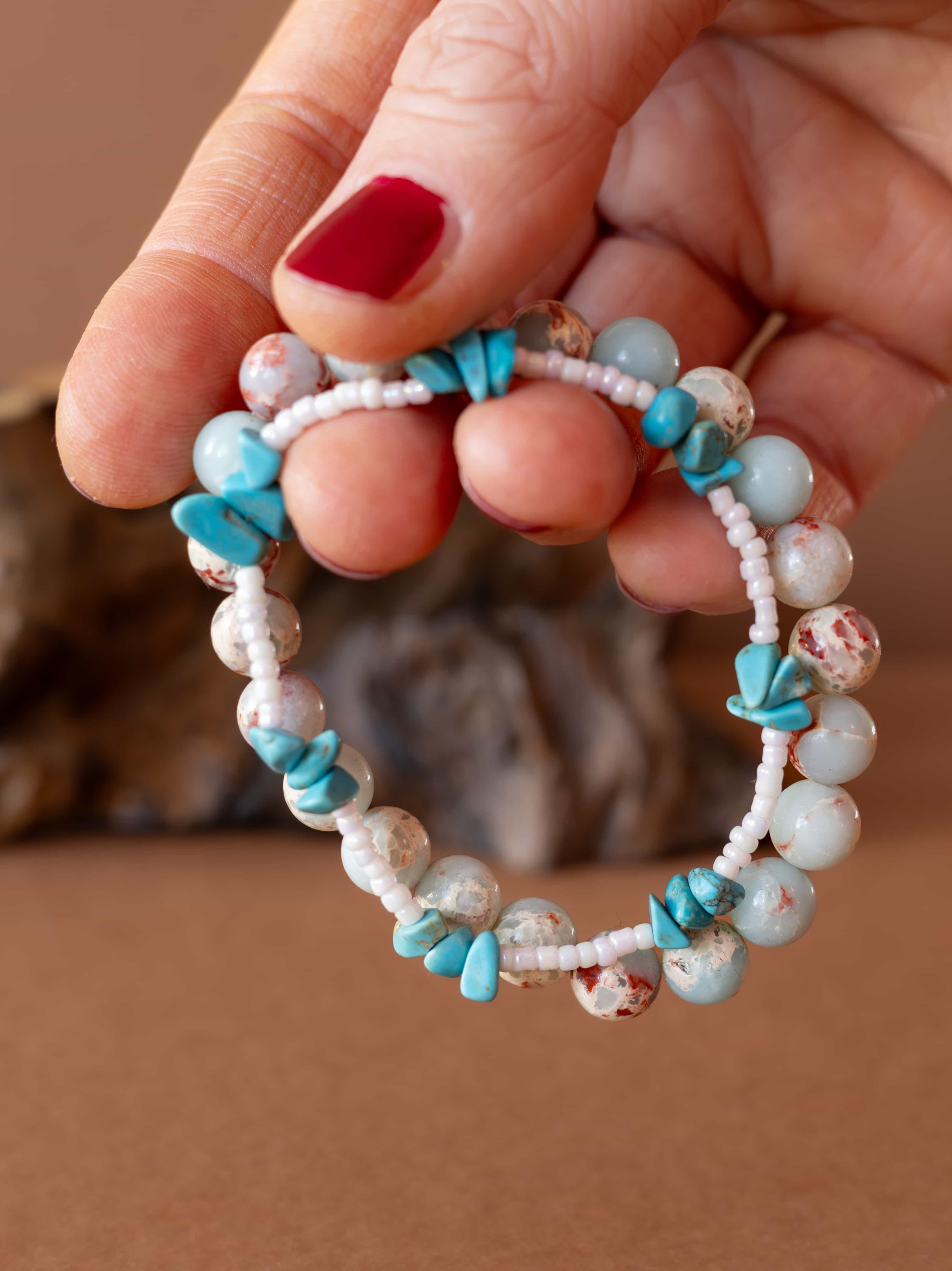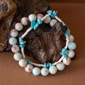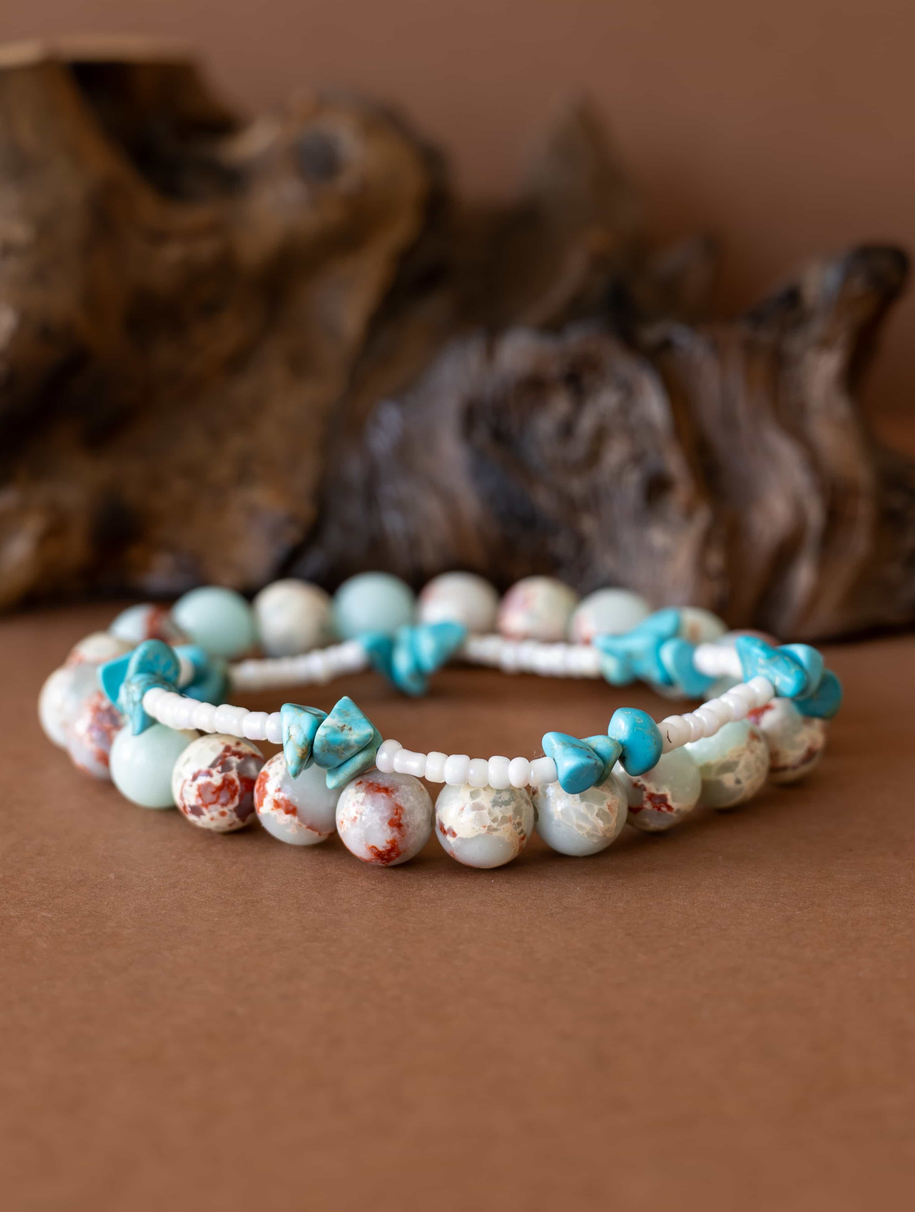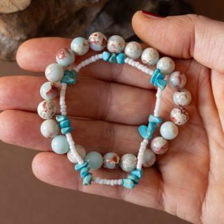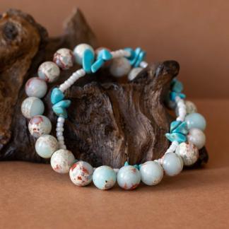 Set Příliv zachycuje energii moře a země v dokonalé rovnováze. Spojuje teplé tóny jaspisu imperial s jemností bílých rokajl korálků a osvěžujícími úlomky tyrkysu, které připomínají šumění vln a klidnou hladinu oceánu.