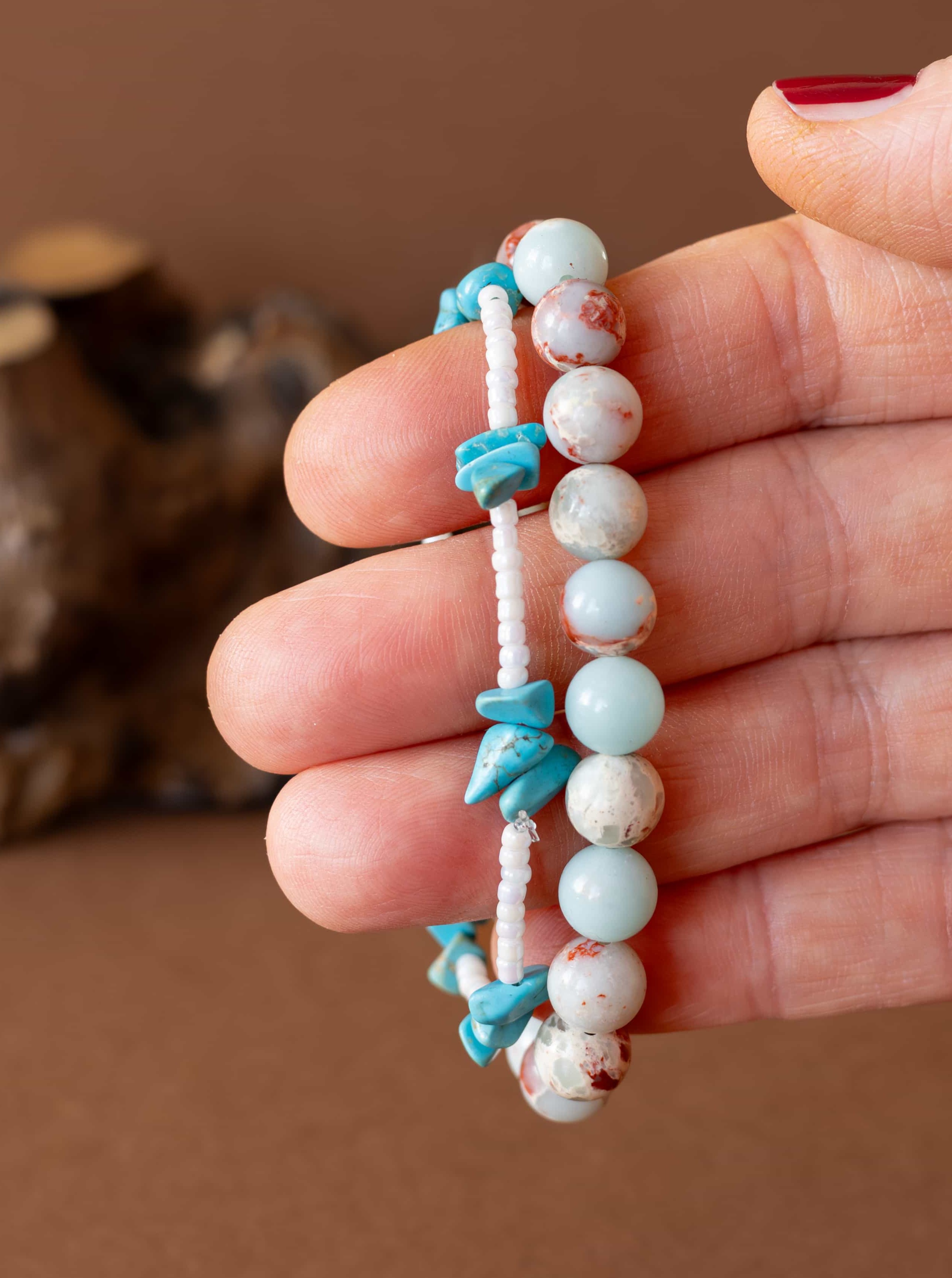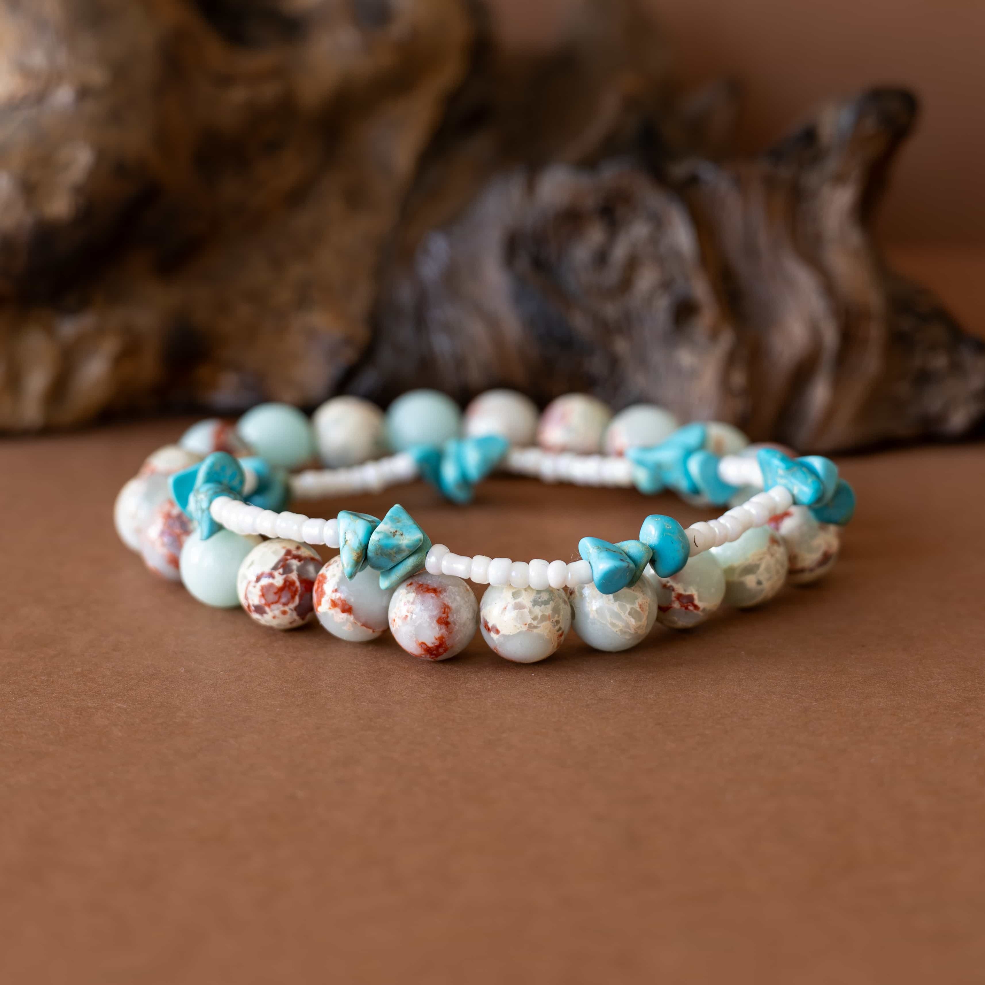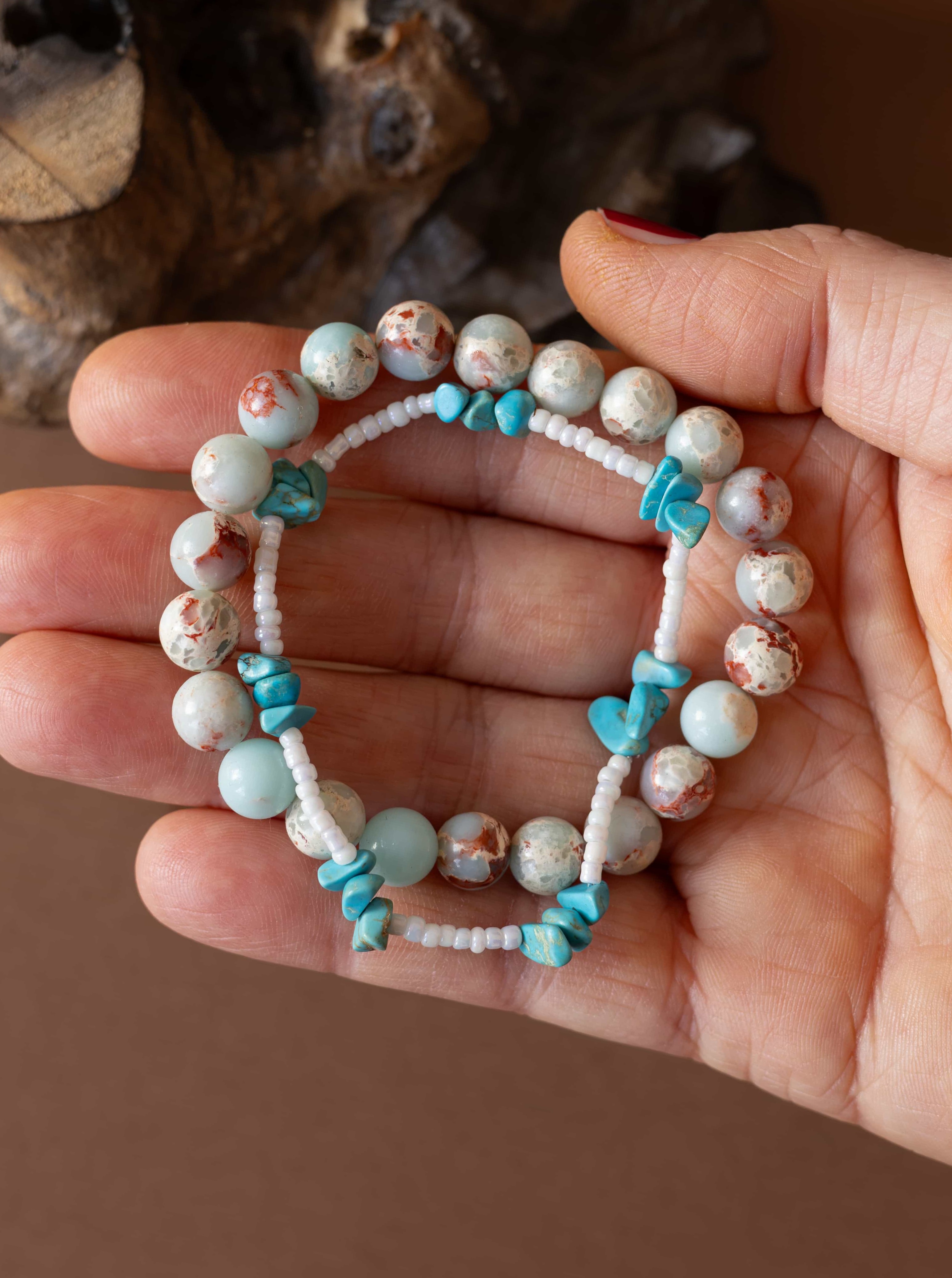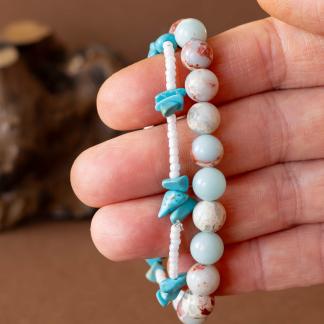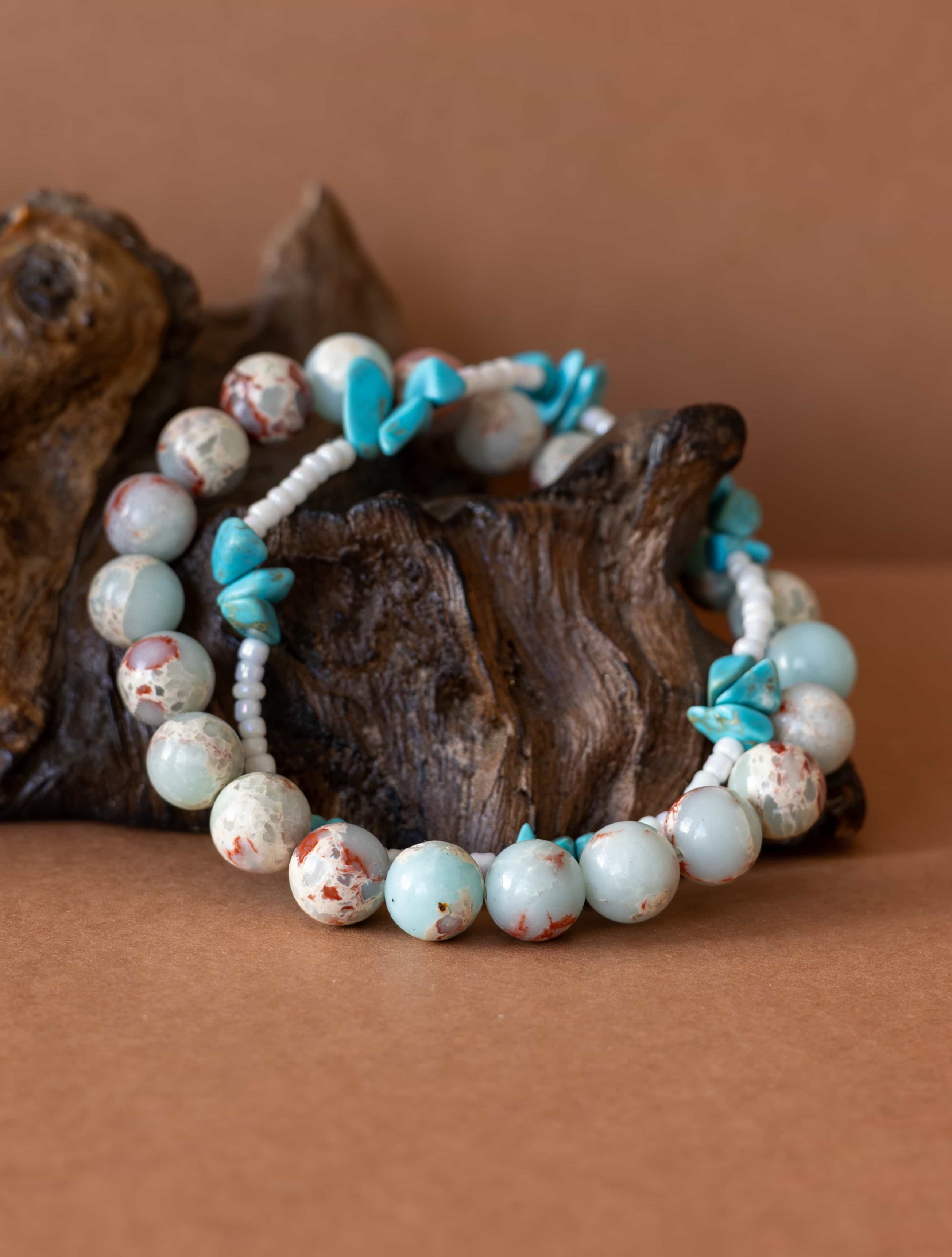 Set Příliv zachycuje energii moře a země v dokonalé rovnováze. Spojuje teplé tóny jaspisu imperial s jemností bílých rokajl korálků a osvěžujícími úlomky tyrkysu, které připomínají šumění vln a klidnou hladinu oceánu.
