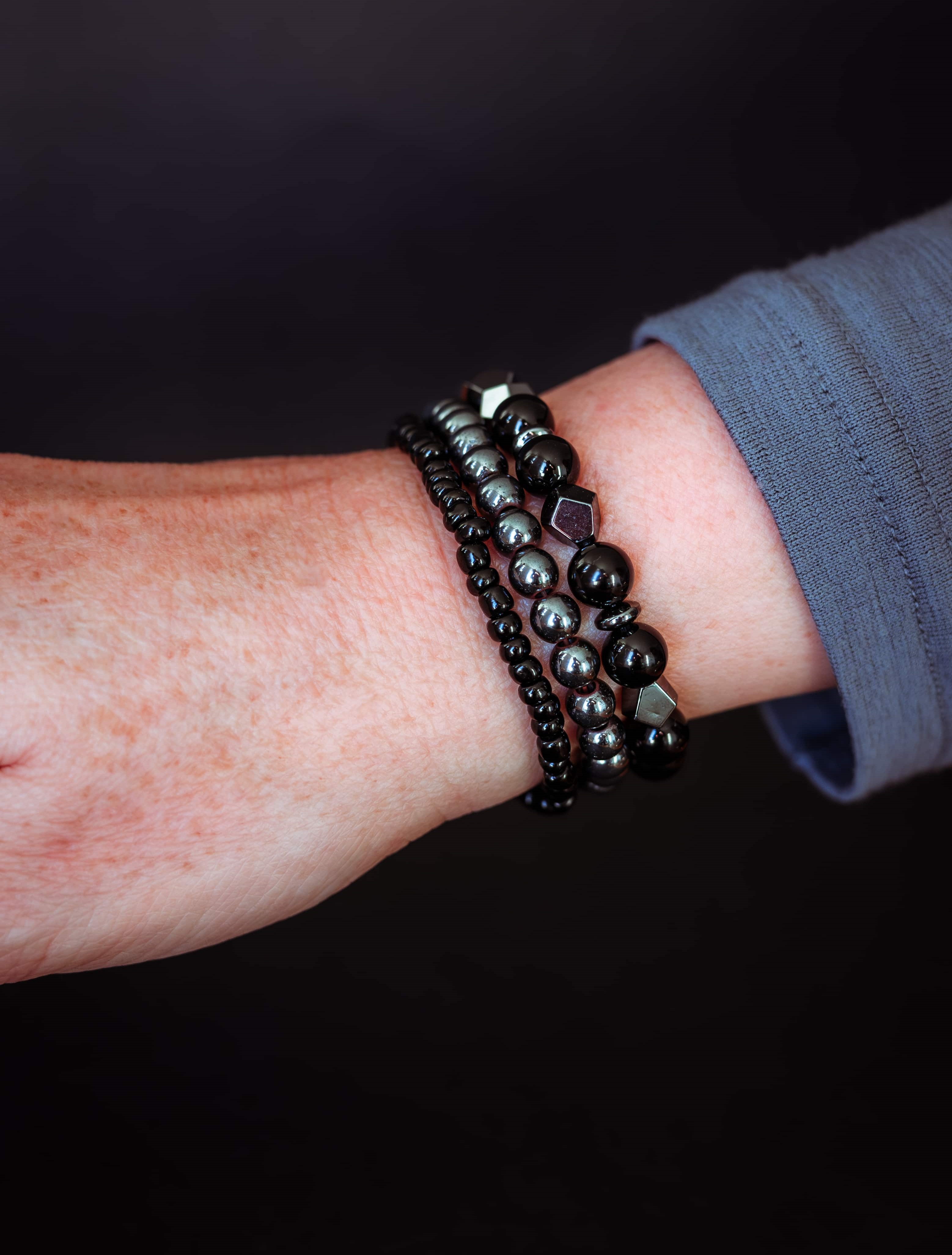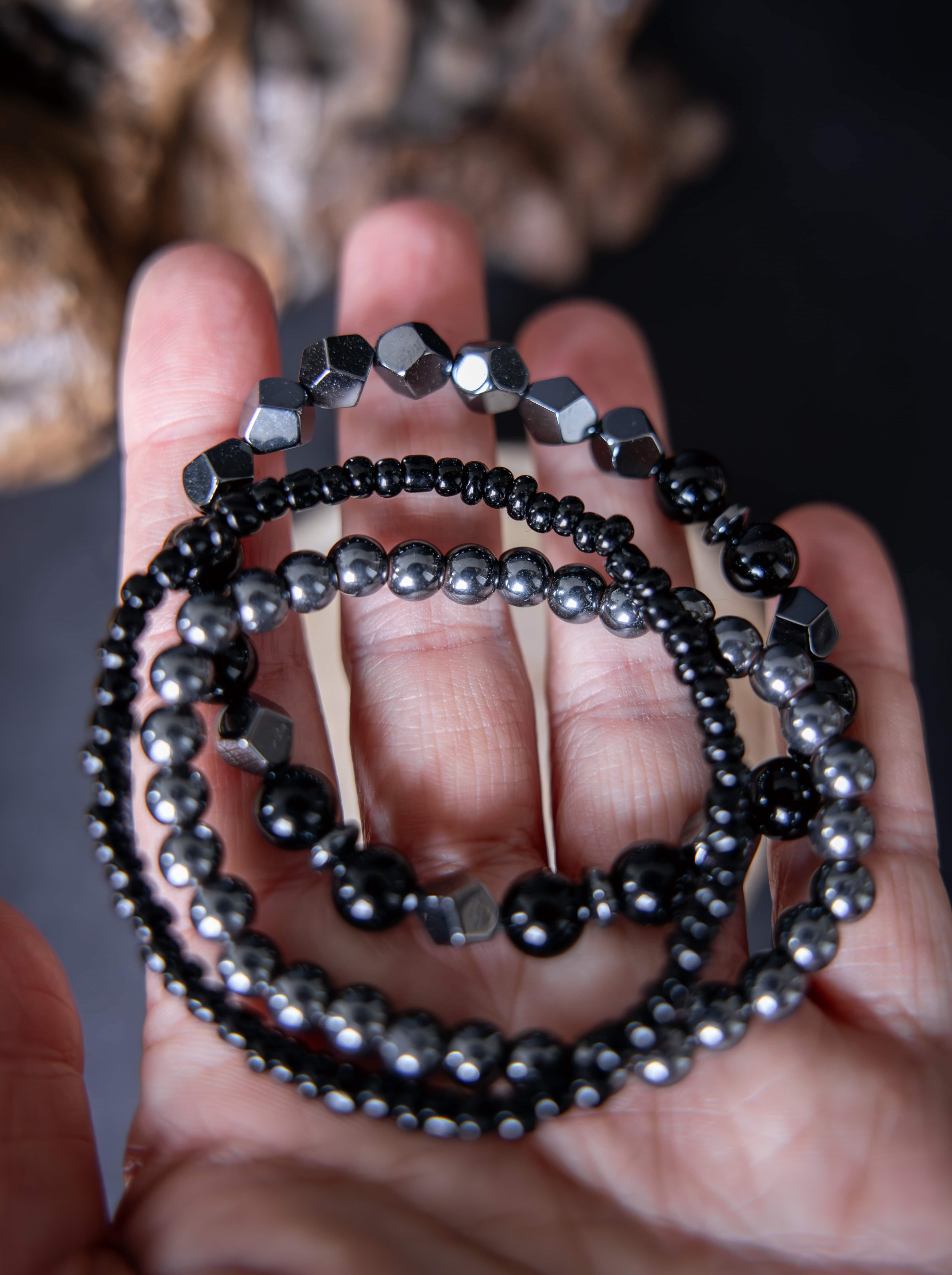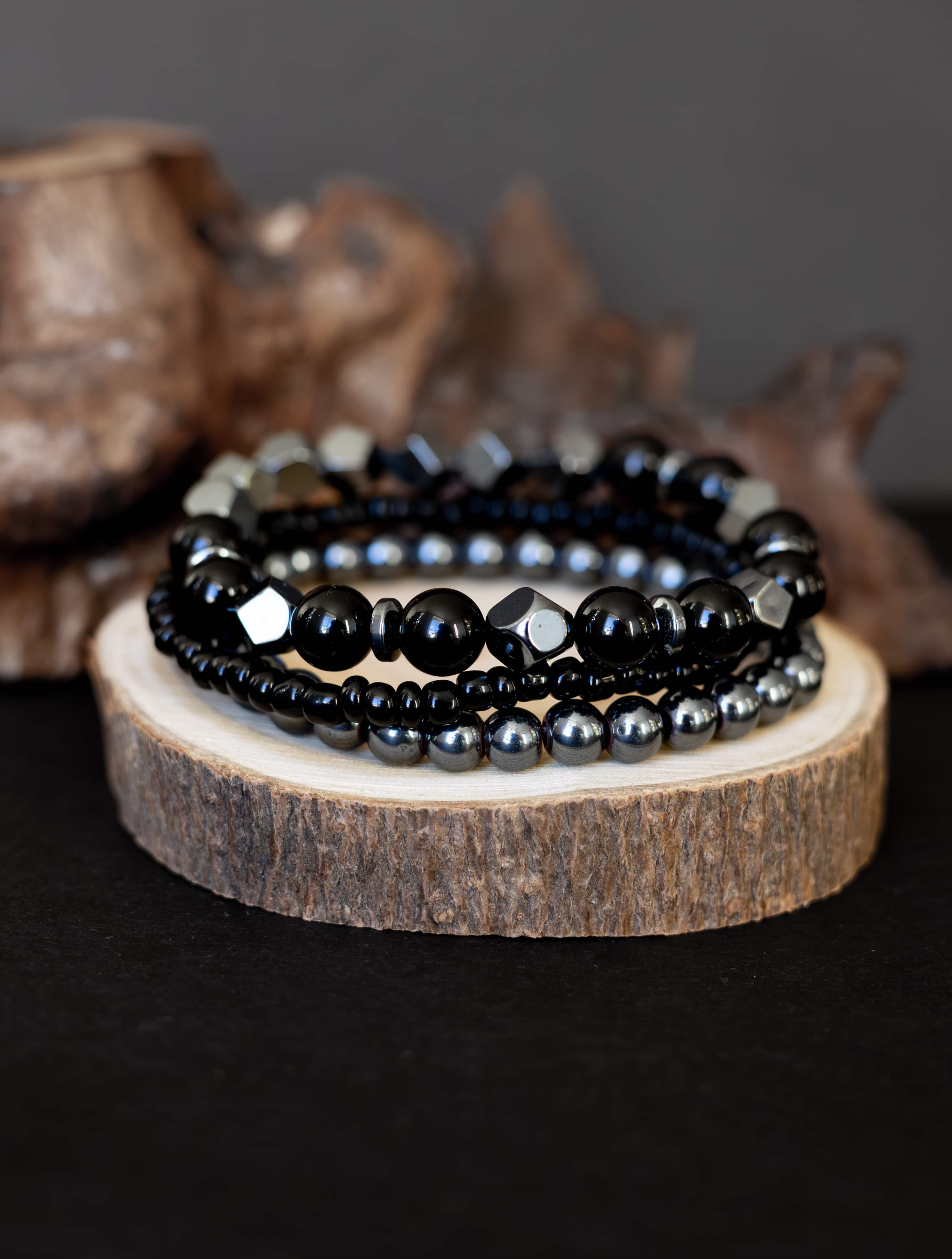 Jeden náramek je tvořen černými rokajl korálky, které symbolizují jemnost a jednoduchost. Druhý náramek je z hematitových korálků, známých pro svou uzemňující energii a schopnost podporovat soustředění. Třetí náramek je kombinací korálků onyxu, kamene ochrany a vnitřní síly, a hematitu.