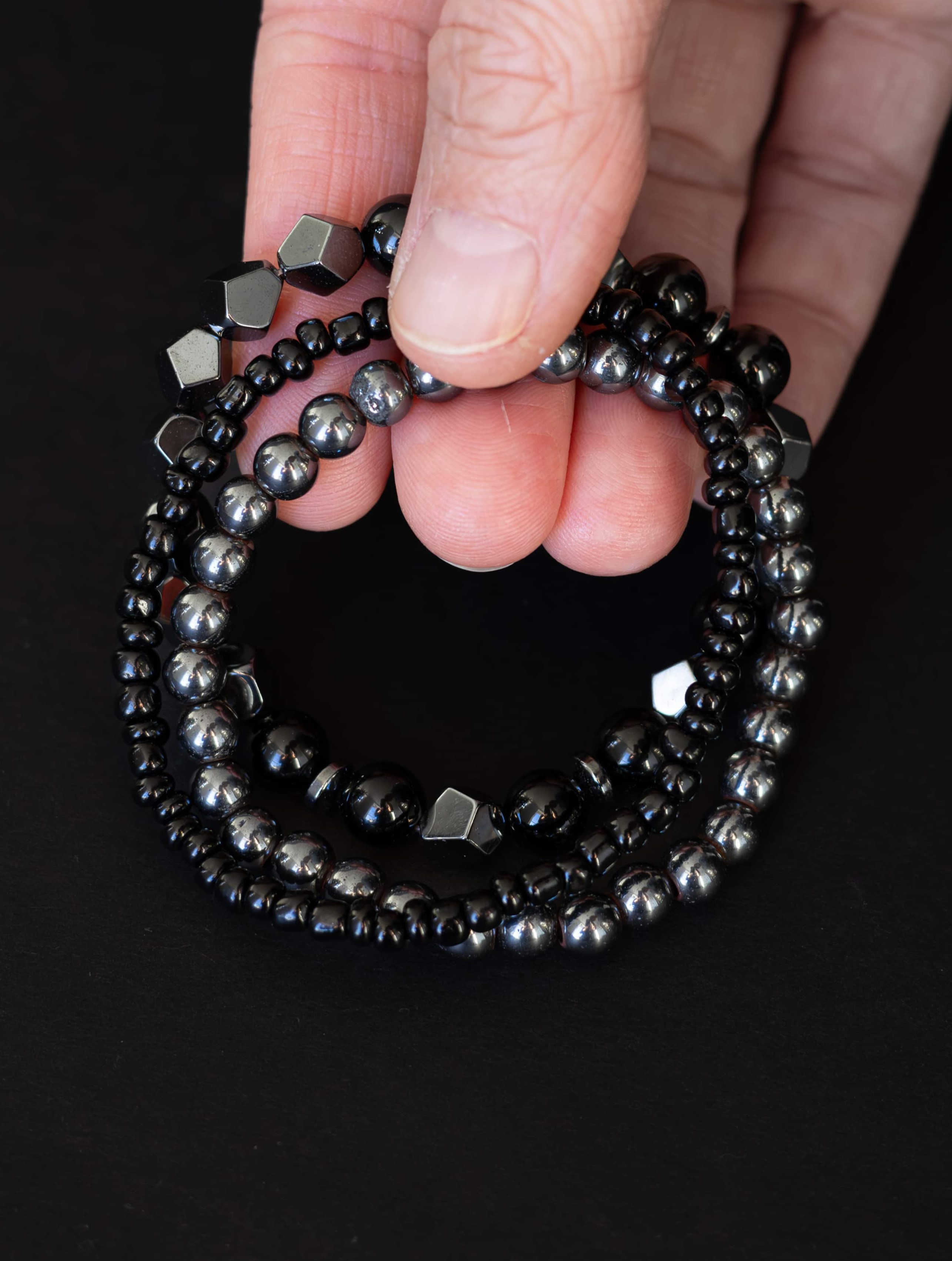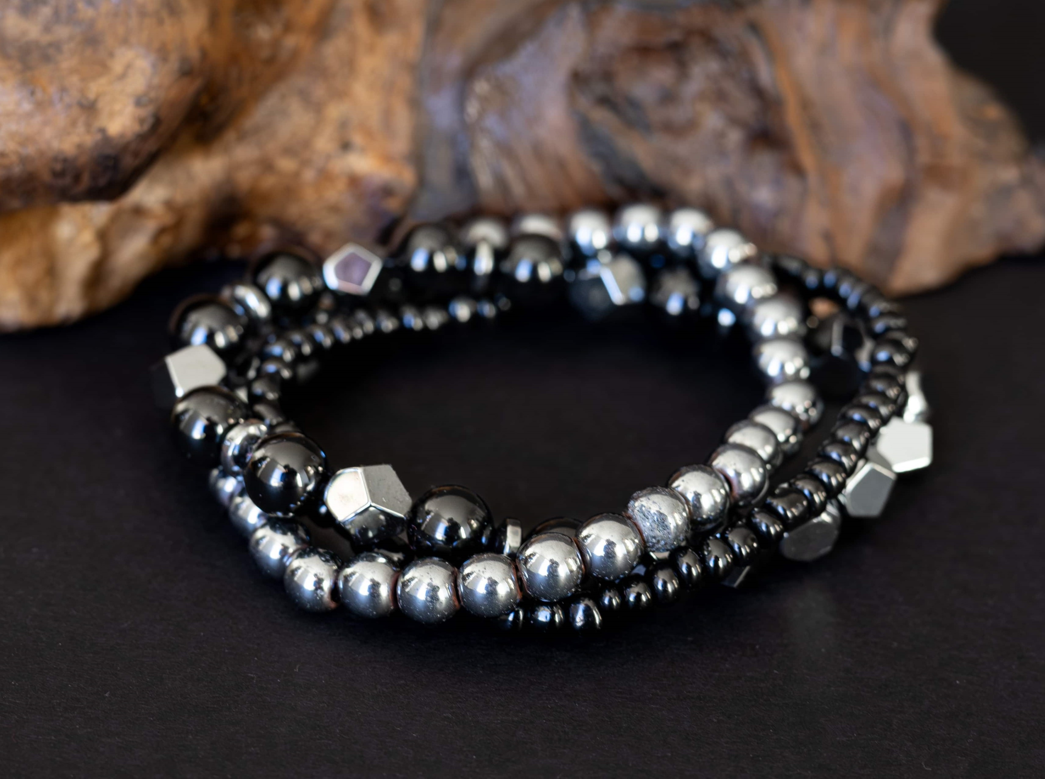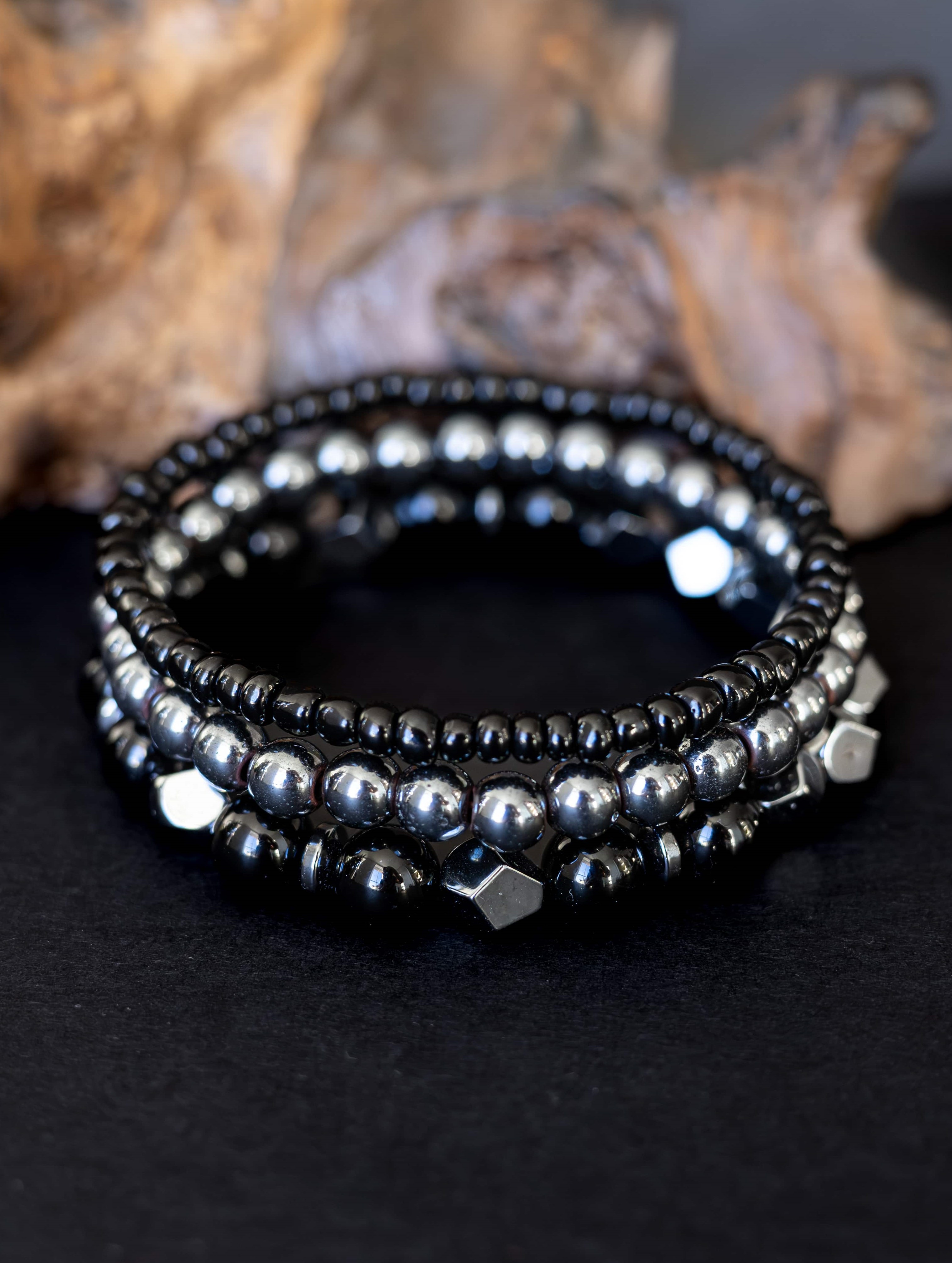 Jeden náramek je tvořen černými rokajl korálky, které symbolizují jemnost a jednoduchost. Druhý náramek je z hematitových korálků, známých pro svou uzemňující energii a schopnost podporovat soustředění. Třetí náramek je kombinací korálků onyxu, kamene ochrany a vnitřní síly, a hematitu.