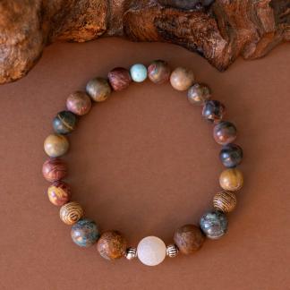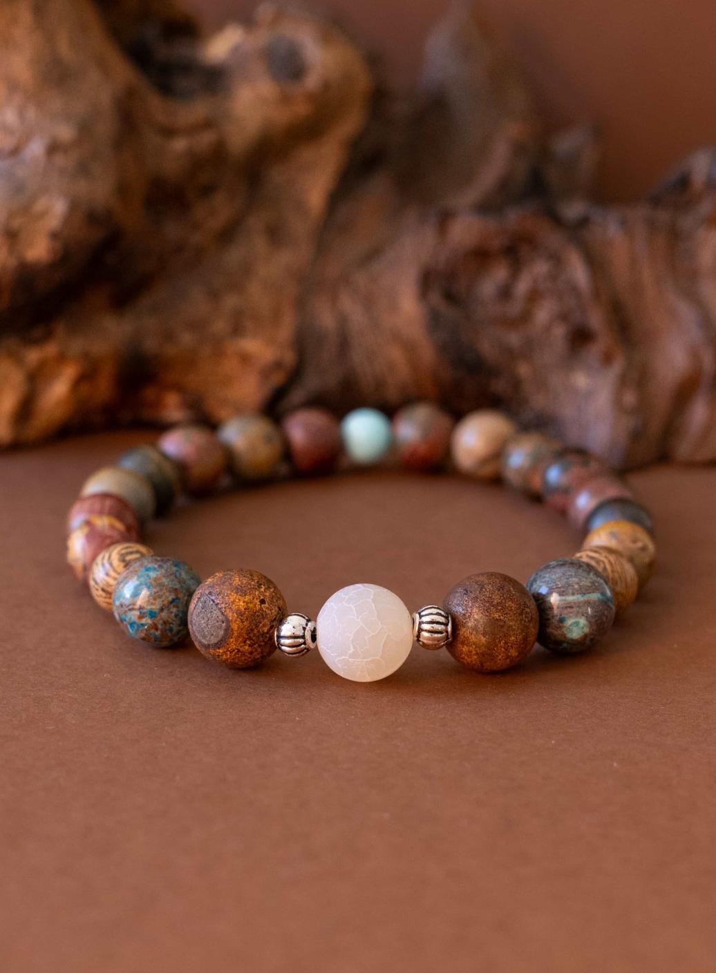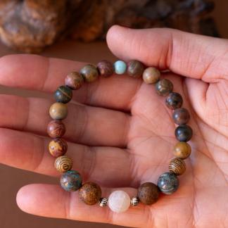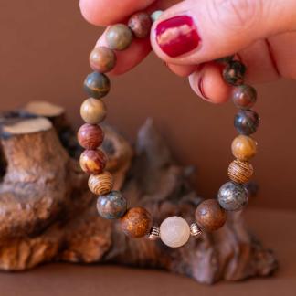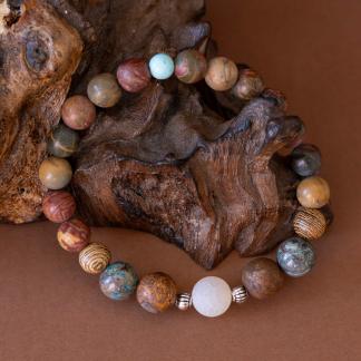 Náramek SOUZNÉNÍ je navržen pro ty, kteří hledají harmonii, vnitřní klid a spojení s přírodou, souznění se sebou a svým okolím. Kombinace korálků jaspisu picasso, tyrkysu, achátu a dřeva symbolizuje uzemnění, rovnováhu, harmonii a propojení s elementy země a vody.
