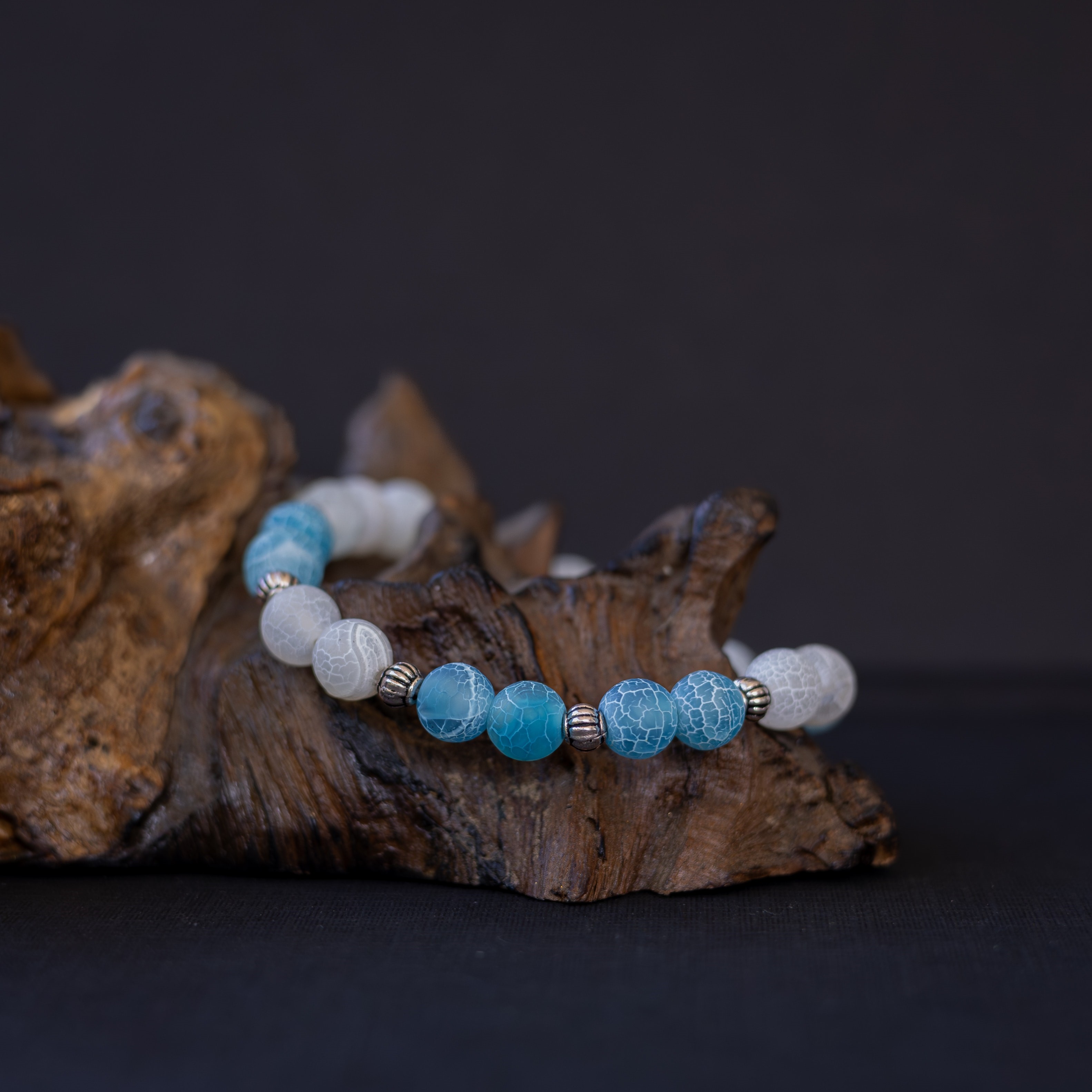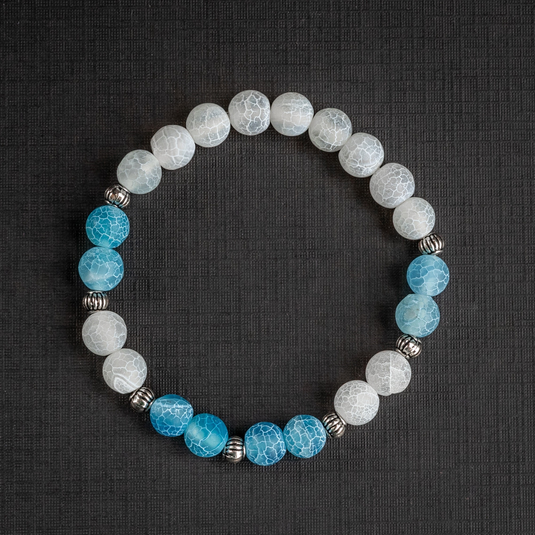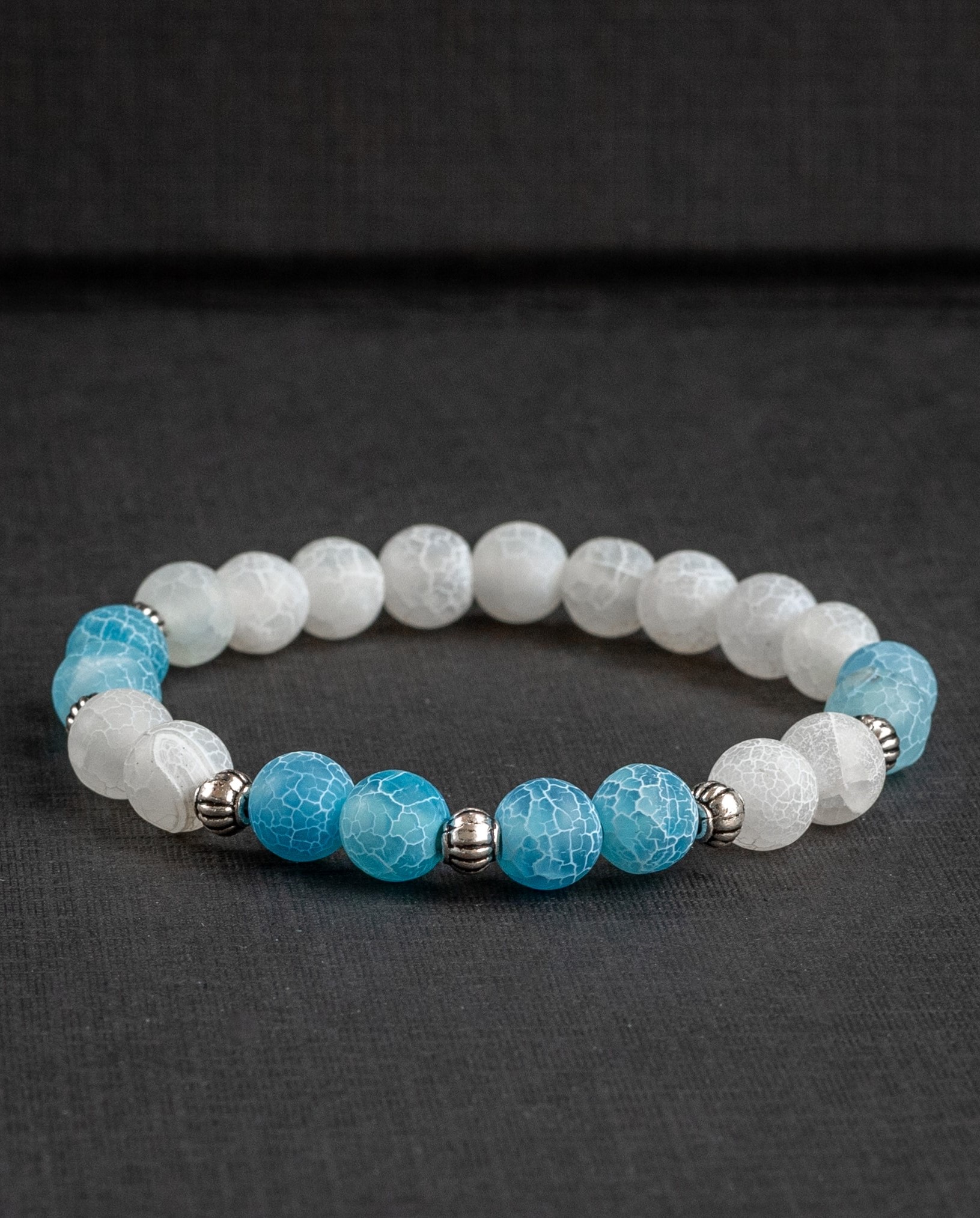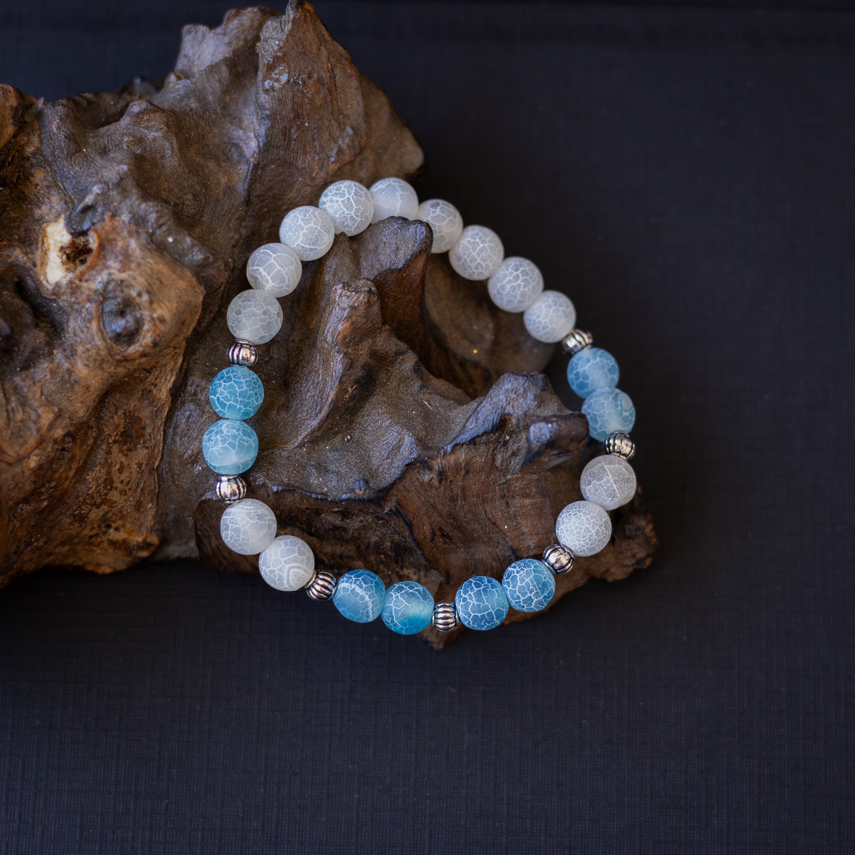 Elegantní dámský náramek z korálků bílého a modrého achátu je stvořen pro ženy, které chtějí vyzařovat klidnou sílu a jemnou eleganci v každé situaci.