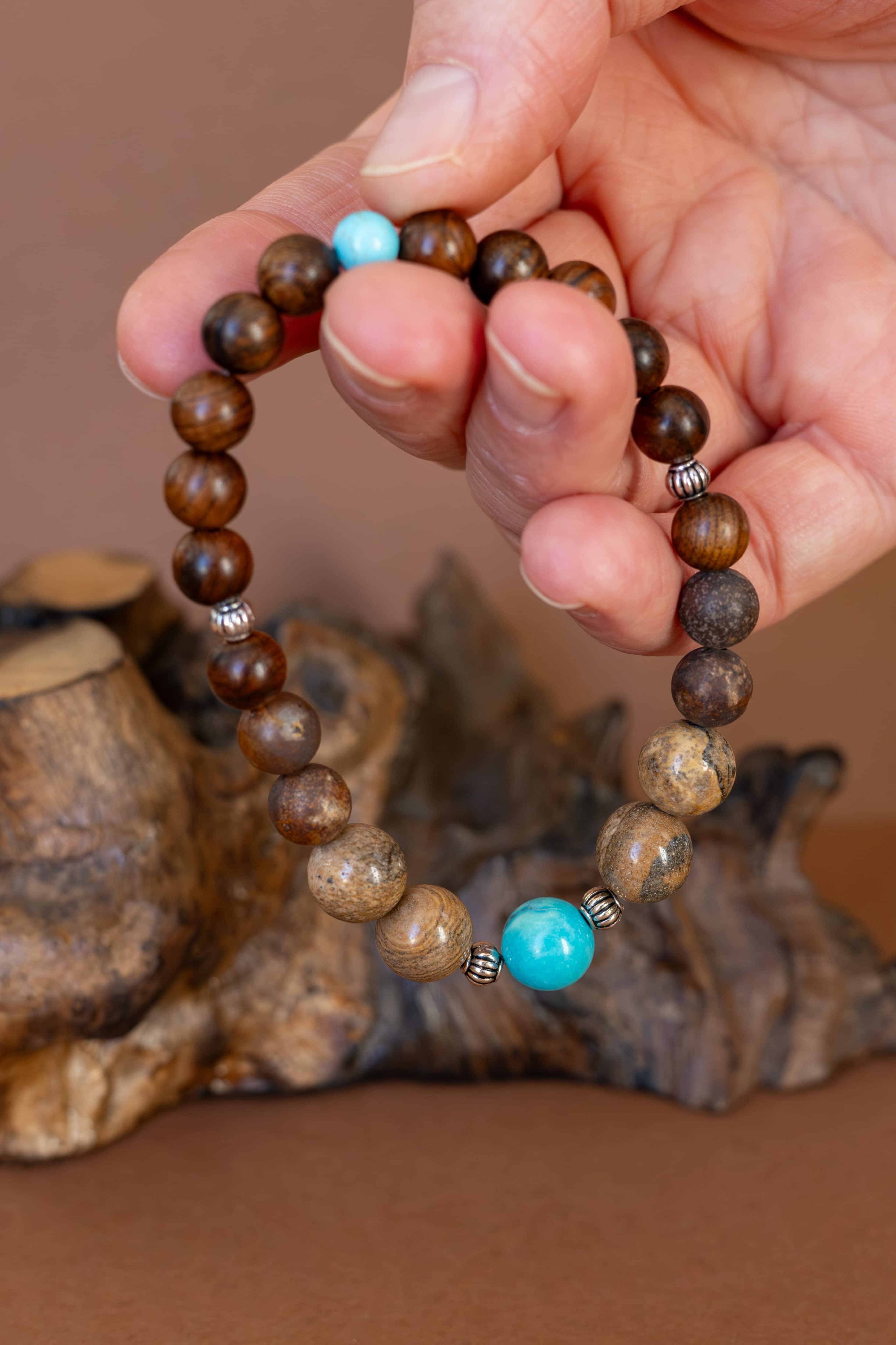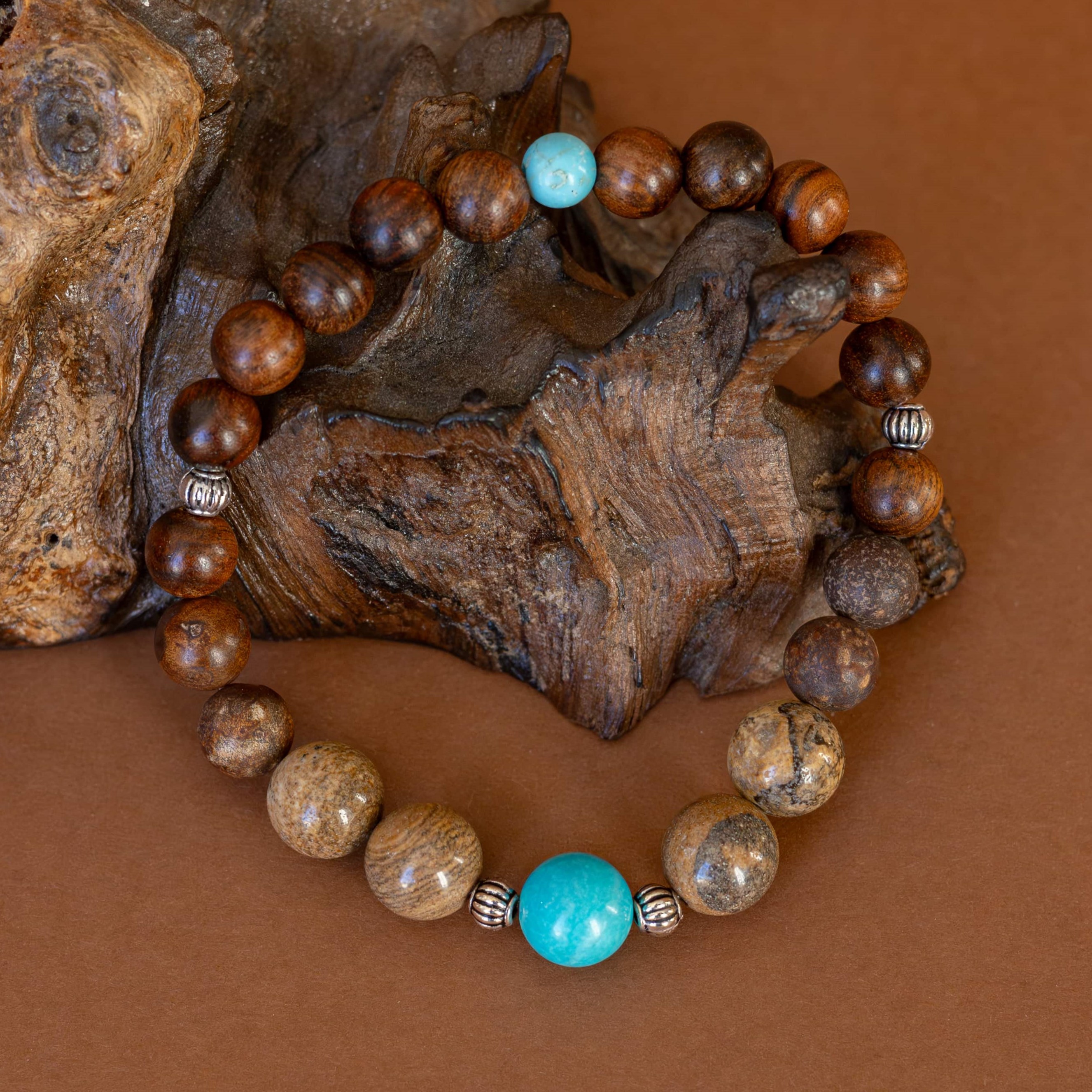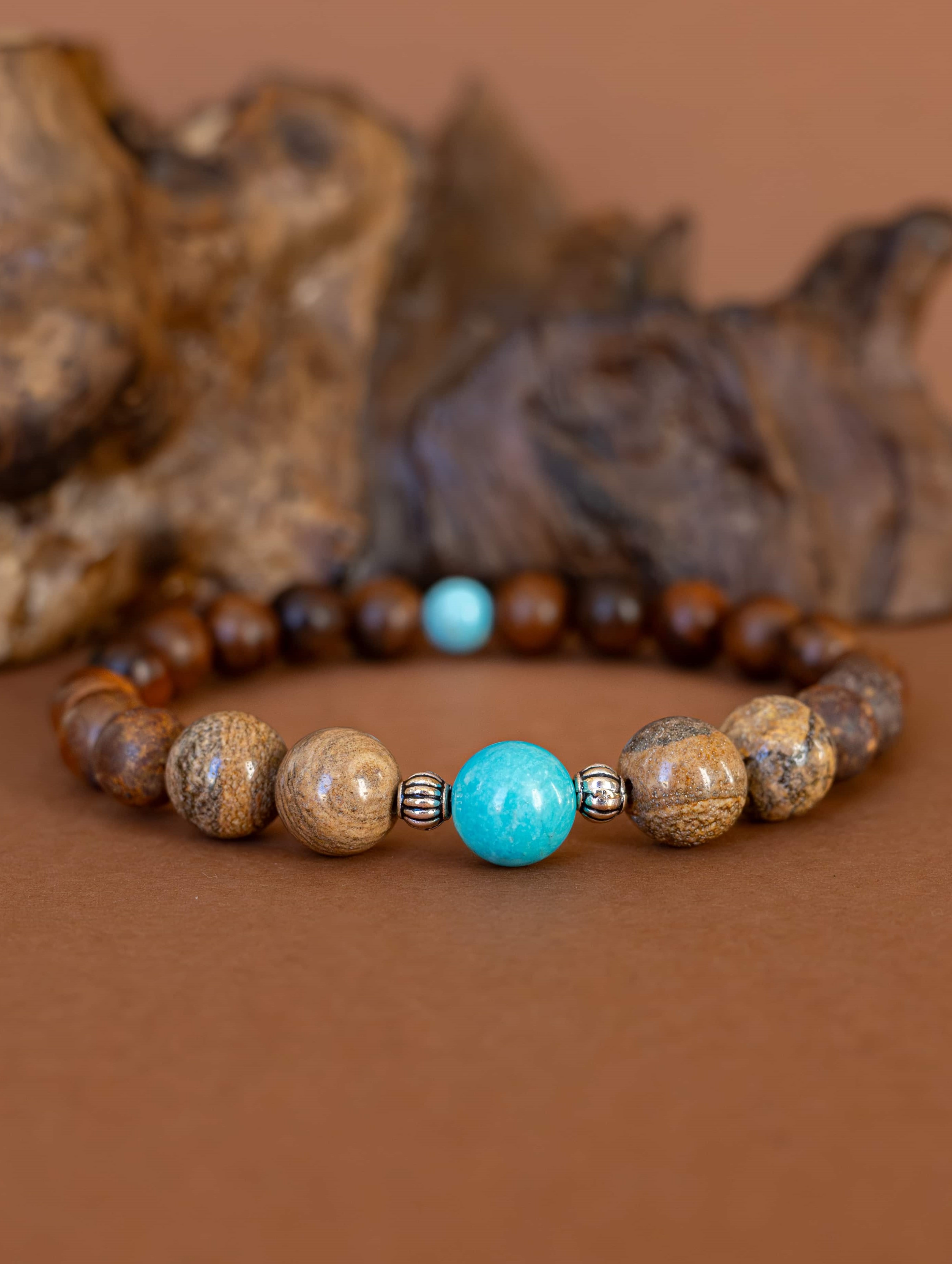 Náramek ZEMĚ je navržen pro ty, kteří hledají pevný základ, vnitřní klid a spojení s přírodou. Kombinace korálků z tyrkysu, jaspisu a dřeva symbolizuje uzemnění, rovnováhu a propojení s elementy země.