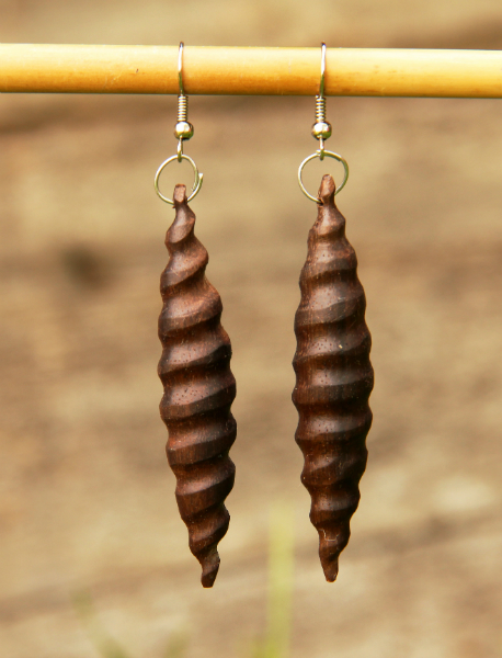 Náušnice z lehkého tropického dřeva v přírodně tmavěhnědém odstínu s bižuterním háčkem.