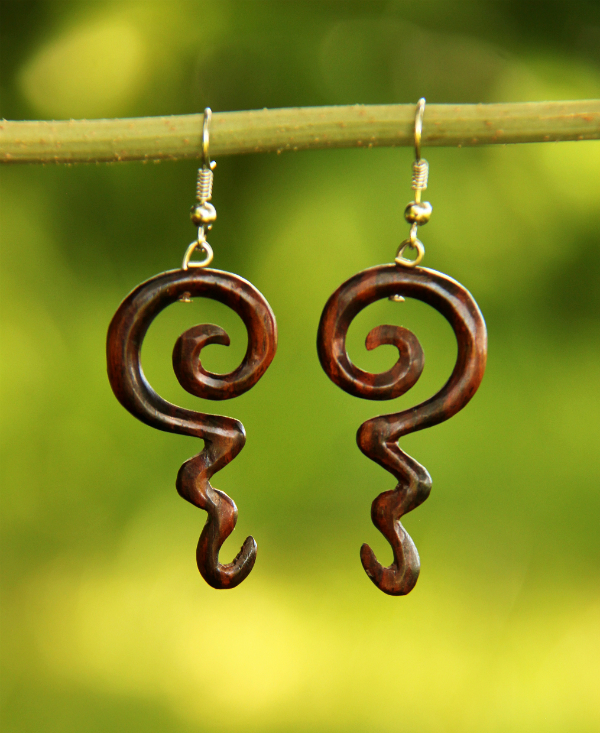 Náušnice z lehkého tropického dřeva s originálním designem v přírodním tmavěhnědém odstínu. Vhodné pro klasickou dírku v uchu.